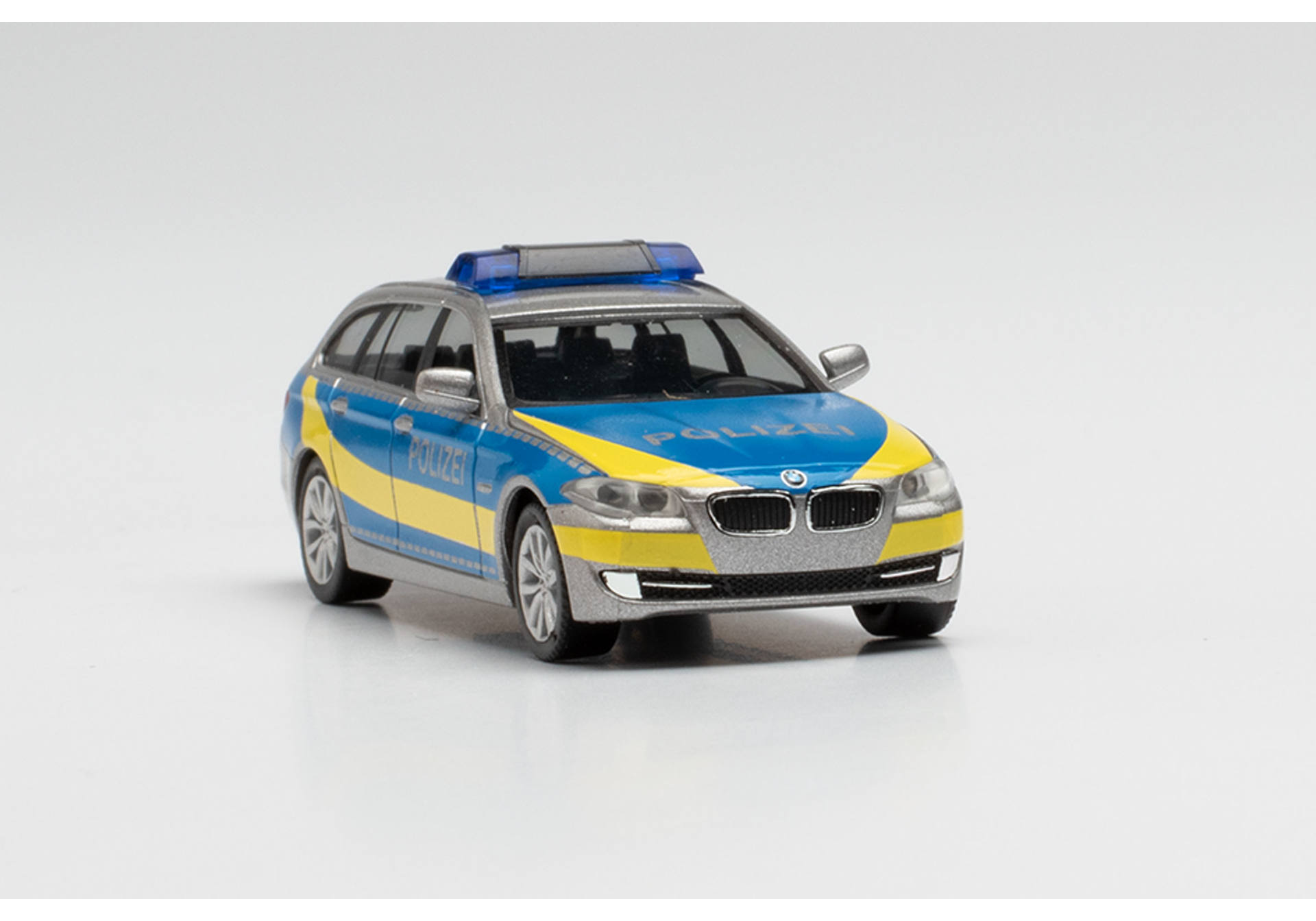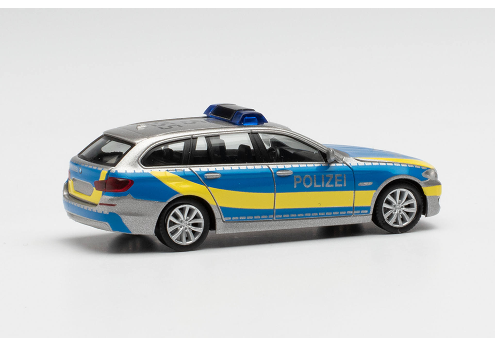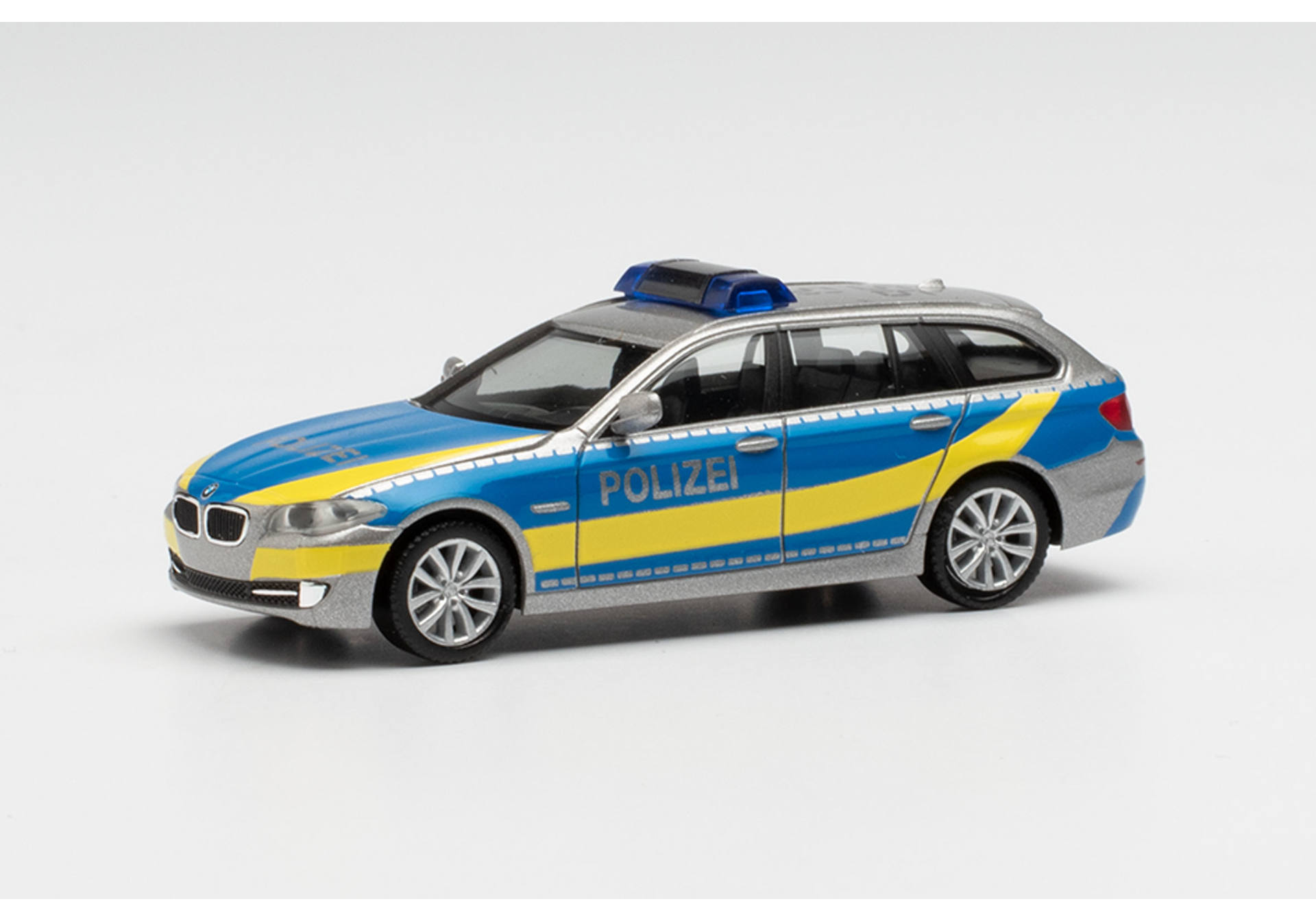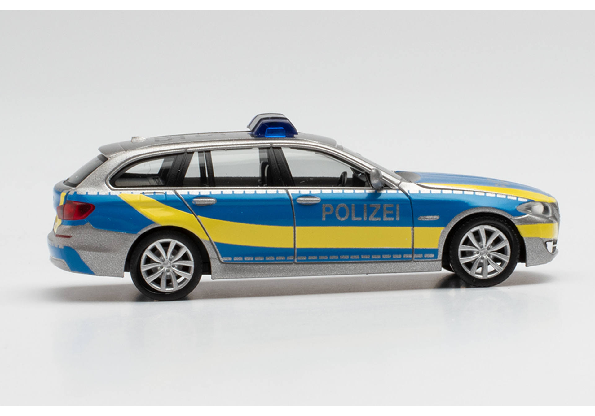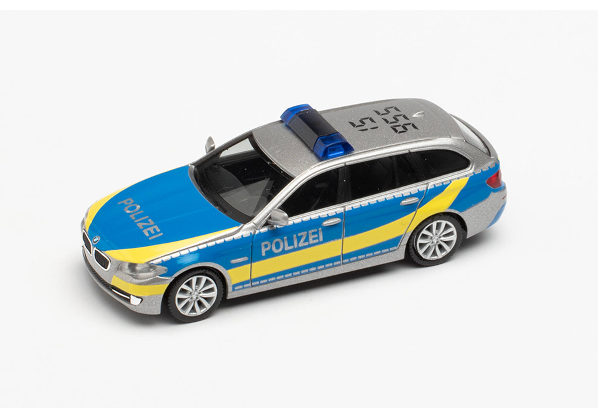 Bei der Bundespolizei wird das Vorgängermodell des aktuellen BMW 5er Touring nach wie vor eingesetzt. Mit mehr als 20 Druckvorgängen sowie einem Hella RTK 7 Warnlichtbalken wird aus dem silberfarbenen BMW 5er Touring dieses bundesweit eingesetzte Einsatzfahrzeug.