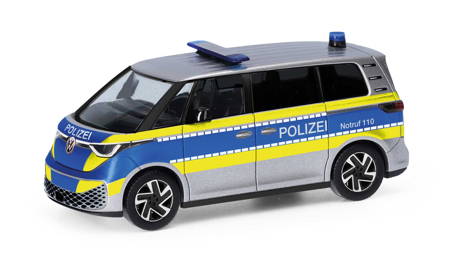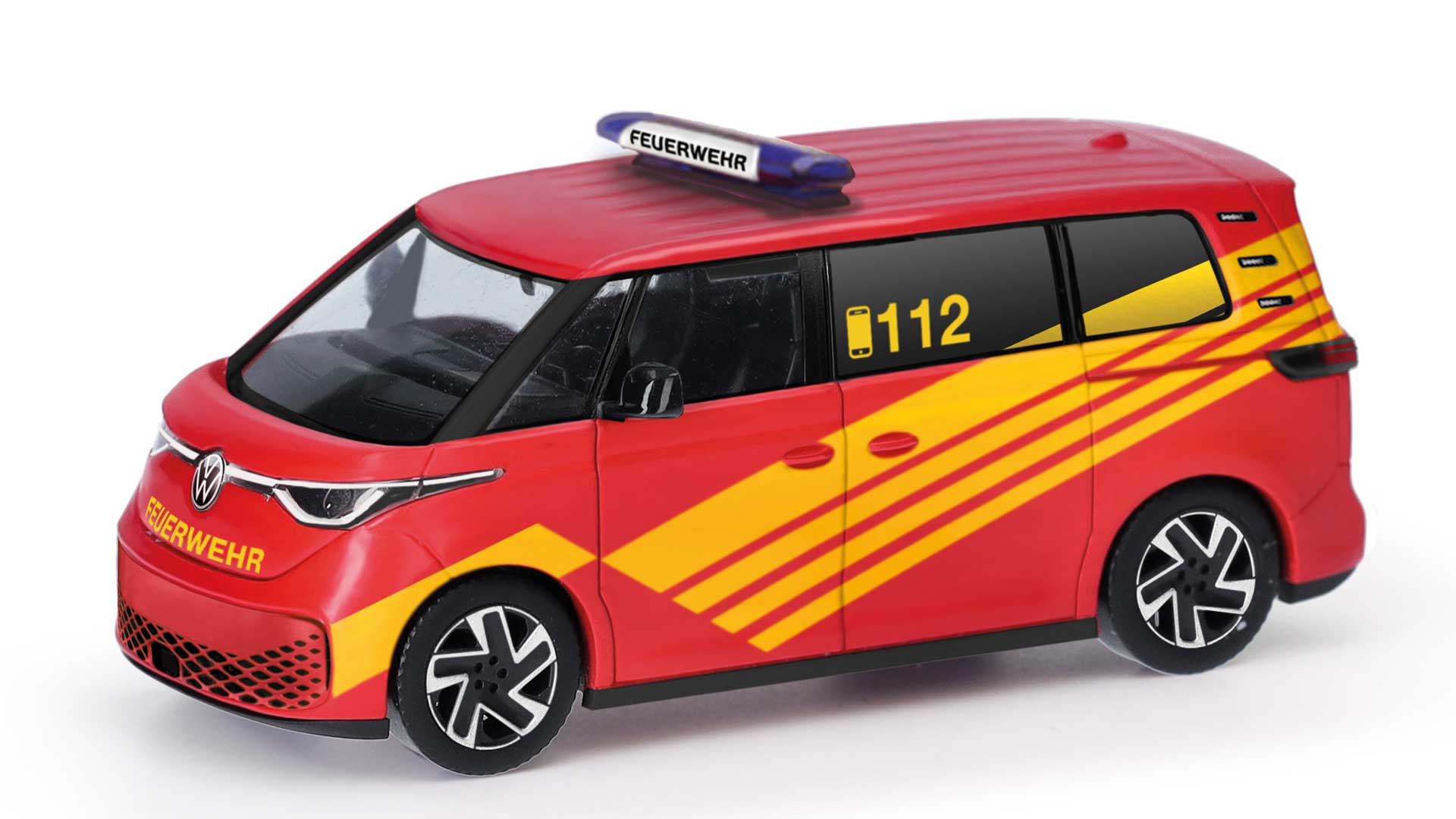 The third version is a stylish fire engine with cool decorations and a blue light bar. This is no imaginary model. In fact, there is already a fire department ID. buzz at the company fire department at Campeon (a combination of the words Campus and Infineon) in Neubiberg near Munich, used as a multi-purpose vehicle and command vehicle. This is where an electric car can offer real advantages, because the engine of a conventional vehicle used strictly in a confined space never really warms up, and is hence prone to break down. An electric fire department vehicle does not have this problem. The ID. Buzz replaces a traditional Ford Transit Diesel on campus, which had this very problem of never warming up. There are already photos (both real and computer-generated) of ID. Buzzes (is that the plural of ID. Buzz?) as an emergency ambulance and as a police transpot. Herpa has already announced the release of the police variant, demonstrating the possibilities this model offers, which will certainly be explored further in future.