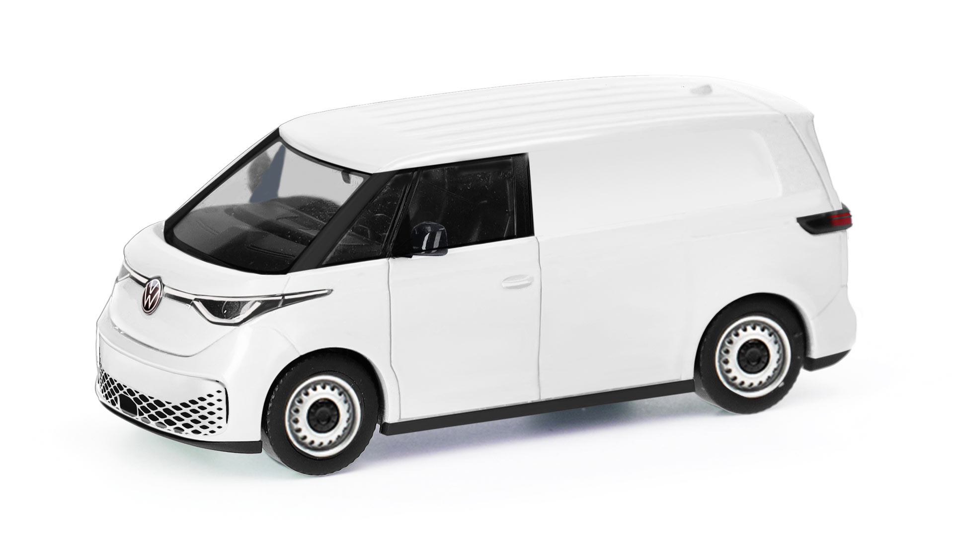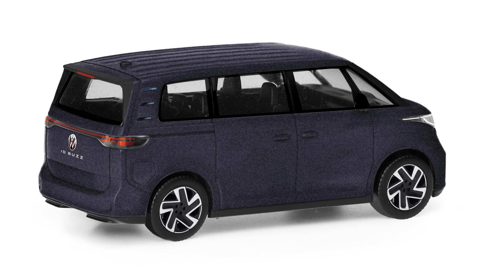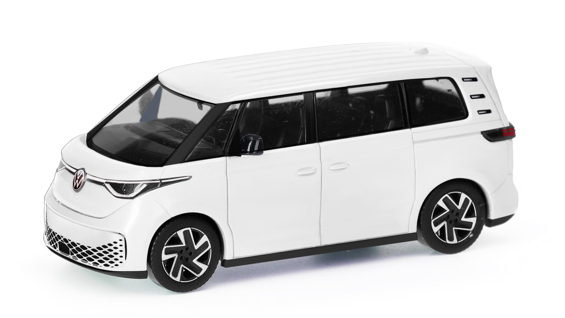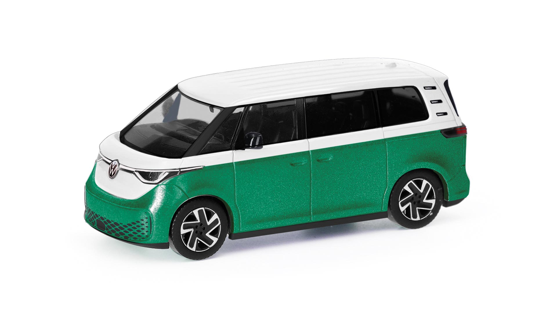 Herpa is producing an ID. Buzz as a short minibus in the European version, the only version currently available. VW offers five metallic colors as well as deep black pearl effect for the monochrome version. Then, and this is more likely to suit the majority of tastes, there are four two-tone paint finishes. Here, the upper part of the body, including a stripe below the side windows and the front section, is painted Candy White (a solid color), while the lower section is painted Starlight Blue, Leaf Green, Energetic Orange, or Lime Yellow, all metallic colors. Although the two-tone color scheme costs 3094 euros extra, it makes the ID. Buzz peoperly retro.