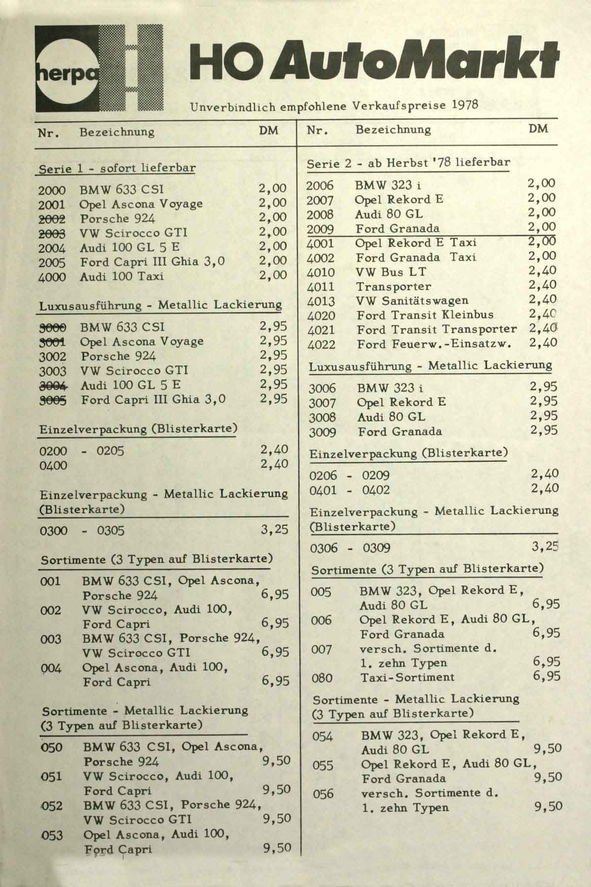 Brochure number one: A4 color print, the reverse side white. With this leaflet, Herpa’s H0 car market is launched 45 years ago. Price list 1978: These are deutschmarks, not euros.