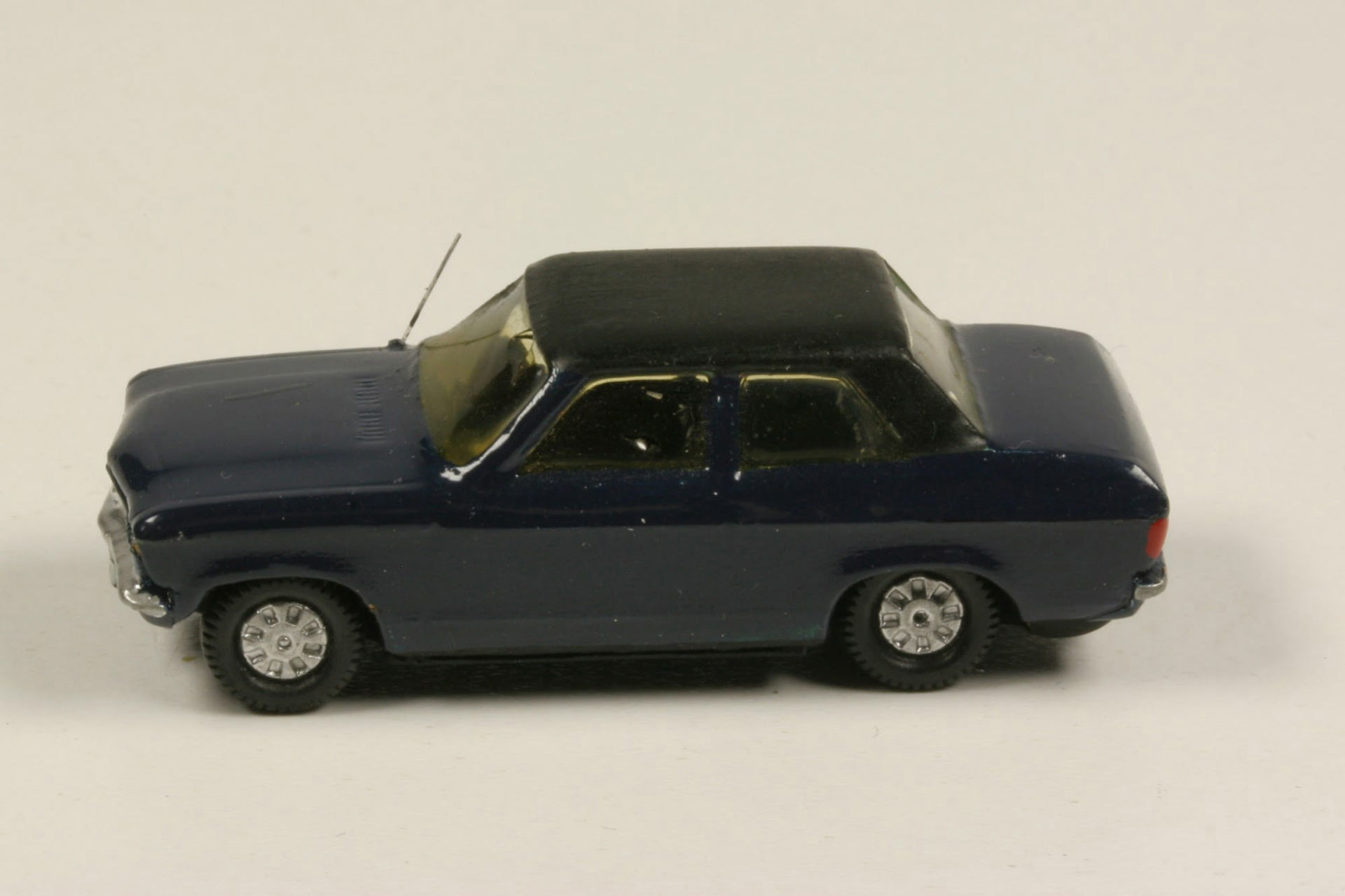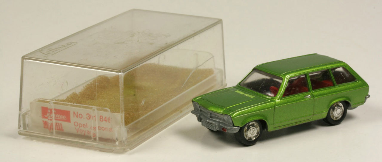 As a contemporary miniature car, the Opel Ascona A, both the sedan and the station wagon, is sorely neglected, although in its time, the toy car genre was definitely still in its heyday. The only Ascona A currently in production was made by Schuco in the 1/66 scale, also a Voyage, as made by Herpa. Schuco in Nuremberg manufactures a nice and homogeneous zinc die-cast series in uniform 1/66 scale, launched in 1971, as a competitor for the favor of the guys who have so far the internationally dominant Matchbox models and the US cars of Mattel Hot Wheels, as well as the German Siku miniatures. Unlike Matchbox and Mattel, then focusing on dragsters and fantasy models, Schuco, like Siku, makes serial production vehicles of everyday life. Schuco focuses on German manufacturers and represents the West German everyday spectrum. In 1972, Schuco releases the Ascona Voyage in the 1/66 scale with an opening tailgate, available in metallic onyx green, signal yellow, and a turquoise that veers into mint. The most common color is green metallic, as shown here. There is also a promotional model for the Leonberger Bausparkasse (a building society) in yellow with decals on the doors. Schuco goes bankrupt in 1976, and the molds of some of the 1/66-scale models pass to the Brinquedos Rei company in Manaus, Brazil. The Ascona Voyage goes there as well and is produced under the Miniaturas Rei brand in metallic gray-green. For Schuco 1/66-scale collectors, the Brazilian Rei models have a very special appeal.