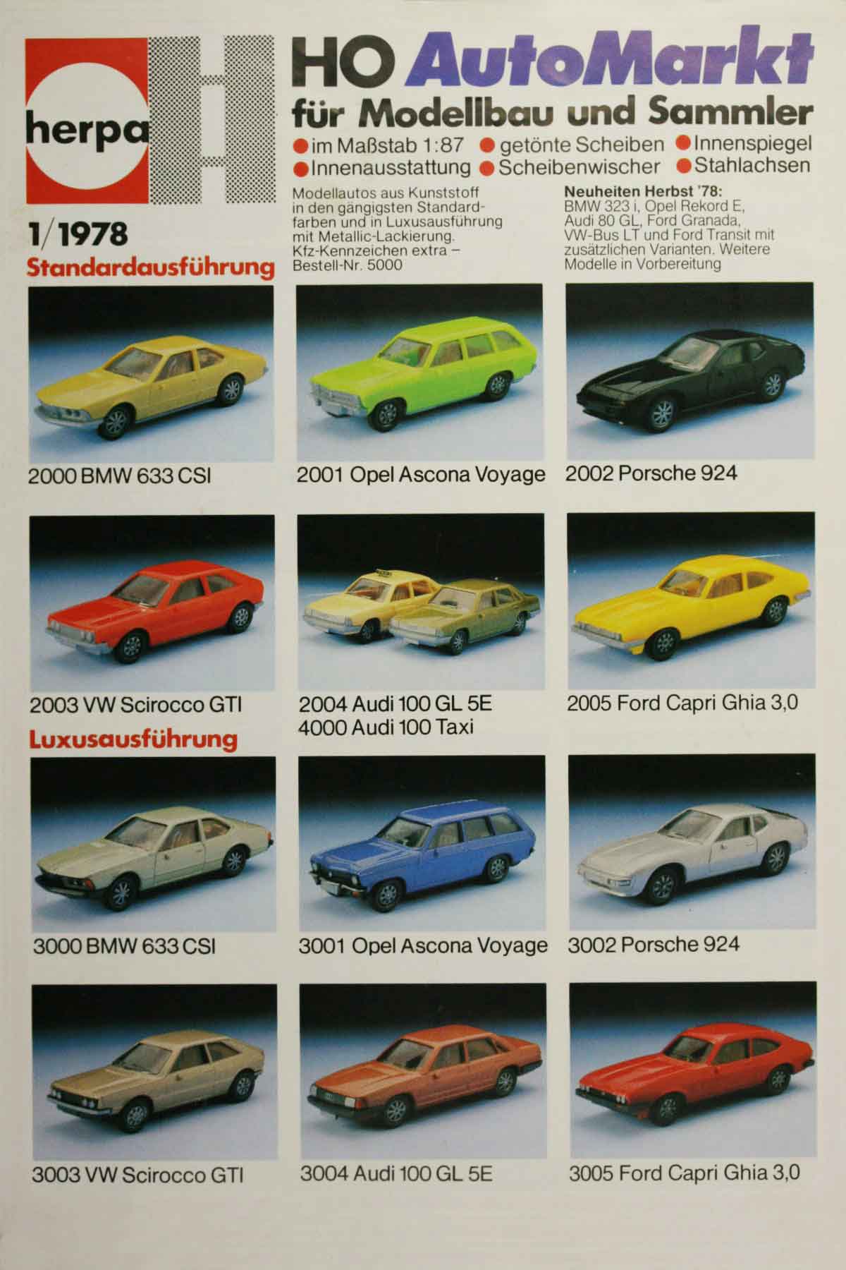 Thus, at the Toy Fair in January/February 1978, Herpa presents its firsts, which are sextuplets: BMW 633 CSi (E24), Opel Ascona A Voyage, Porsche 924, Volkswagen Scirocco GTI, Audi 100 (B2) GL 5E civil and as a taxi, Ford Capri III 3.0 Ghia. Except for the taxi, beige of course, all models are available at the same time in several standard colors (unpainted plastic) and in several metallic colors (painted plastic, matt metallic paint covered with glossy clear lacquer). The standard models initially feature a silver base plate, while the luxury versions feature a black base plate. Common to all are cast-on exterior mirrors, windshield wipers, and interior rearview mirrors engraved into the glazing; the glazing is not completely transparent, but slightly tinted. The rims are not type-specific to begin with, but standardized; two sizes suffice for the six different models. A standard car costs 2.00 deutschmarks, one painted in metallic comes at 2.95 deutschmarks. They are sold individually, delivered in vacuum-deep-drawn slip boxes. The special feature of these cars compared to the long-established Wiking models is, of course, the type selection; Herpa does not initially produce anything that is already part of the Wiking program, so Wiking collectors find a welcome addition in the Herpa range. And yet, it is more than a supplement, because the Herpa models have their own DNA, and behind it is their own product philosophy: Herpa does not “also” make H0 models, but Herpa makes “different” H0 models. The paint scheme and metallic tones were unheard of until now, but this can be considered a pure extra. The special feature of the Herpa models in contrast to the Wiking ones is that they are not made in the approximated H0 scale, but in the exact 1/87 scale.