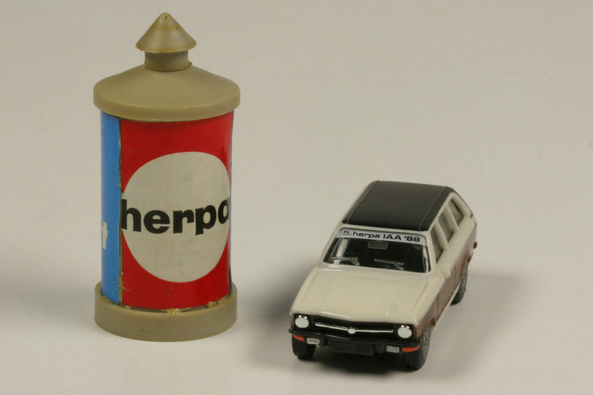 Two things at once, which are not available for purchase: the trade fair model is given away, and the advertising pillar serves as a piece of decoration for factory photos in the first year of the Herpa H0 car market. The deluxe version of the retail model and the giveaway version available for no money in the world for the 1988 Toy Fair is still the most attractive version of the Herpa Ascona A Voyage. And then also with oval “customs plates”, i.e. with export license plates. In direct eye contact at the most luxurious retail version and the most elaborately printed model ever, it is striking how much the two-piece rims enhance the Ascona.