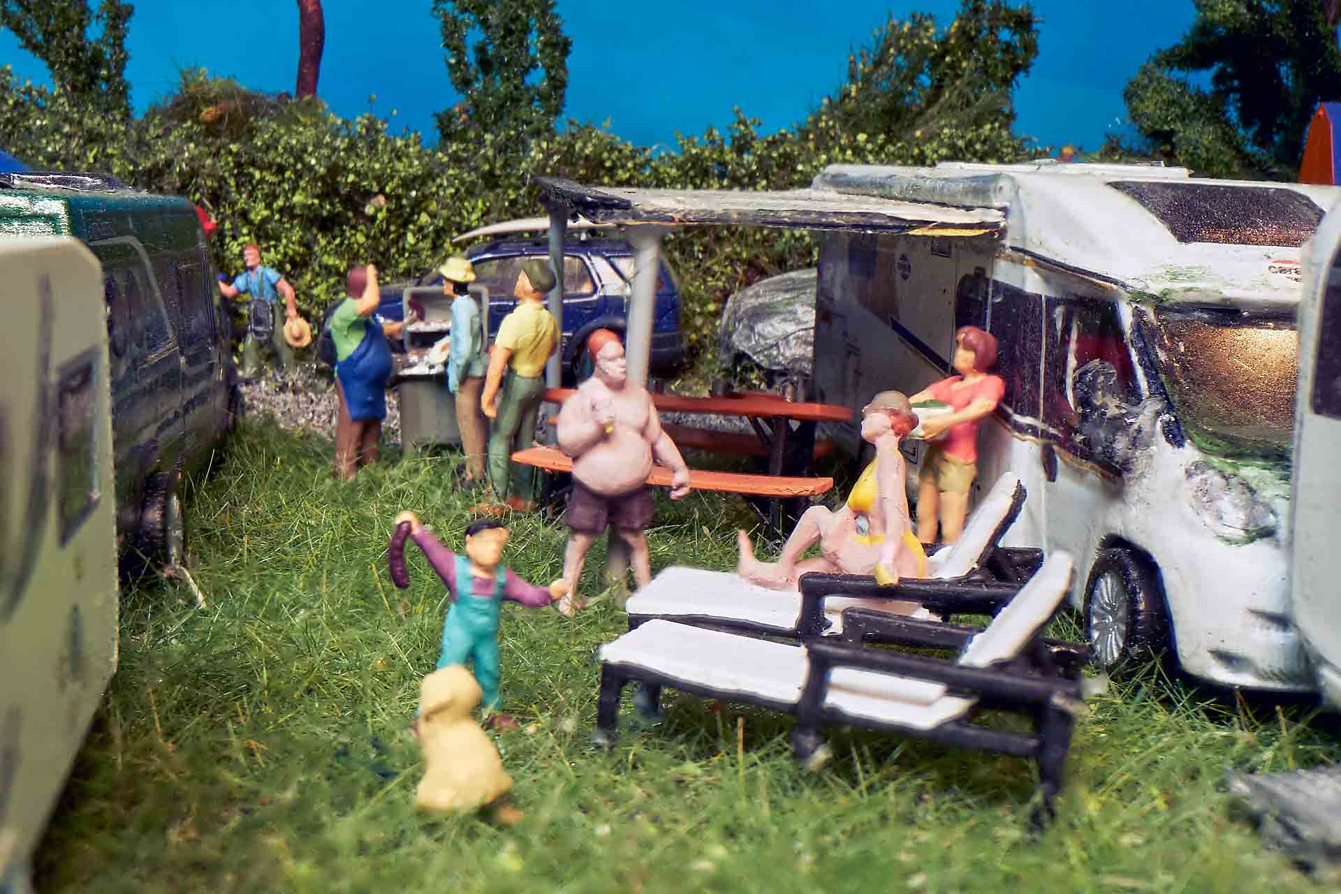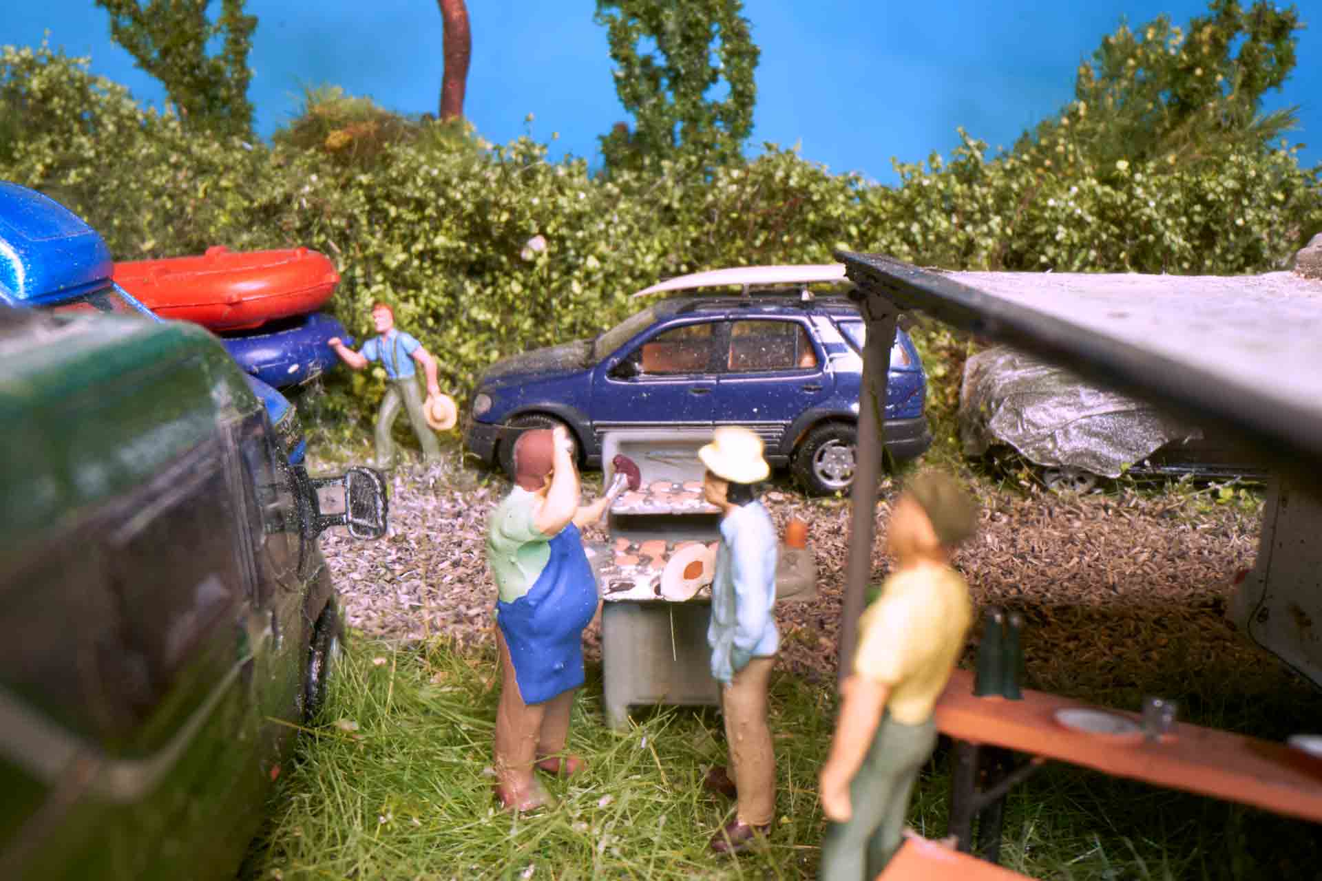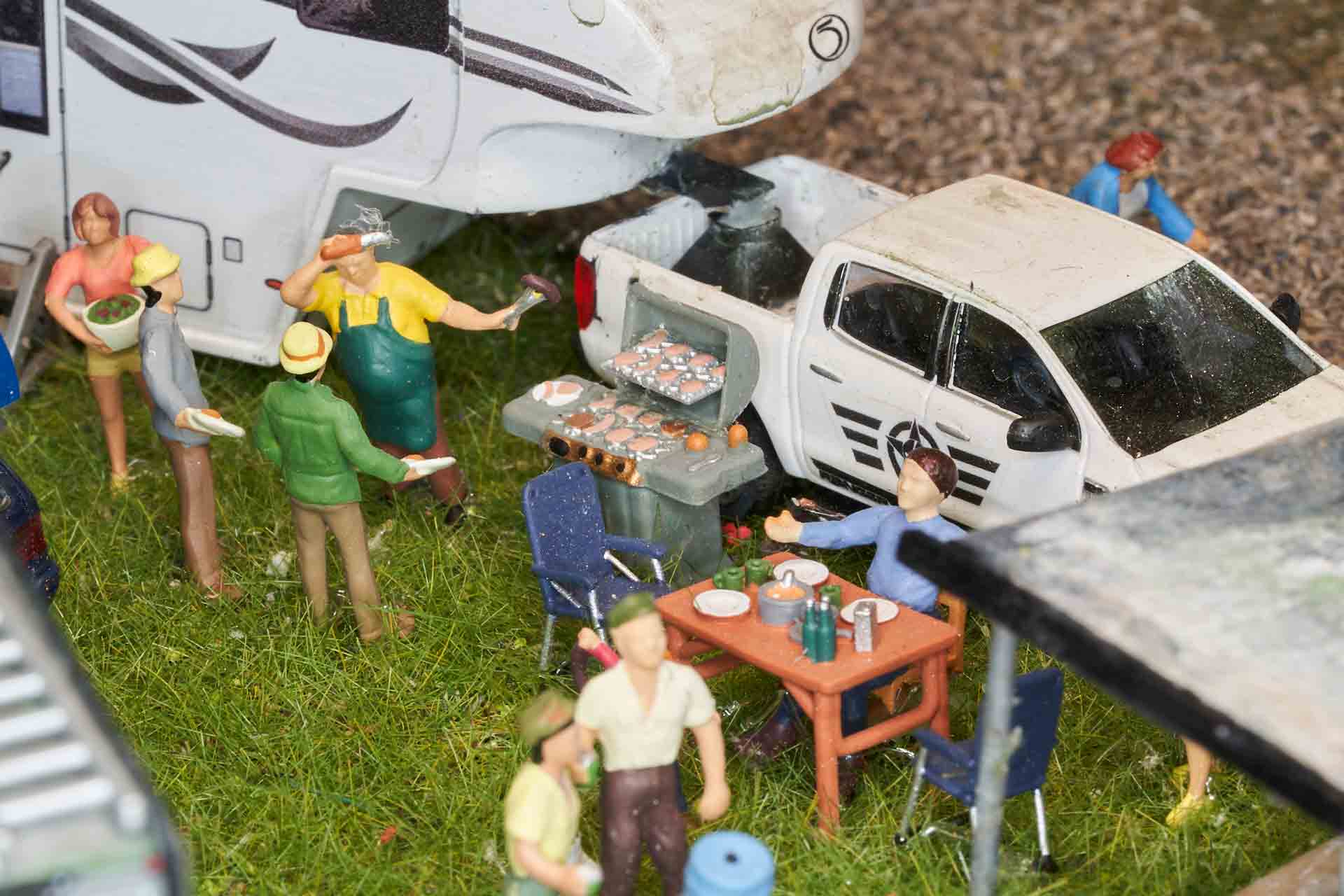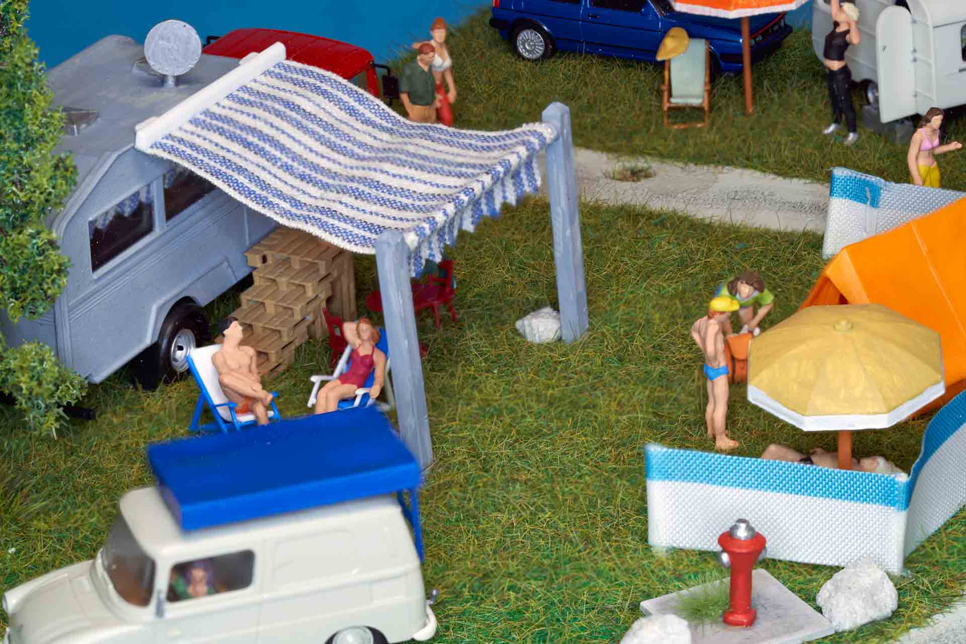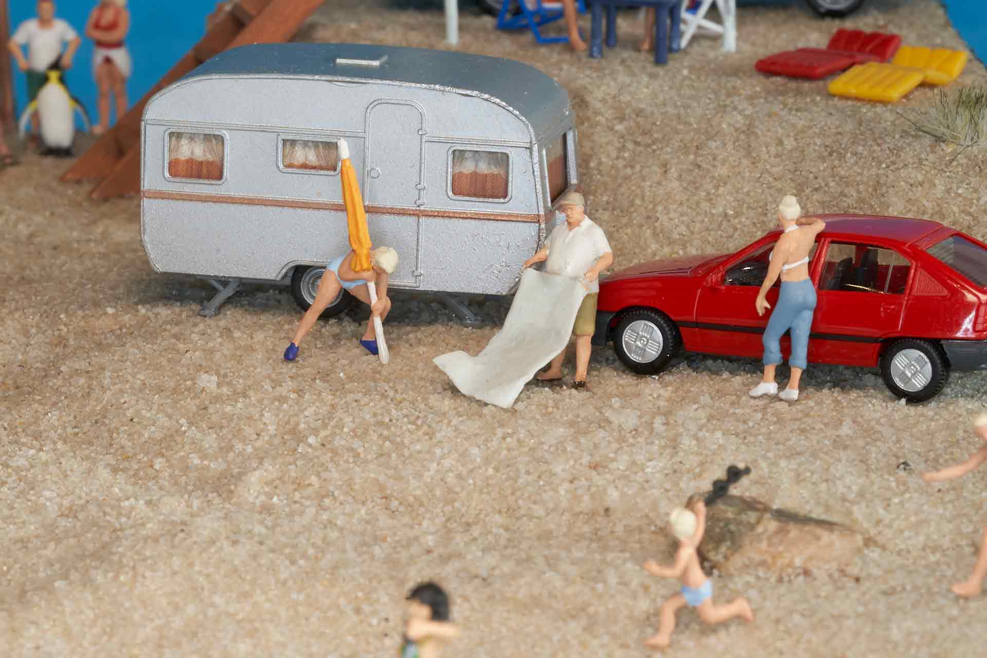 Each participant had their own vision of a camping scene, meaning there were very different and interesting details to find: from an ice cream van to a snack bar with bar tables, a sandpit for the children, a brick barbecue area, and a shower block, it was a broad overview. But there were usually campers to be seen barbecuing right next to their motorhomes or caravans and getting together in a cozy atmosphere. Have fun studying the pictures and discovering the many details.