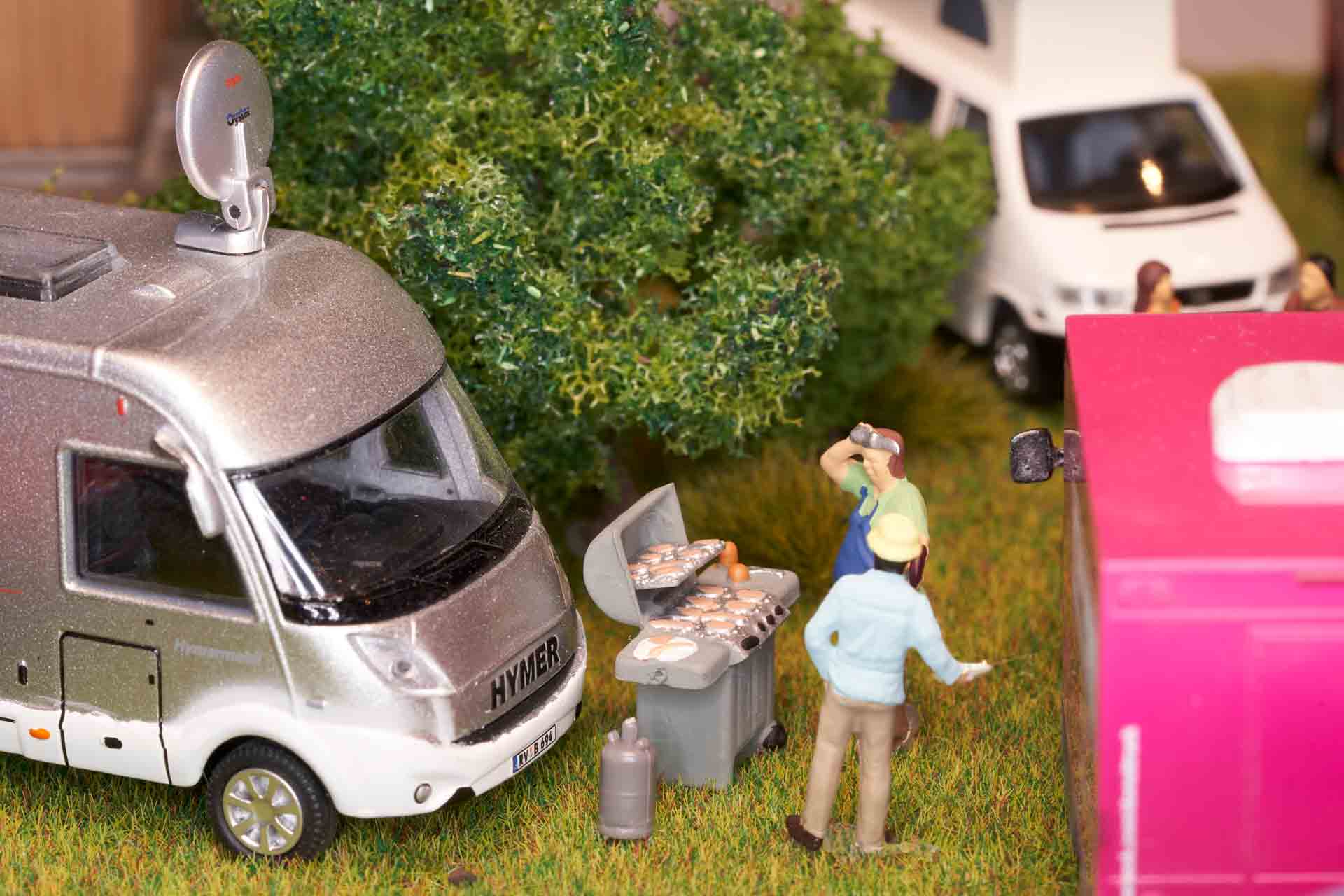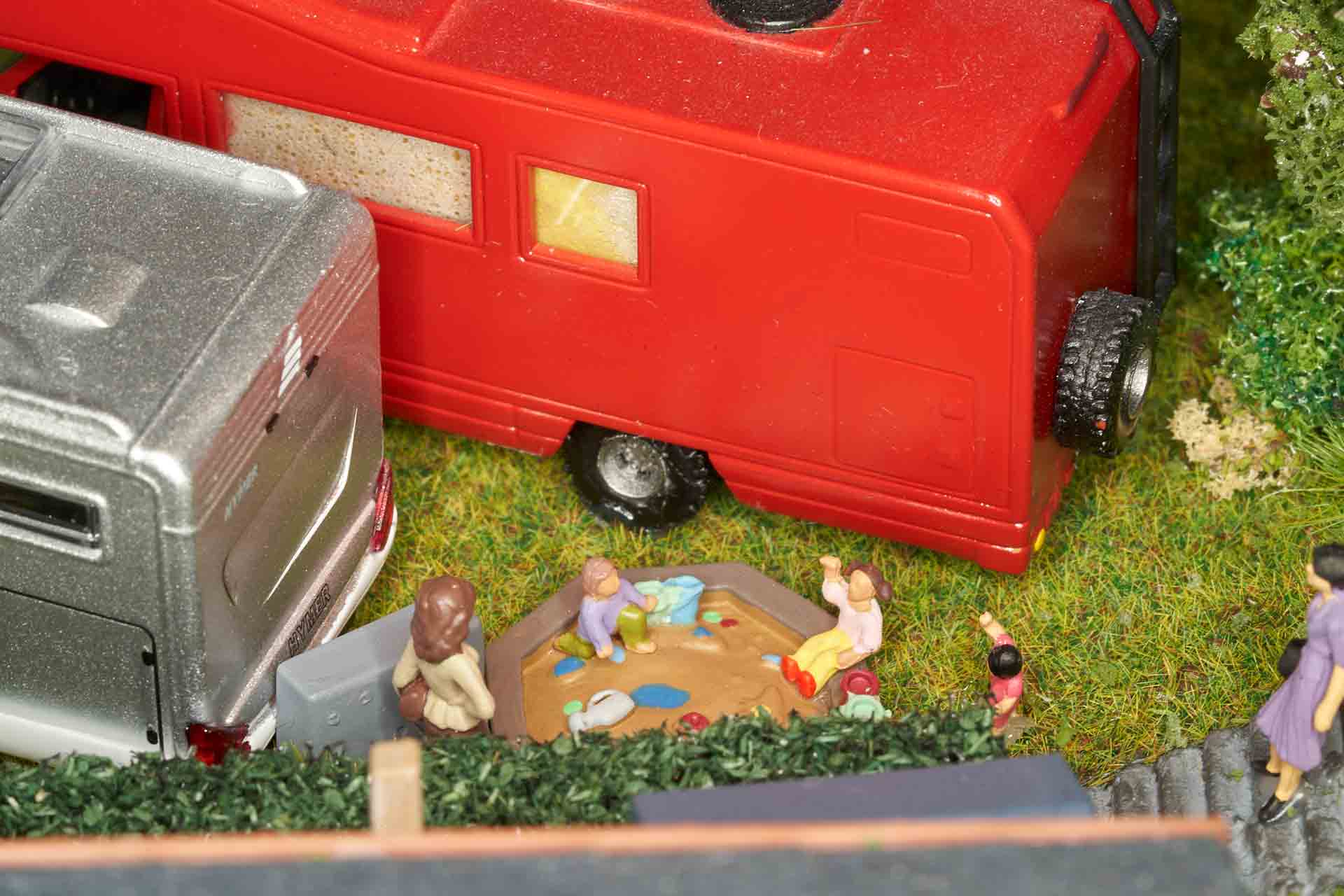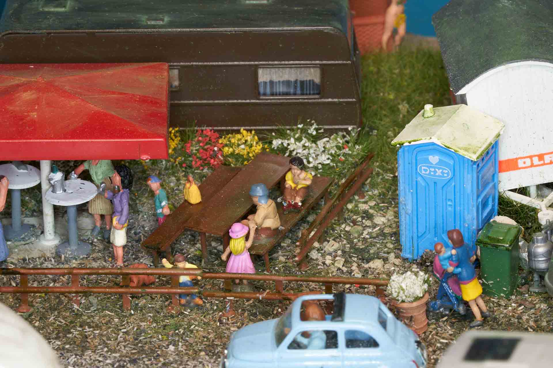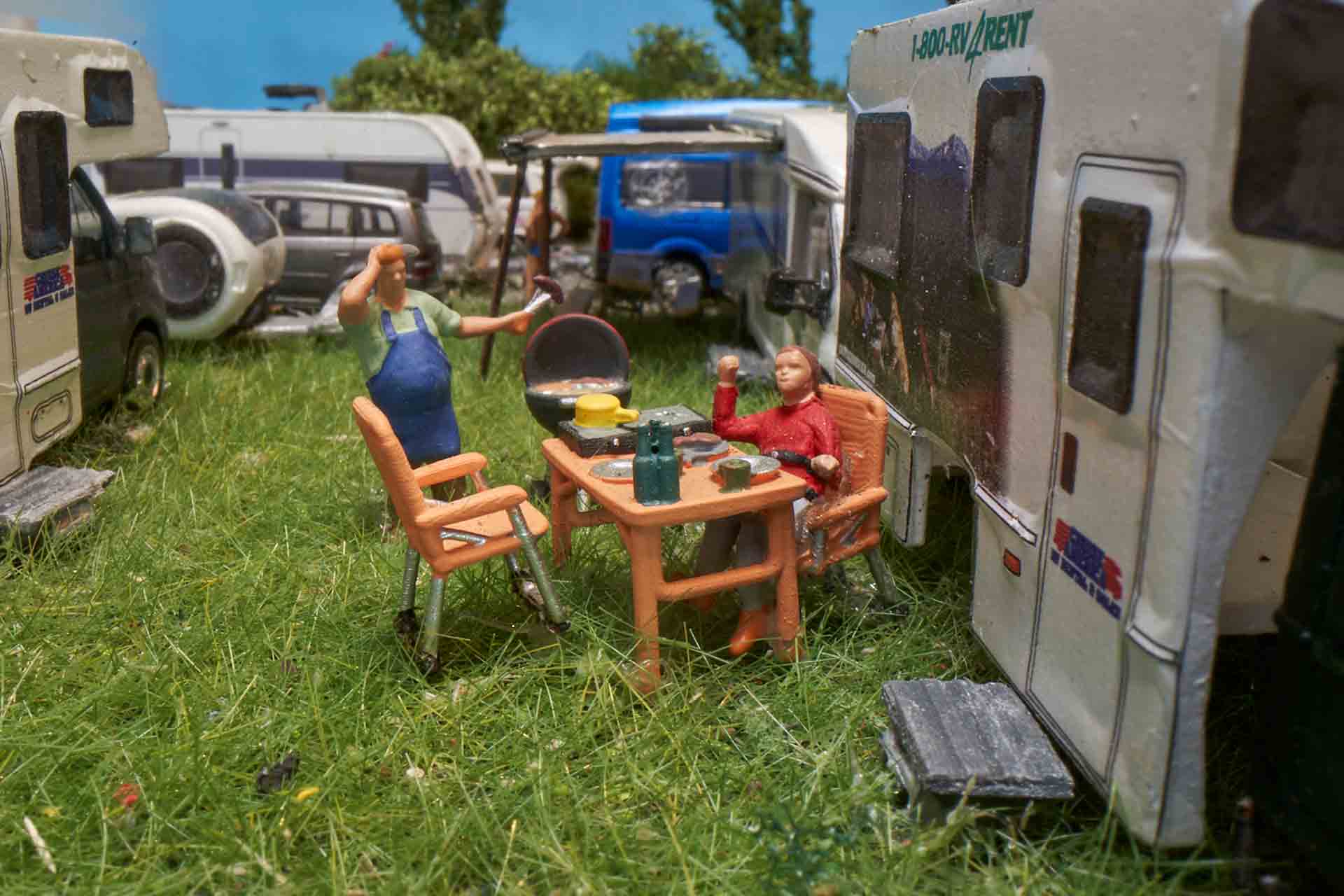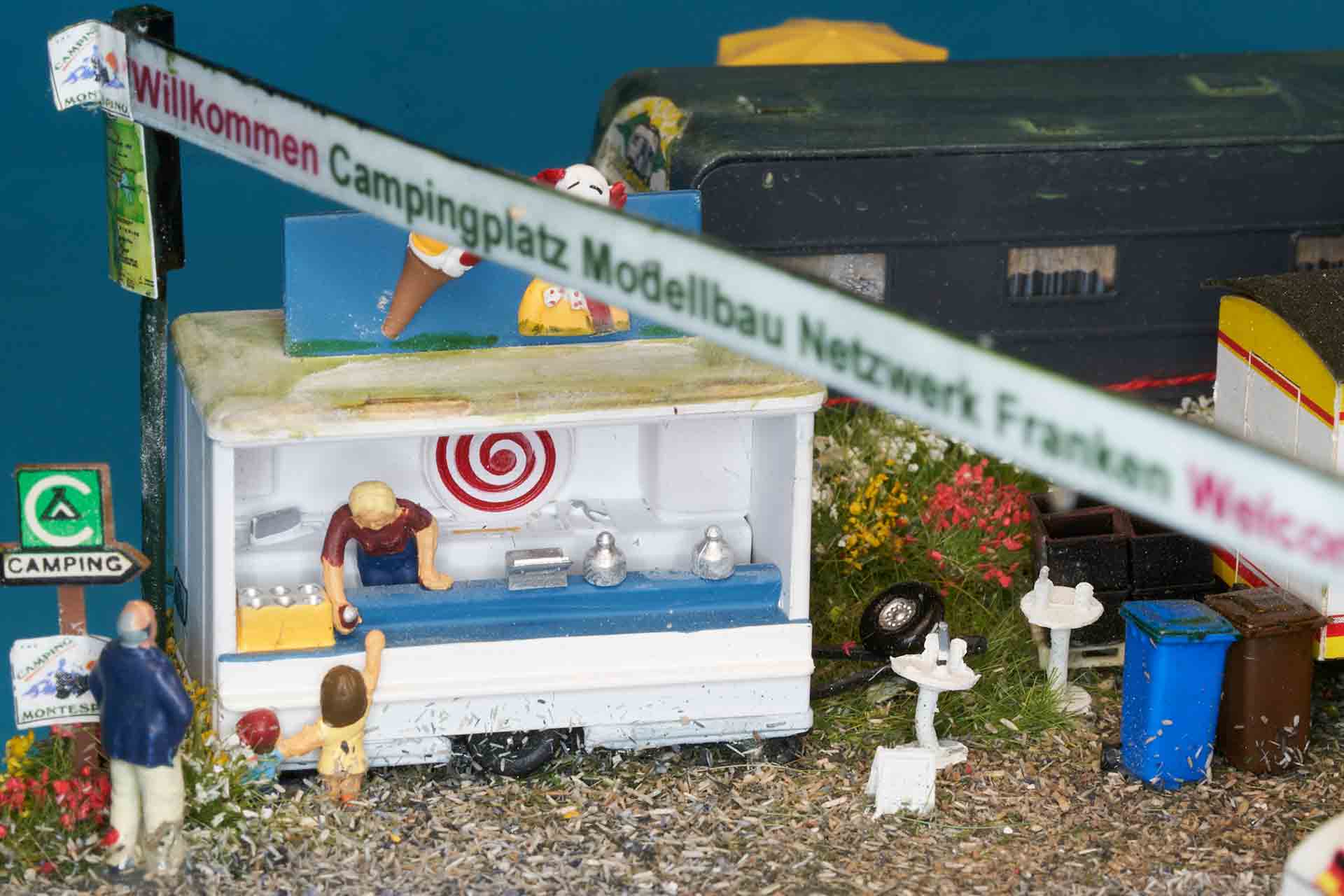 Each participant had their own vision of a camping scene, meaning there were very different and interesting details to find: from an ice cream van to a snack bar with bar tables, a sandpit for the children, a brick barbecue area, and a shower block, it was a broad overview. But there were usually campers to be seen barbecuing right next to their motorhomes or caravans and getting together in a cozy atmosphere. Have fun studying the pictures and discovering the many details.