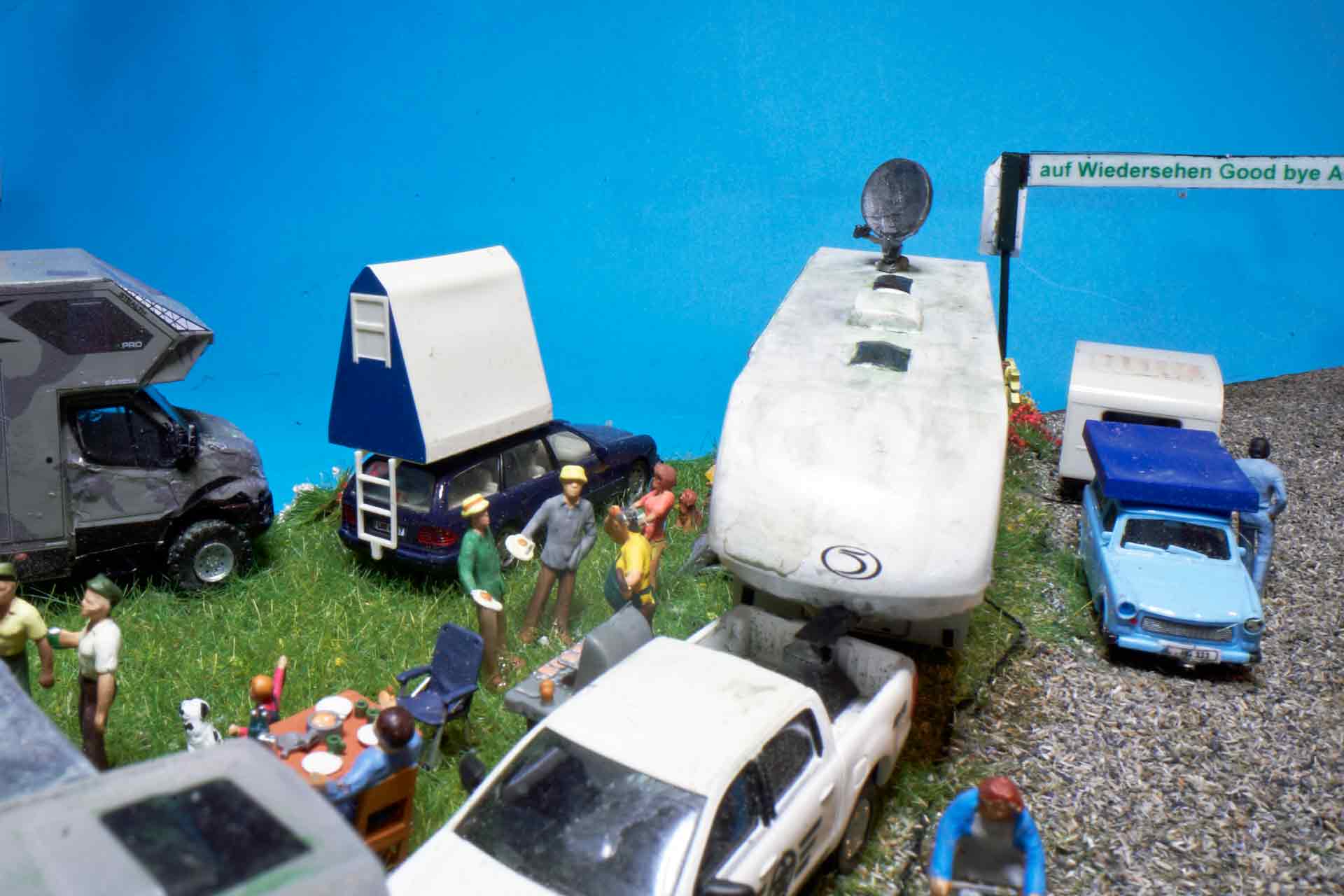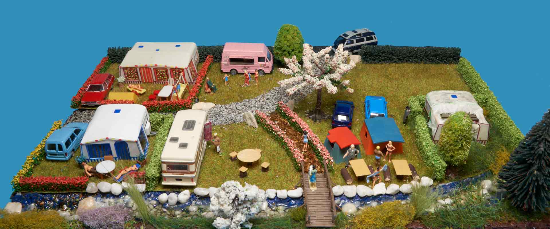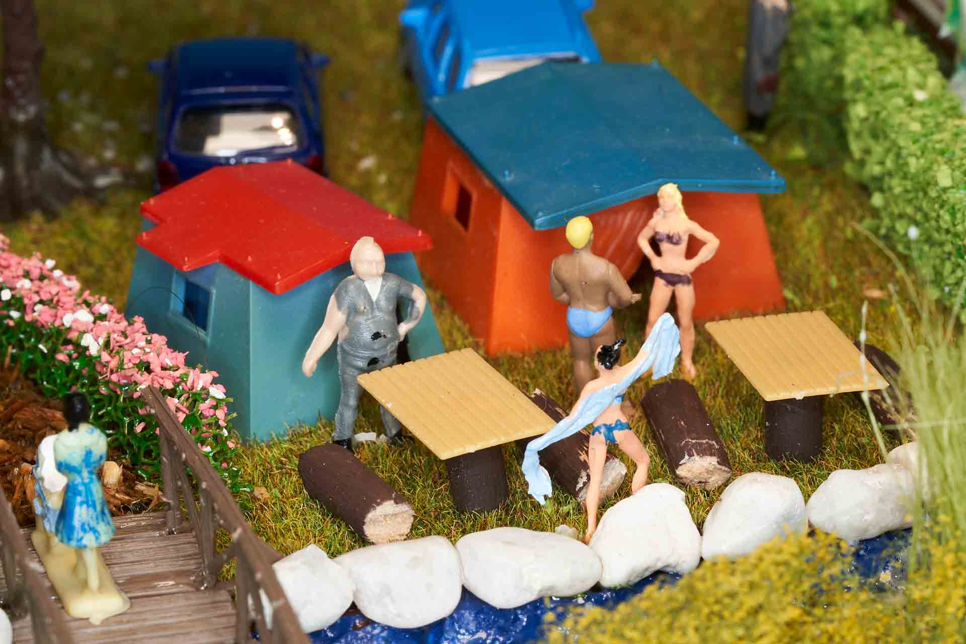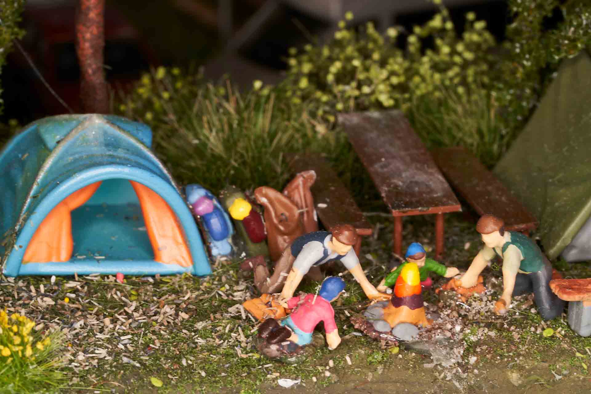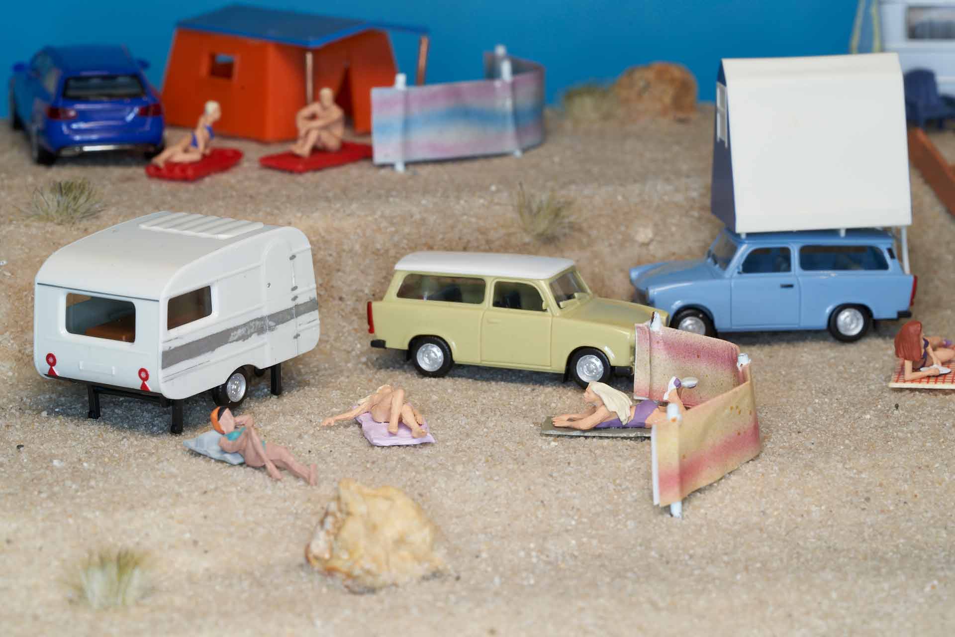Each participant had their own vision of a camping scene, meaning there were very different and interesting details to find: from an ice cream van to a snack bar with bar tables, a sandpit for the children, a brick barbecue area, and a shower block, it was a broad overview. But there were usually campers to be seen barbecuing right next to their motorhomes or caravans and getting together in a cozy atmosphere. Have fun studying the pictures and discovering the many details.