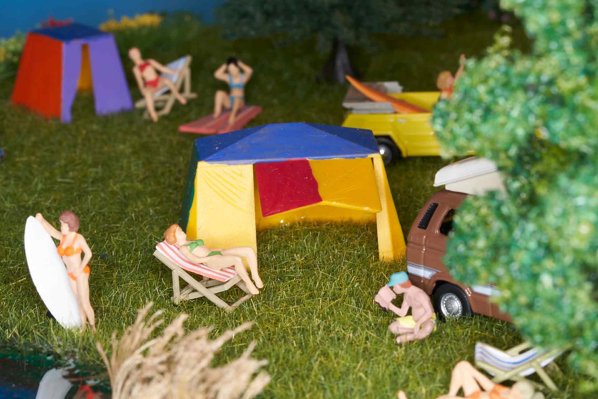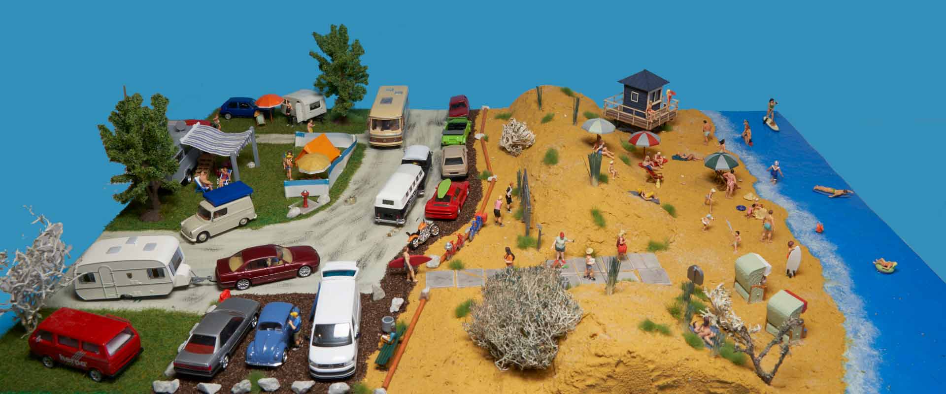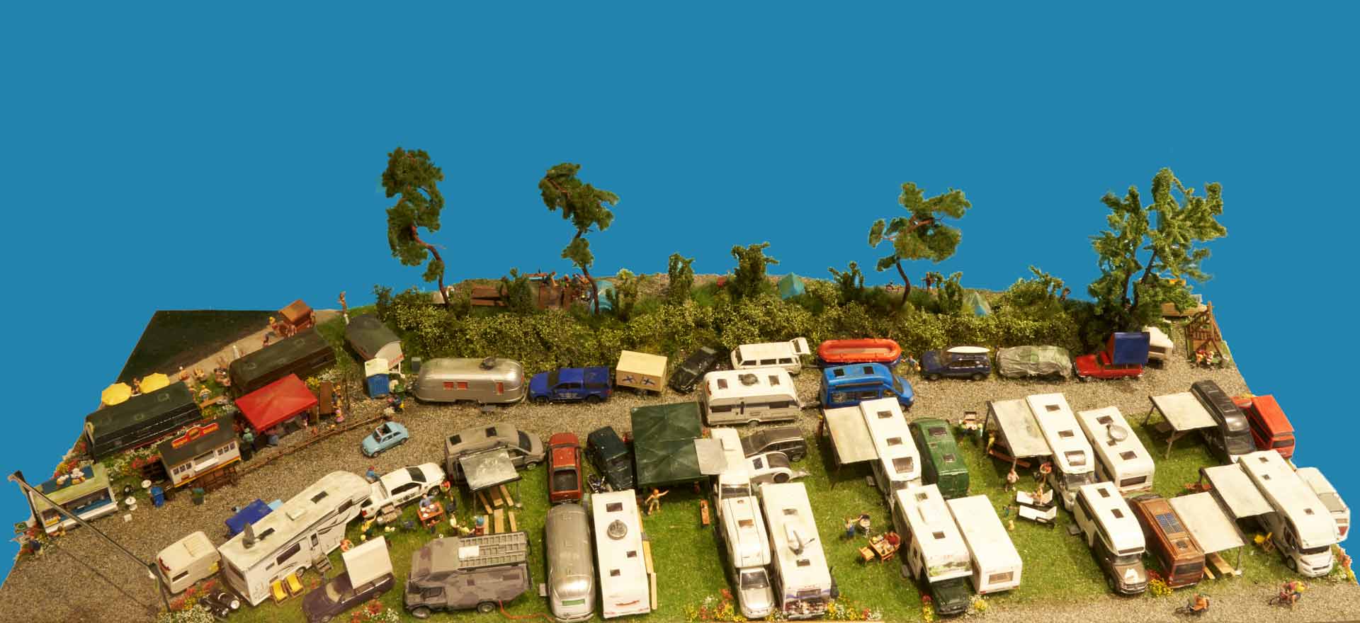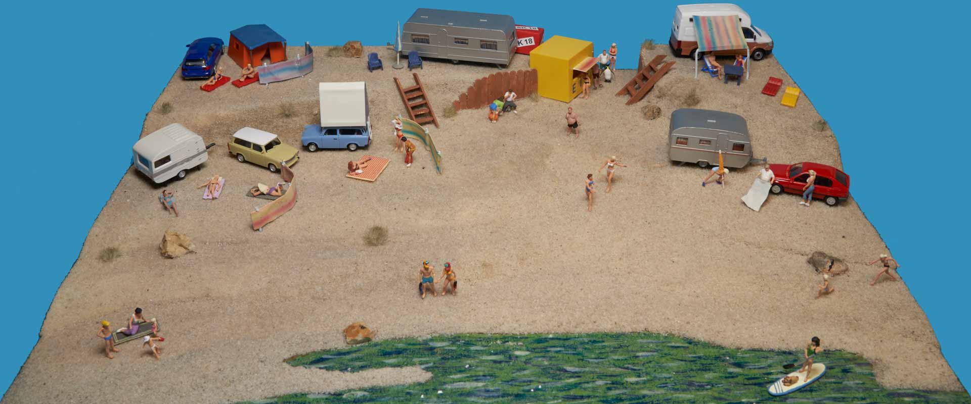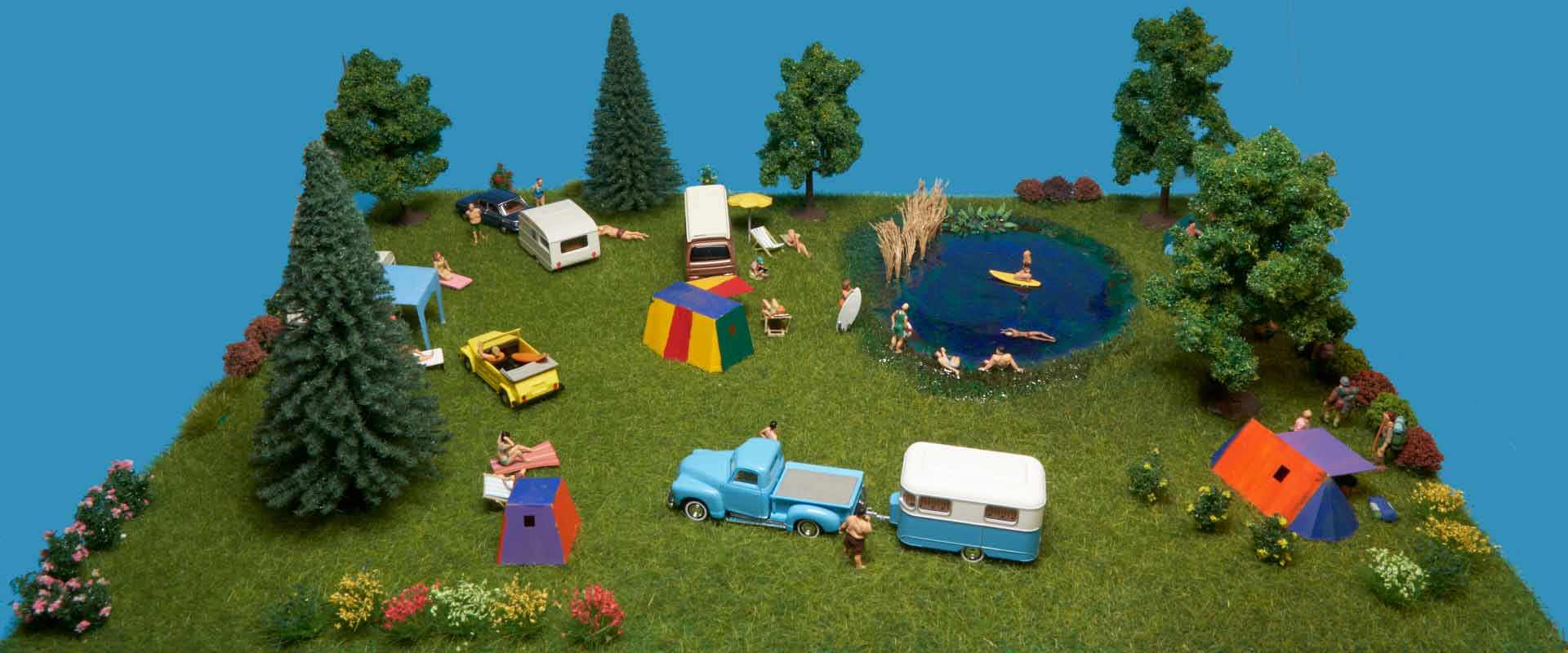 Each participant had their own vision of a camping scene, meaning there were very different and interesting details to find: from an ice cream van to a snack bar with bar tables, a sandpit for the children, a brick barbecue area, and a shower block, it was a broad overview. But there were usually campers to be seen barbecuing right next to their motorhomes or caravans and getting together in a cozy atmosphere. Have fun studying the pictures and discovering the many details.