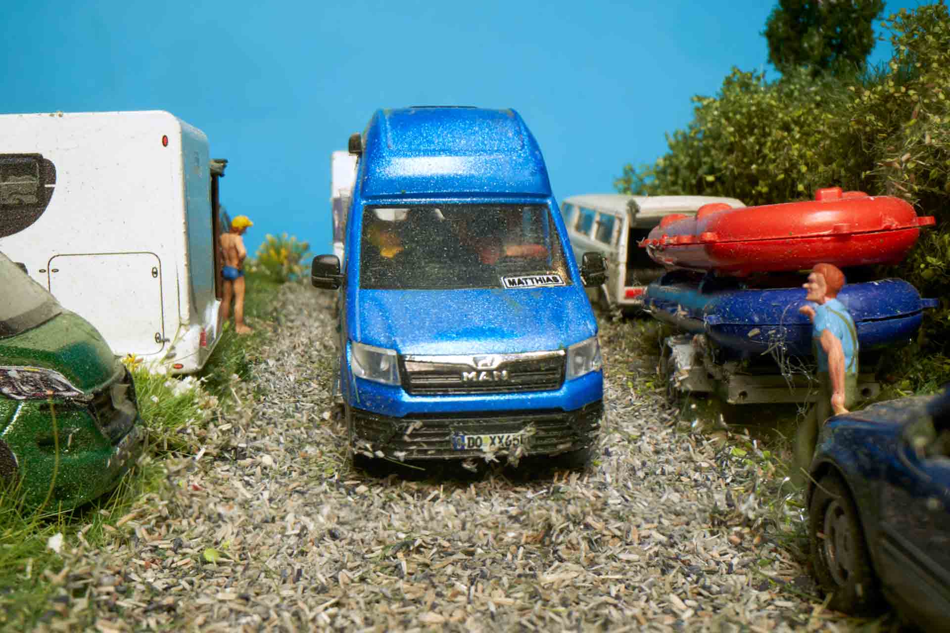 Mind you, certain requirements had to be met and these were defined in advance. For example, the diorama had to include at least three campers (whether motorhome, caravan, vehicle plus roof tent, etc.). Furthermore, various typical camping scenes were to be shown, and especially the theme of water had to be explored, in the context of a beach, lake, river, stream, etc. Last but not least, a camper had to be improved (e.g. open door, awning extended, etc.). The dioramas brought along would be examined and discussed individually during the course of the seminar. Here and there, a few tips and suggestions on how to present details in an even more optimal and natural way would likely come up. The seminar leader Mathias Neigenfind presented the builders with a Herpa model as a thank-you for their efforts.