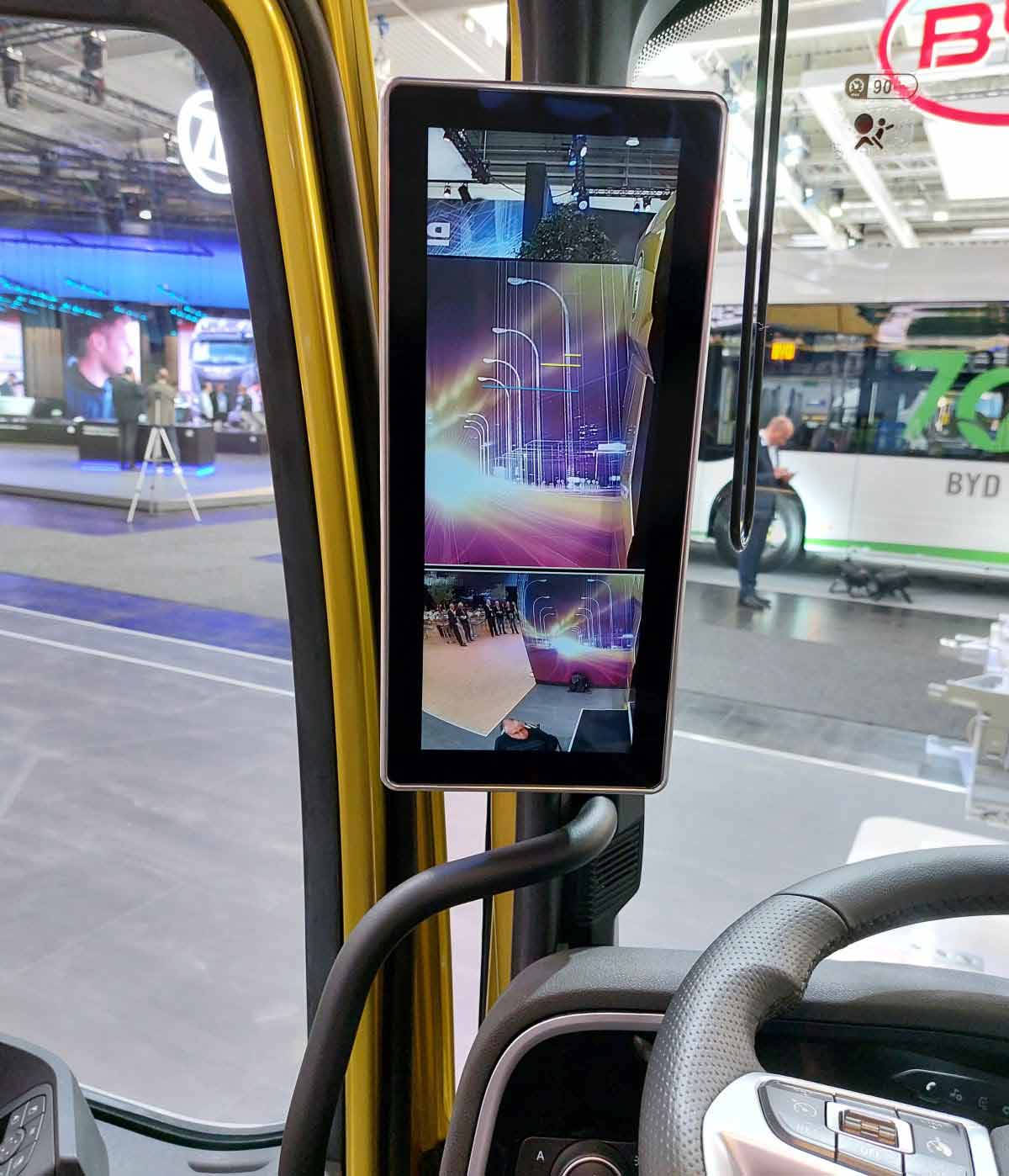 As an option, DAF installs a mirrorless camera system whose images are displayed on large screens on both A-pillars. A further ticked box on the order list means that the ramp and windshield mirrors are also supplemented by an additional camera and a monitor in panoramic format above the right-hand side display. In practice, the system performs very well. The high-resolution