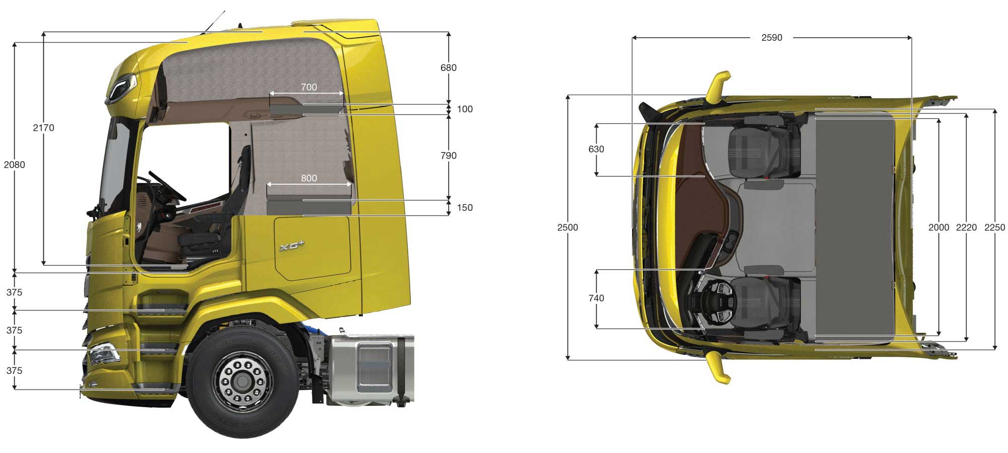 Record dimensions on the market. The driver gets really cozy on the thick topper mattress in the electrically multi-adjustable relaxing bed. The XG has a standing height of between 1.98 and 2.10 m, the XG+ even 2.22 m. Almost enough space for stretching exercises before heading out on the road. To ensure that a semitrailer still fits behind the enlarged cabs, the wheelbase has increased from 3.60 m to a full 4.00 m in the maximum case.