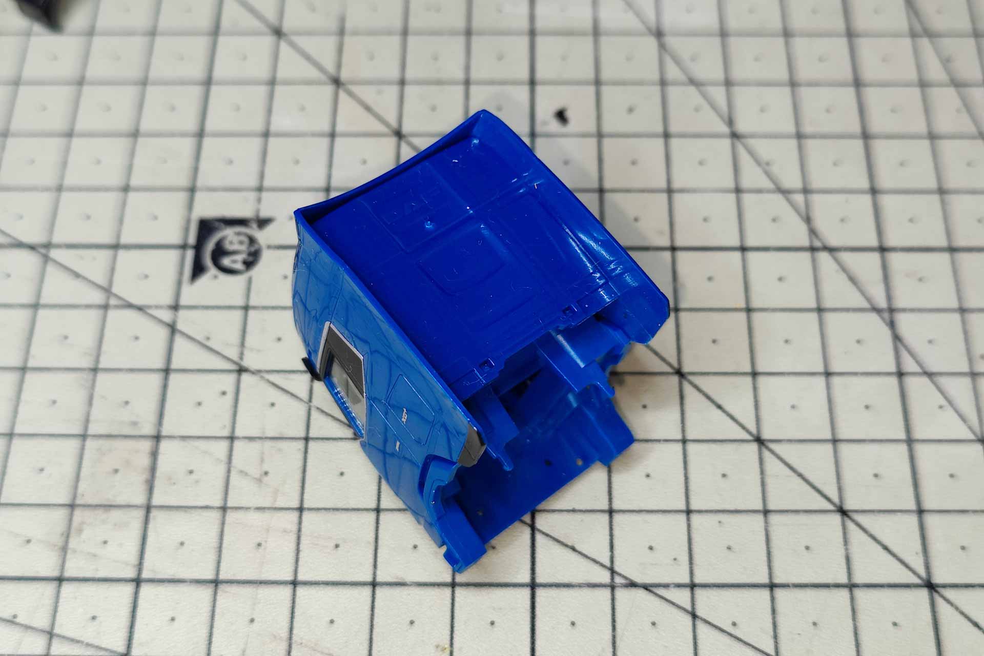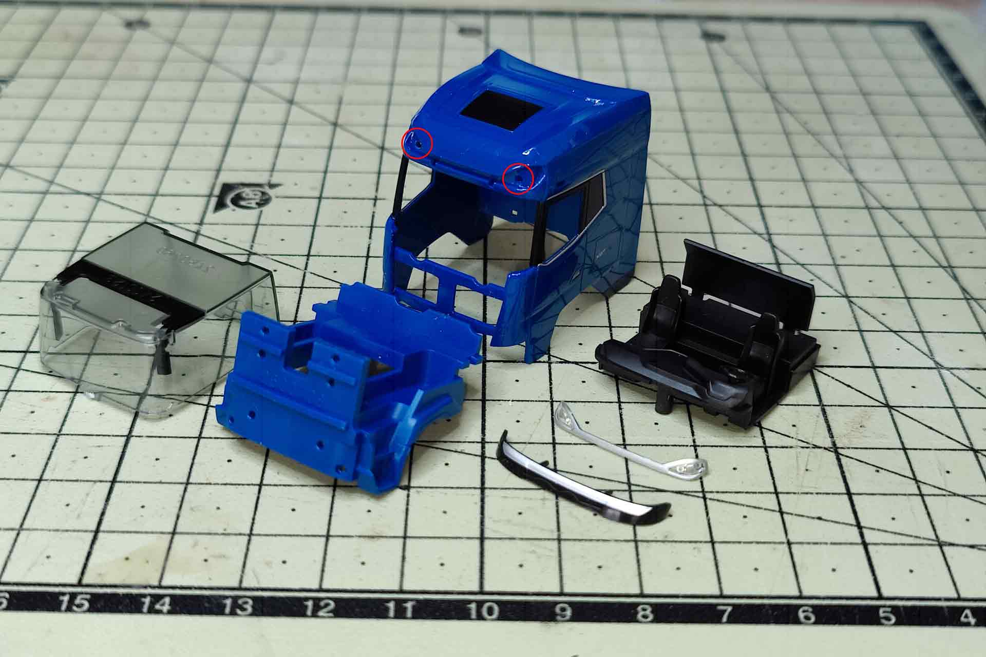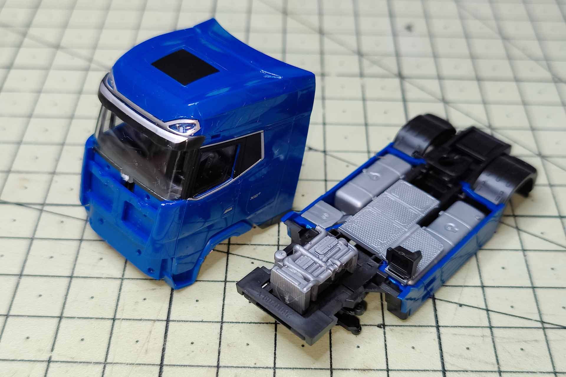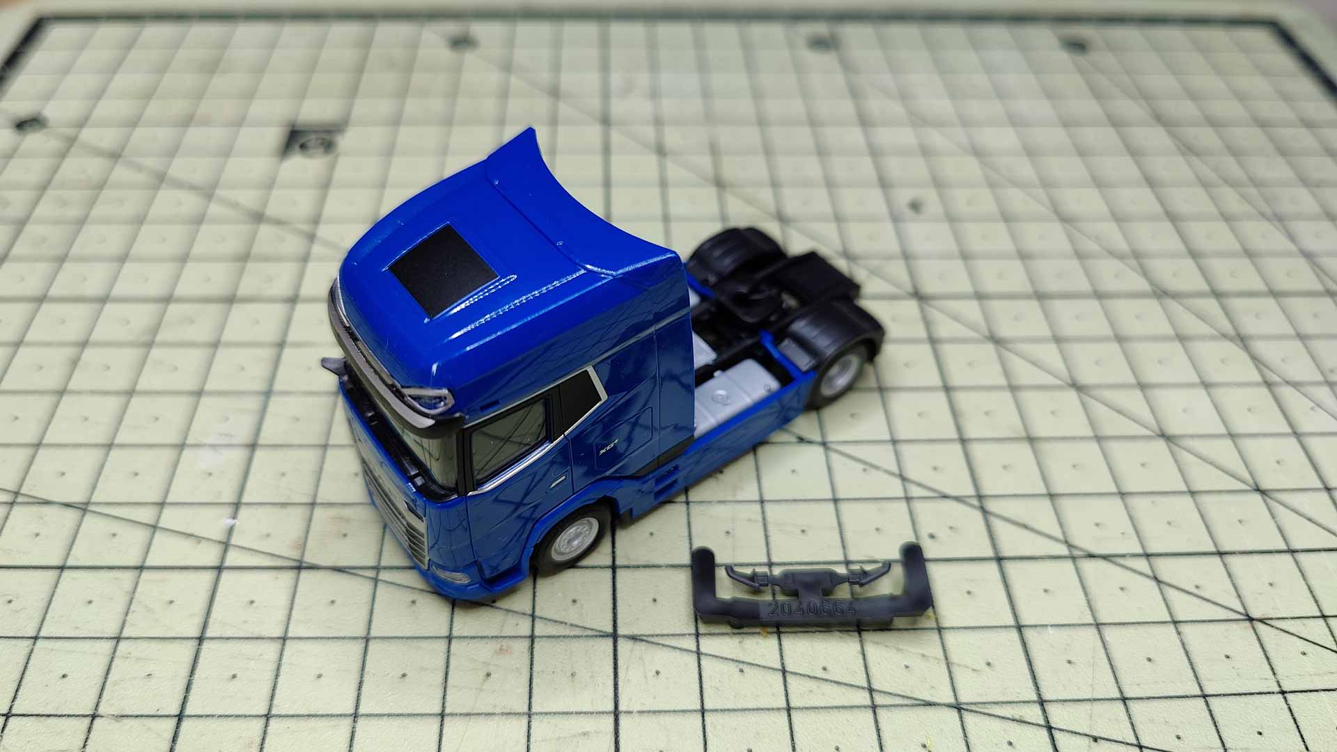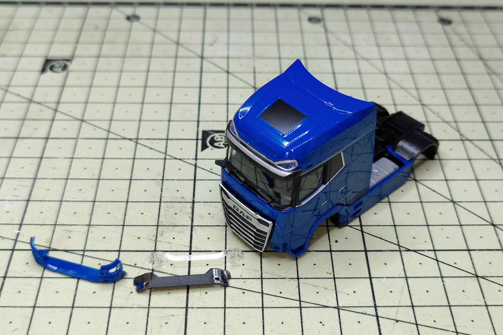 Sometimes the accuracy of fit of the Herpa parts is simply frightening. On the new DAF, for example, the most important part is barely recognizable: The panel below the windshield wipers. It is not part of the cab, as is the case with the Actros or Scania, for example. It is kept in the color of the vehicle, inserted separately into the inner part with two pins and blends almost invisibly into the cab. You can't get any further without removing this panel. Carefully lever it out towards the front and then the large cab can be lifted off the chassis. On the underside, it is firmly attached to the chassis with two short pins.