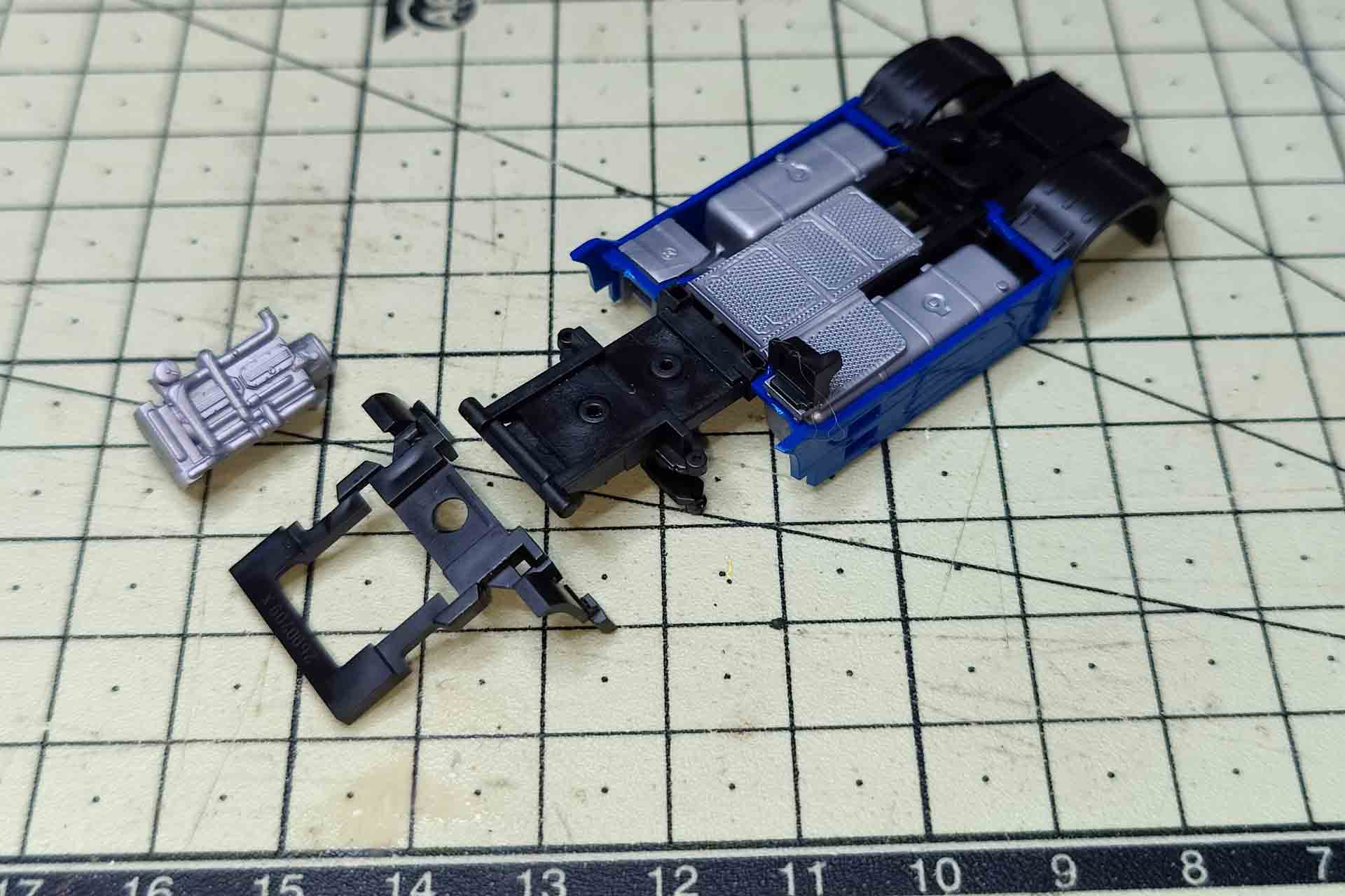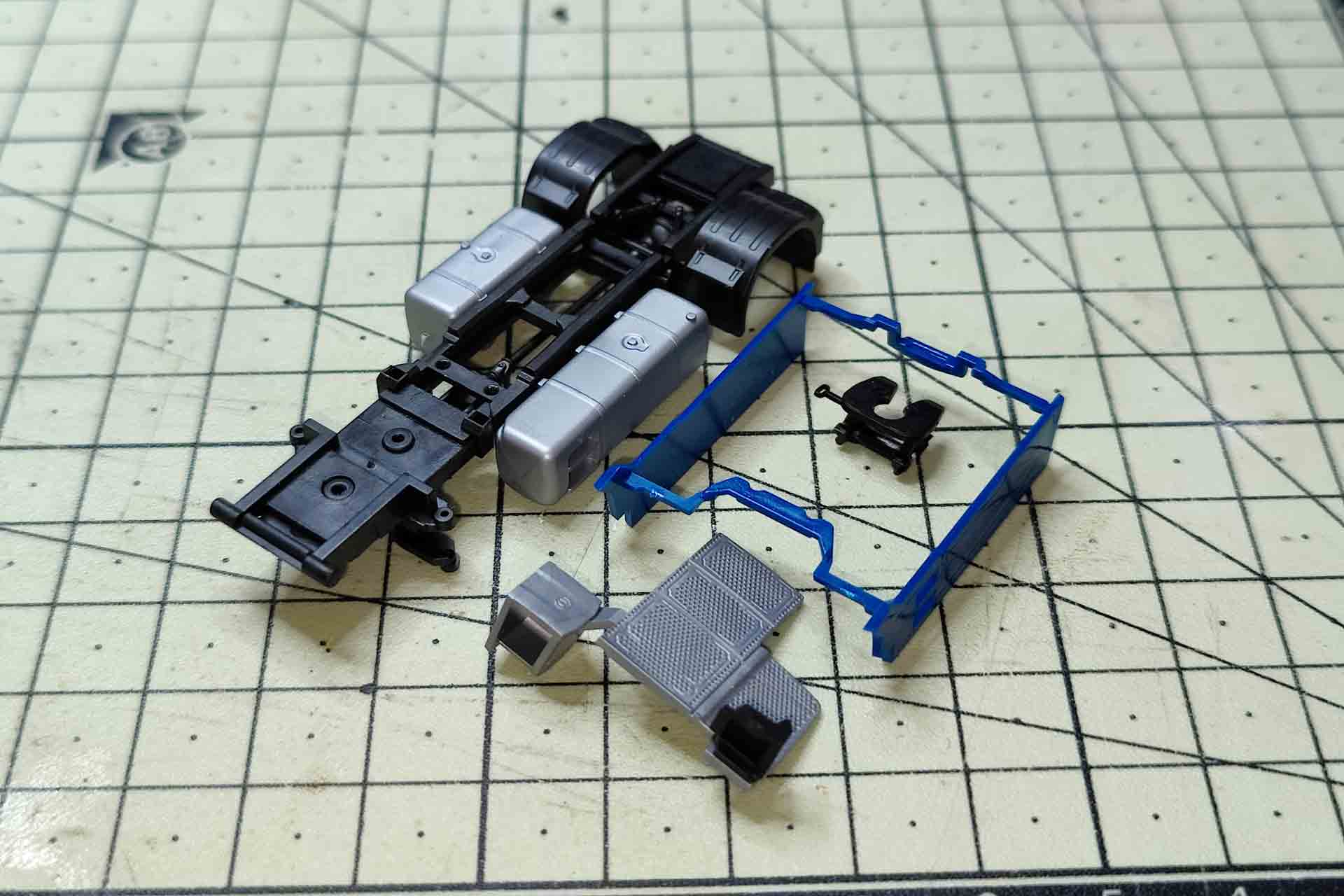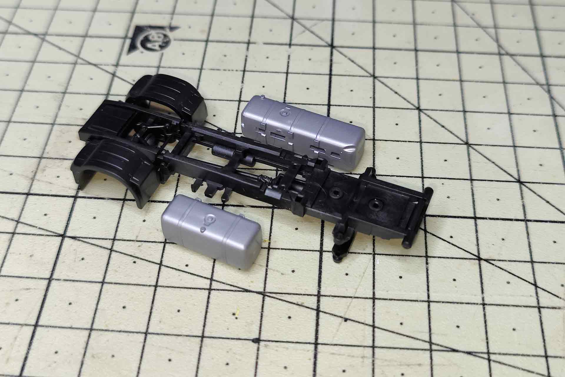 Finally, the chassis is dismantled. The engine block secures the lining of the front wheel housing with two long pins and can be pulled off upwards. The tread plate with Adblue tank and saddle plate are clipped on the side paneling and can be released upwards. The side paneling is now loose on the chassis and the silver attachments can be pulled outwards.