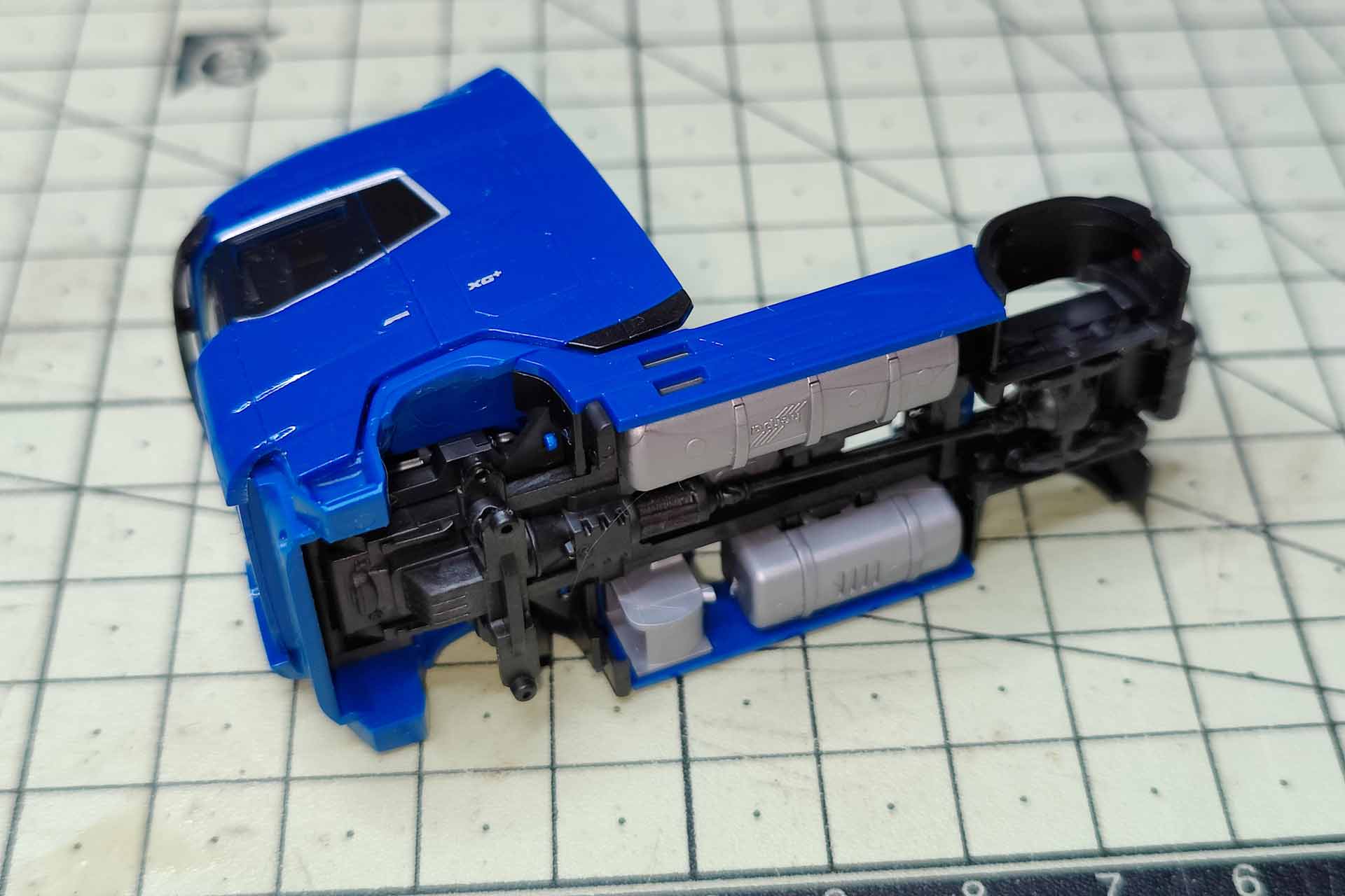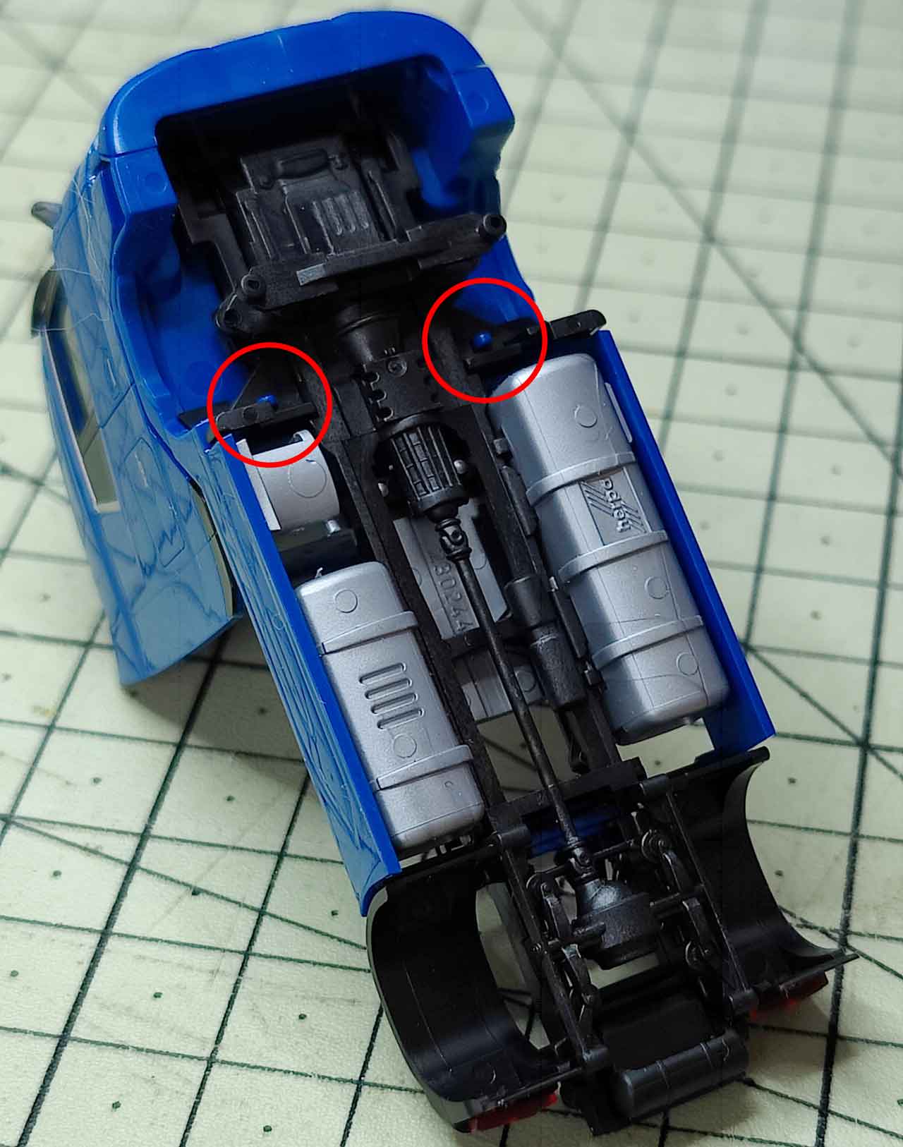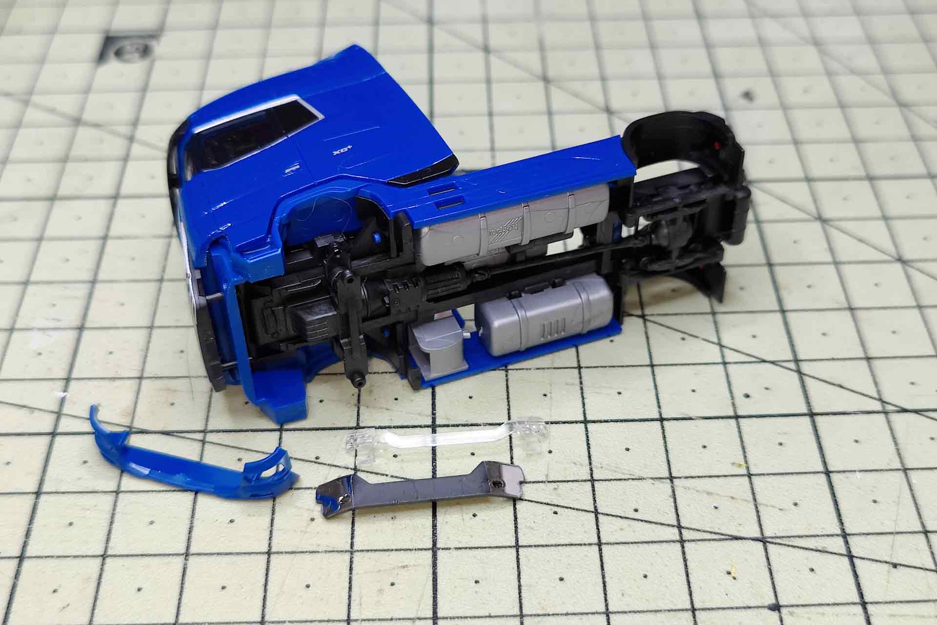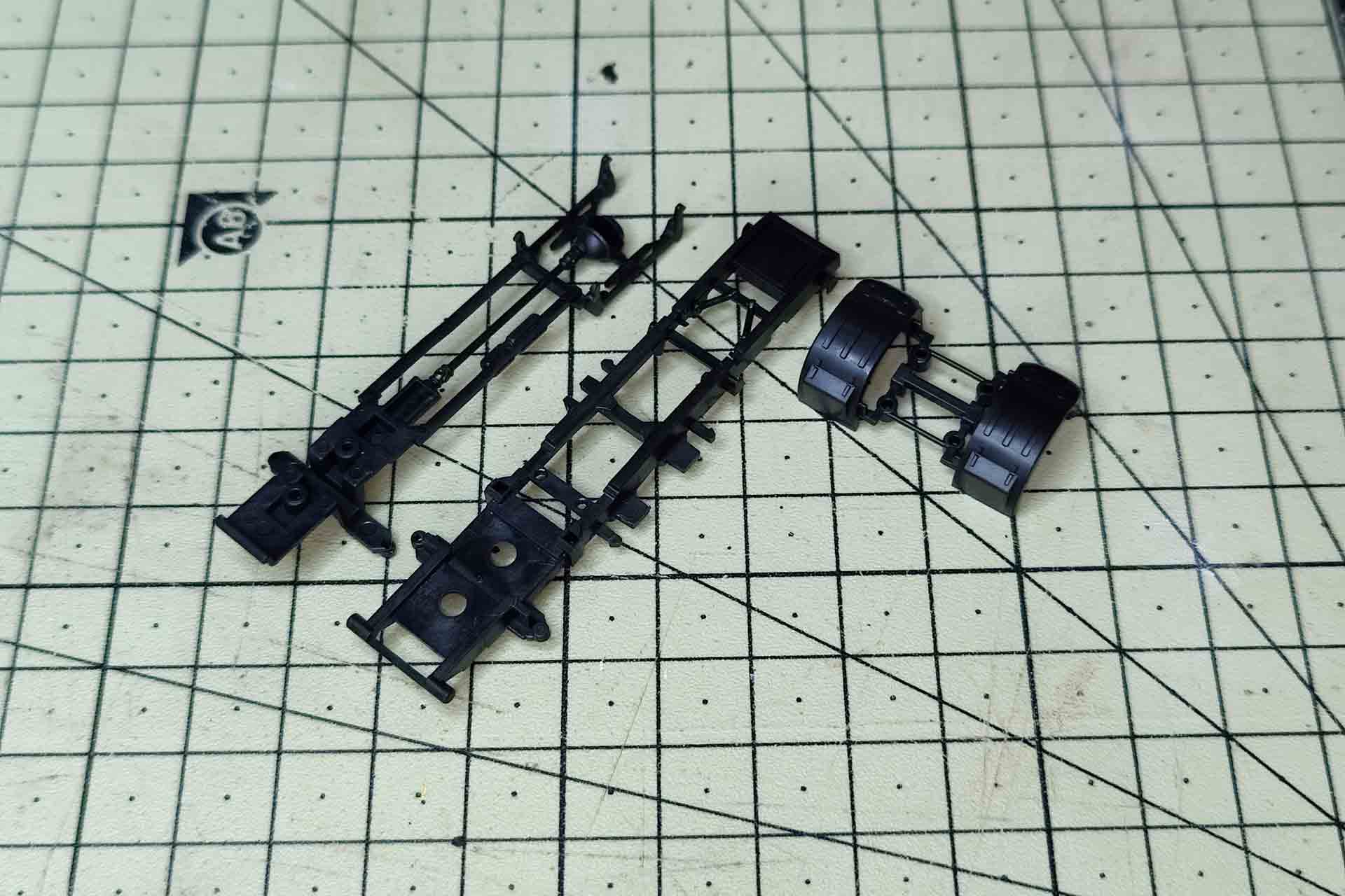 Finally, the chassis is dismantled. The engine block secures the lining of the front wheel housing with two long pins and can be pulled off upwards. The tread plate with Adblue tank and saddle plate are clipped on the side paneling and can be released upwards. The side paneling is now loose on the chassis and the silver attachments can be pulled outwards.