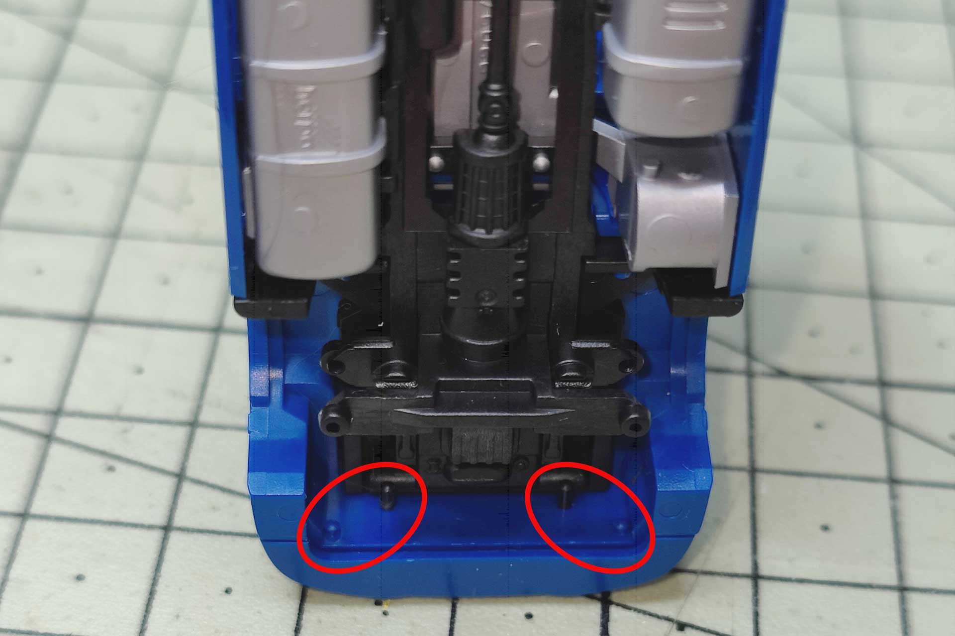 The large radiator grille requires particular attention due to its four plug-in pins. The lower ones are easy to loosen, but a flat tool is required to reach the upper ones. By pushing from deep behind the grille, it can be loosened bit-by-bit. The position of the tool should be changed several times in order to loosen all pins evenly. Remember, overlooked or overloaded pins are likely to "thank" you in their own way by breaking off and getting stuck in the model.