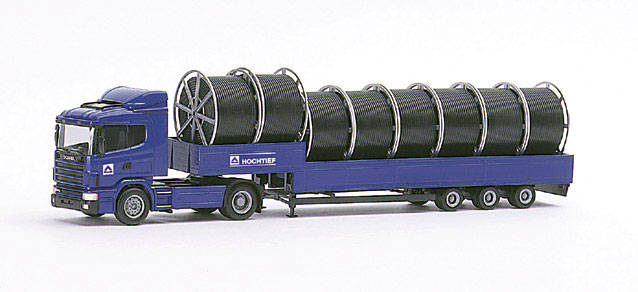 Scania 124 HL Jumbopritschen saddle train with cable drums 2A/3A