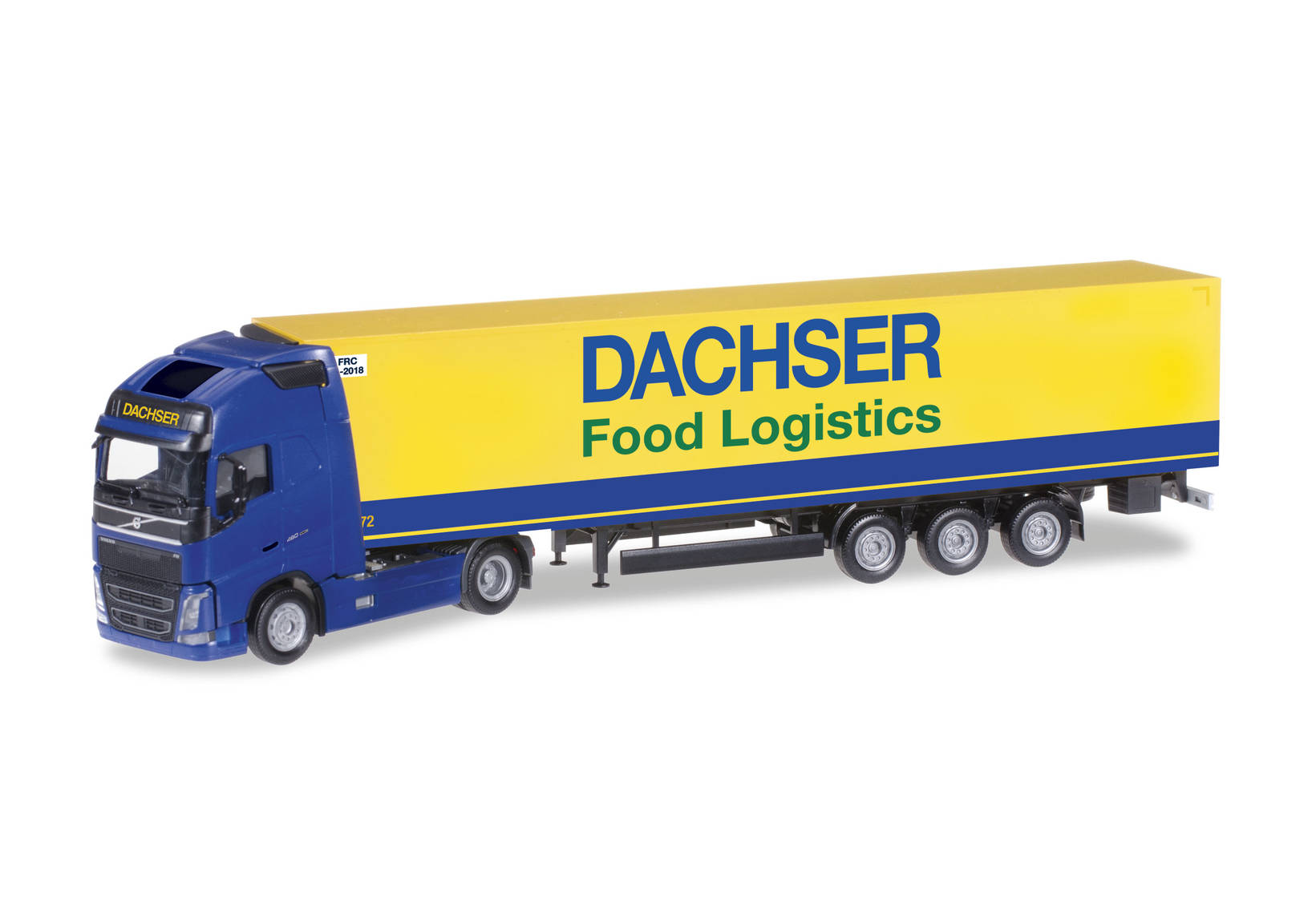 The internationally operating transport company Dachser provided the original for this Volvo semitrailer. The rigid tractor hauls a refrigerated trailer referring to its food load with the refrigeration unit and writing.