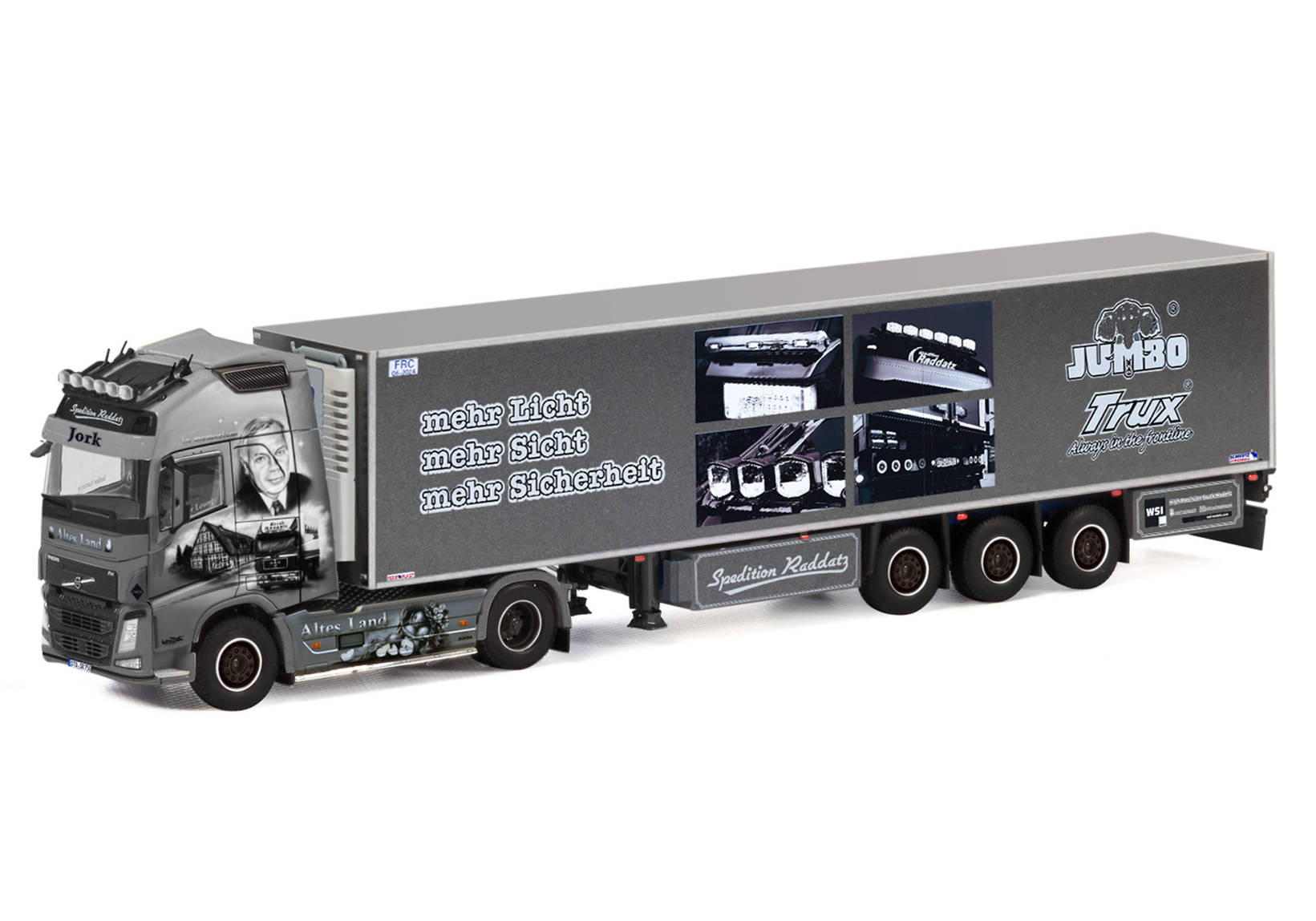 Exclusively for Herpa, WSI produces this beautiful articulated truck as a high-quality miniature model in the 1/50 scale in a small, limited edition. Contrary to initial illustrations, the shipping company had to remove the black Trux ram protection, which is why the model will also be delivered without ram protection.