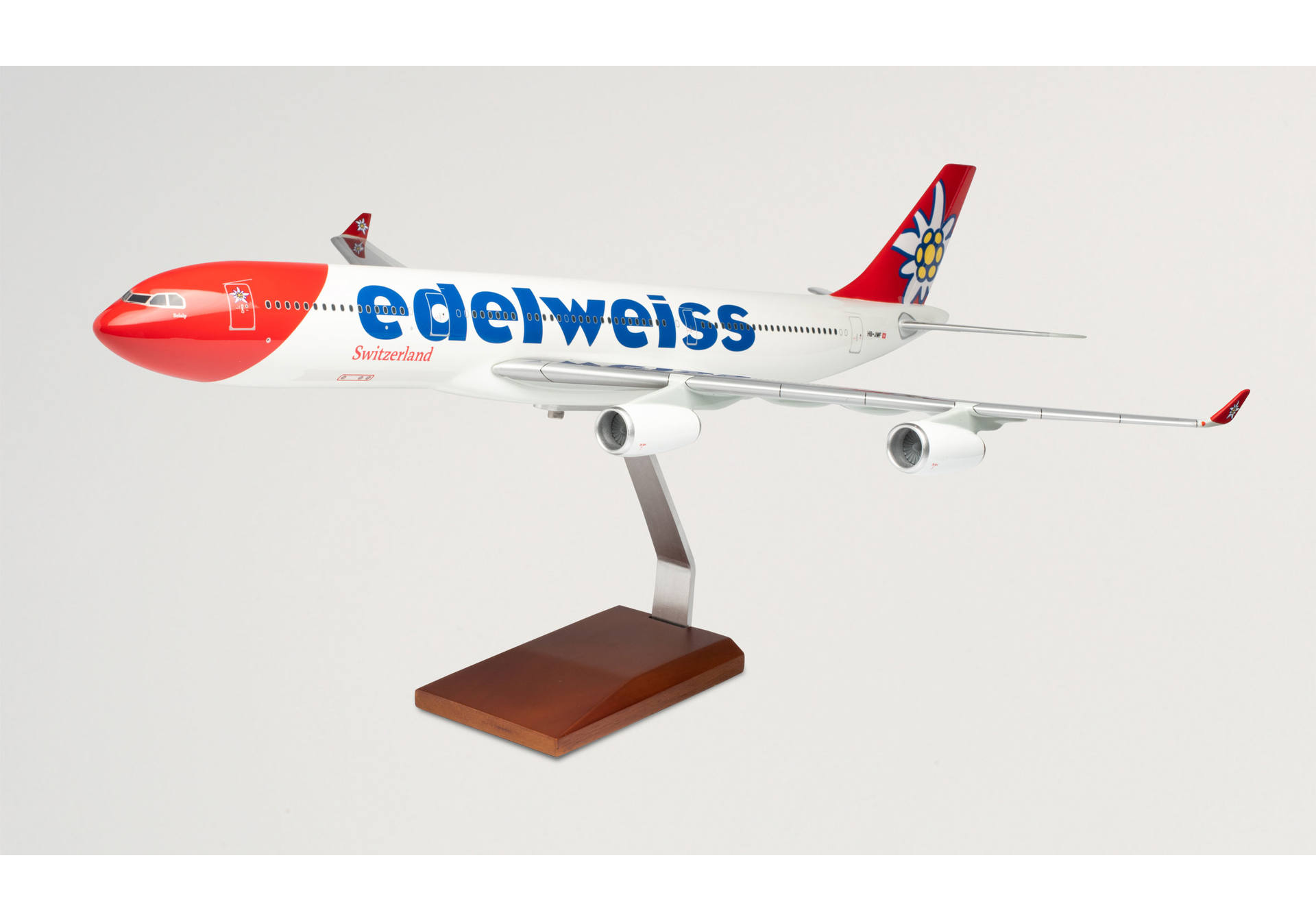 Die auf den Bergort Belalp im Kanton Wallis getaufte A340 sorgt mit dem hohen Service-Niveau an Bord, für den Edelweiss bekannt ist, für einen angenehmen Start bzw. für ein entspanntes Ende einer Urlaubsreise nach Nord- oder Zentralamerika, zu Zielen am Indischen Ozean oder nach Ostasien. Mit einer Länge von 63,7 cm, einer Spannweite von 60,3 cm und der auffälligen Bemalung mit dem großen Edelweiß am Leitwerk weckt das Modell in Ihrem Zuhause sicher Urlaubsstimmung und Fernweh. Die Modelle der Herpa Handcrafted Series werden exklusiv für Fluggesellschaften und Industriekunden in Kleinserien produziert und gerne als exklusive Geschenke oder zur Ausstellung auf Messen oder Pressekonferenzen verwendet. Jedes einzelne Stück wird per Hand aus Resin gefertigt und mit einem eleganten und stabilen Holzstand ausgeliefert. Ein exklusives Stück Handwerkskunst, made by Herpa.