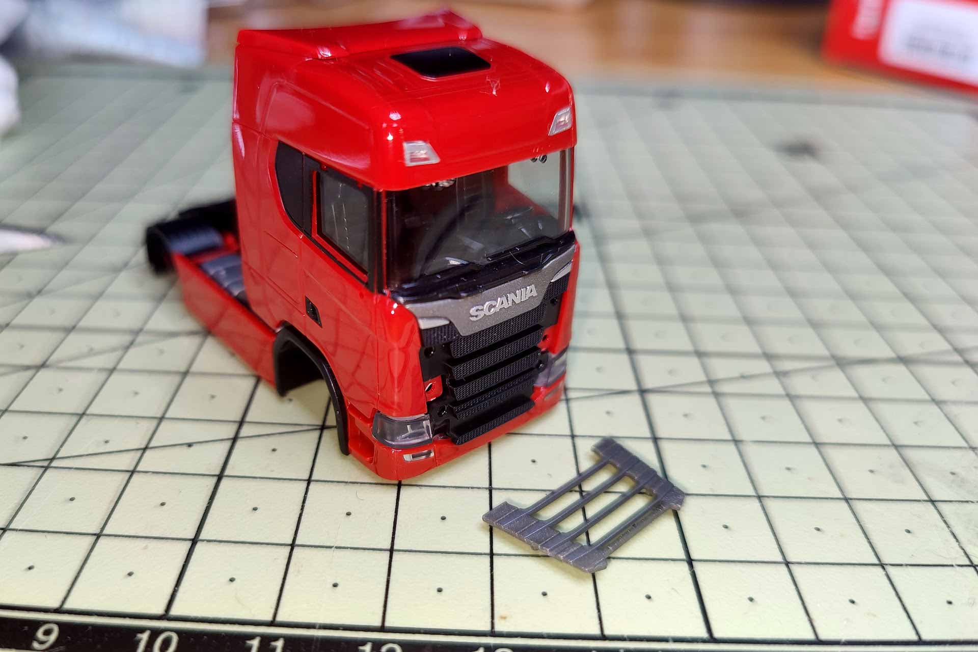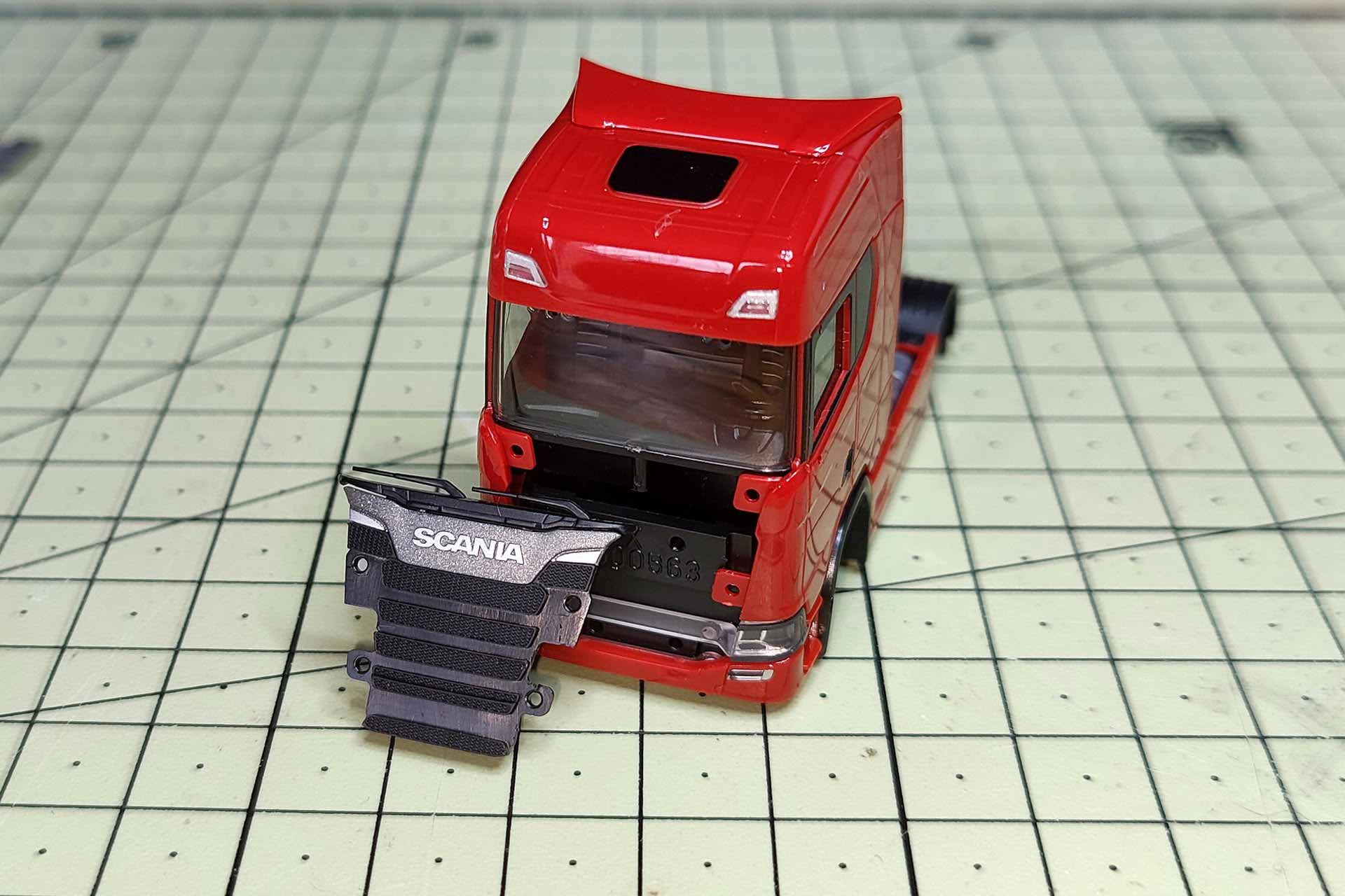 Nun wird das hintere Element mit den feinen Lüftungsgittern auf gleiche Art nach vorn gehebelt. Es trägt das Oberteil mit dem Scania-Emblem. Das Signet kann, muss aber nicht, getrennt werden.
