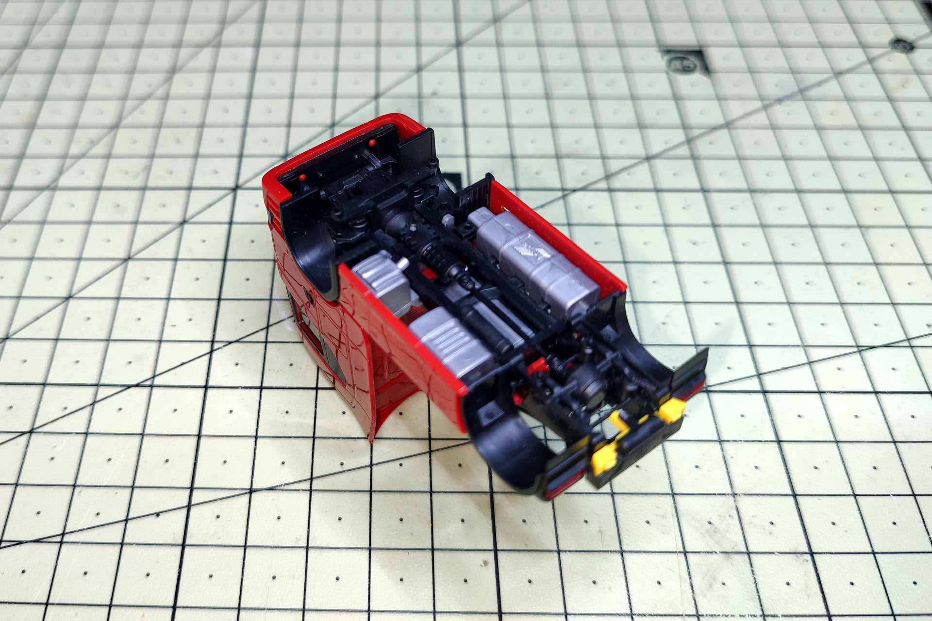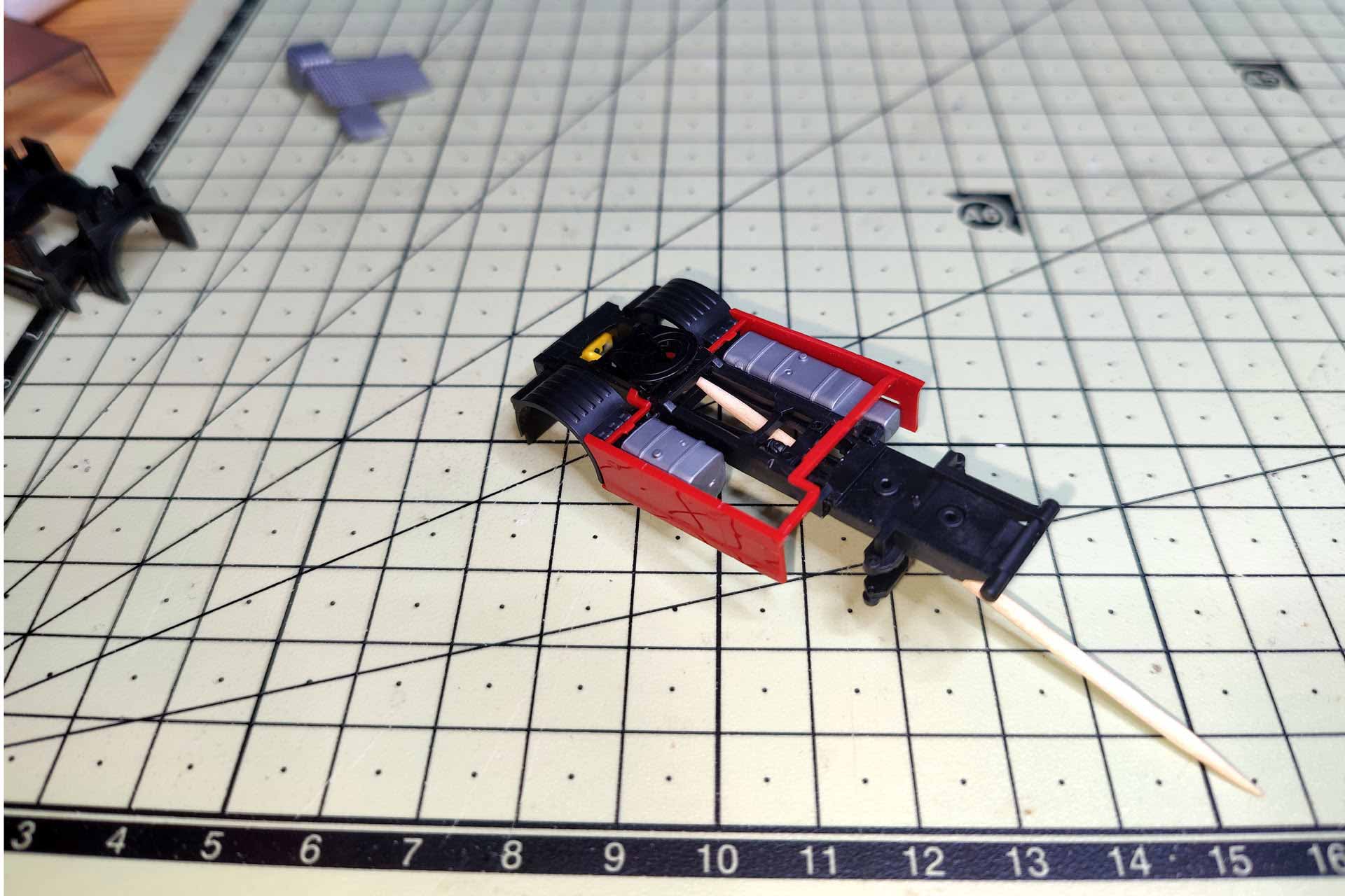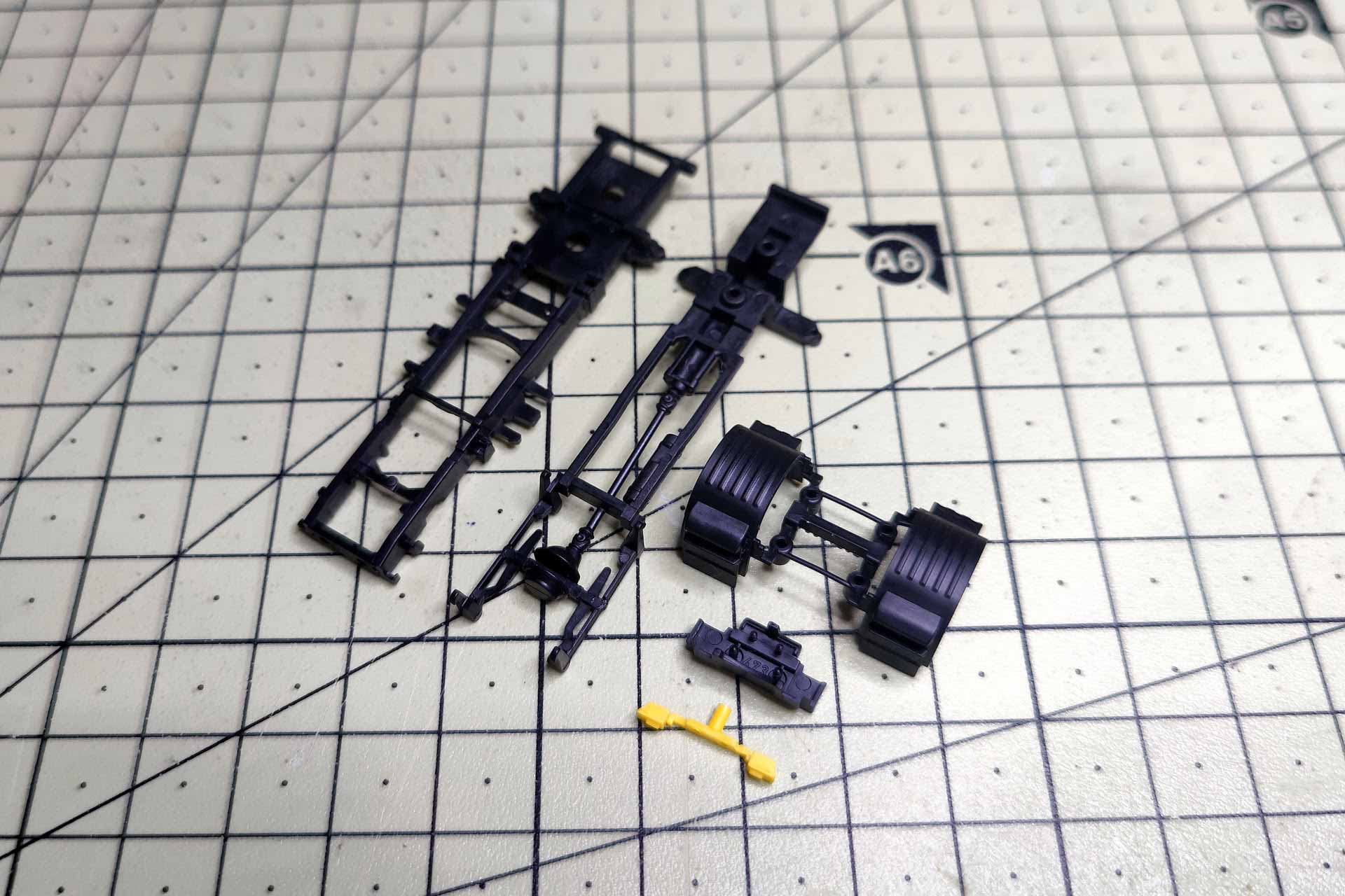 Die Rücklichter sind, ebenso wie die seitlichen Anbauten, schnell abzuziehen. Der Halter für die gelben Bremsklötze ist aufgesteckt. Abgezogen lassen sich die Bremsklötze ebenfalls entnehmen. Im Bereich der Antriebsachse verfügt das Unterteil des zweiteiligen Fahrgestells über 4 Clips, ähnlich der Sattelplatte. Sie werden vorsichtig ausgehakt. Abschließend werden die beiden Teile in Richtung Front auseinander geklappt. Im Motorbereich sind die zwei Teile nochmals ineinandergesteckt. Abschließend wird der Radkasten an den Stiften in den Luftbälgen mit einem Skalpell vom Fahrgestell getrennt.