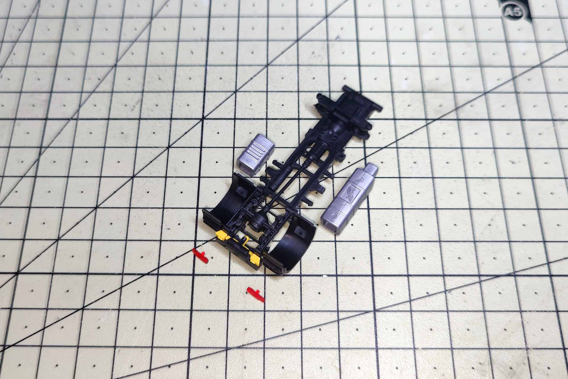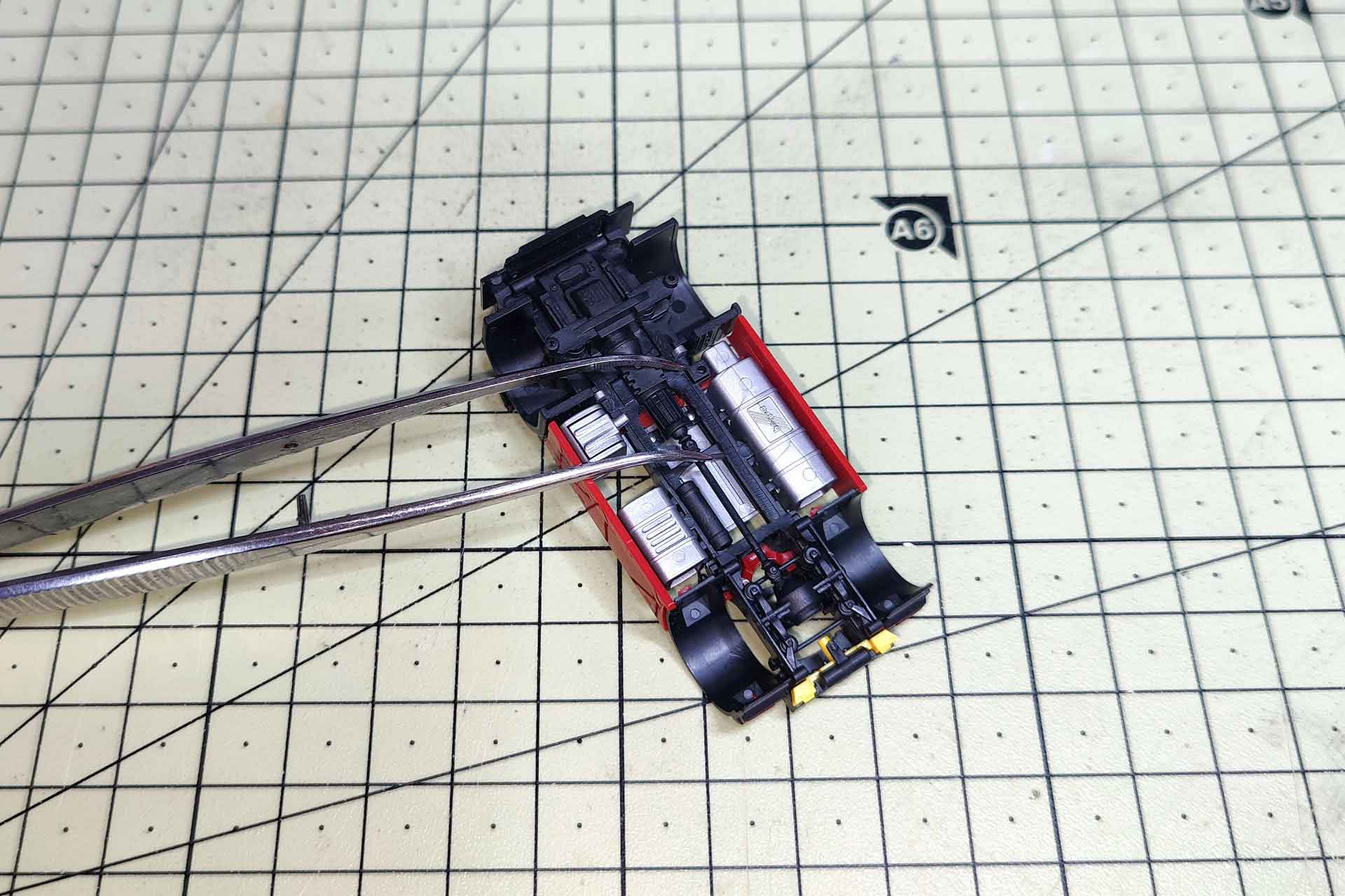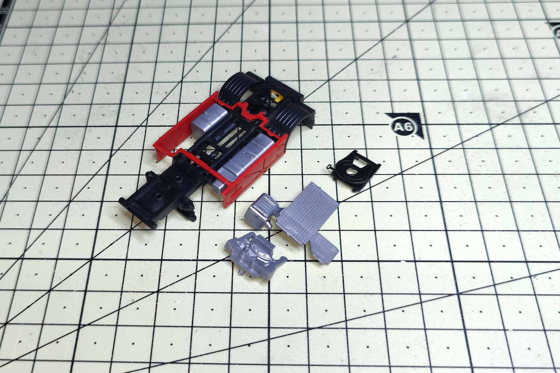 Die Rücklichter sind, ebenso wie die seitlichen Anbauten, schnell abzuziehen. Der Halter für die gelben Bremsklötze ist aufgesteckt. Abgezogen lassen sich die Bremsklötze ebenfalls entnehmen. Im Bereich der Antriebsachse verfügt das Unterteil des zweiteiligen Fahrgestells über 4 Clips, ähnlich der Sattelplatte. Sie werden vorsichtig ausgehakt. Abschließend werden die beiden Teile in Richtung Front auseinander geklappt. Im Motorbereich sind die zwei Teile nochmals ineinandergesteckt. Abschließend wird der Radkasten an den Stiften in den Luftbälgen mit einem Skalpell vom Fahrgestell getrennt.