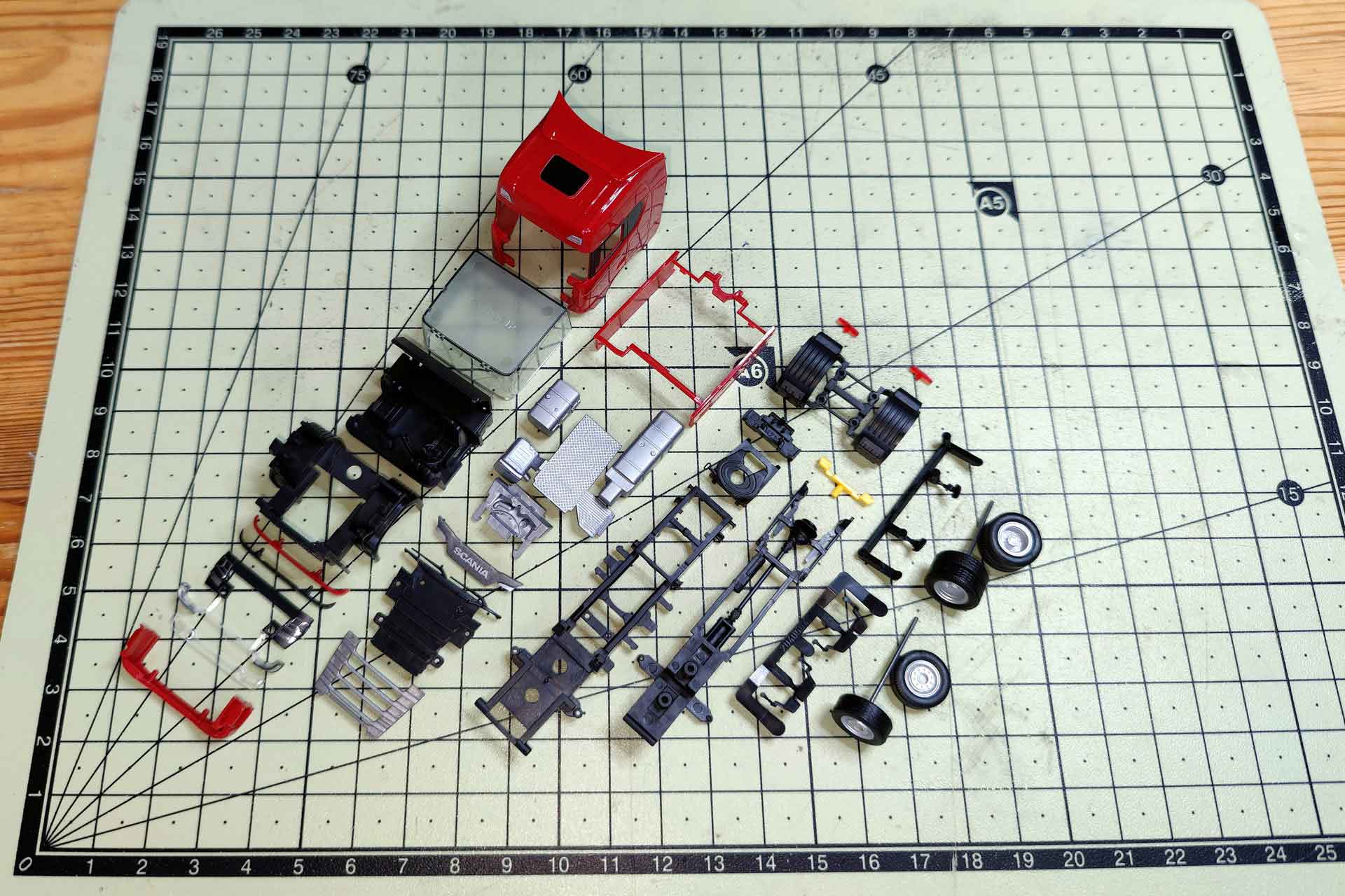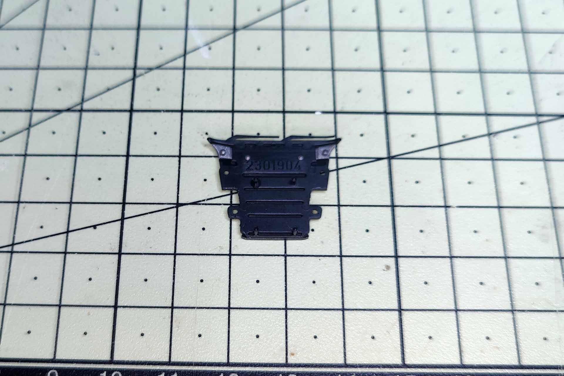 Die zweiteilige Sonnenblende wird bereits zur Herausforderung und muss von unten betrachtet nach vorn herausgehebelt werden. Danach folgt der Kühlergrill, vermutlich zurzeit die komplexeste Einheit aller Modelle. Egal, ob ein- oder mehrfarbig, Rippen und Lüftungsgitter sind separate Teile, die nacheinander seitlich mit dem Skalpell nach vorn gehebelt werden. Das Gitter verfügt über vier Stifte, die Zug um Zug auf beiden Seiten zu lösen sind.