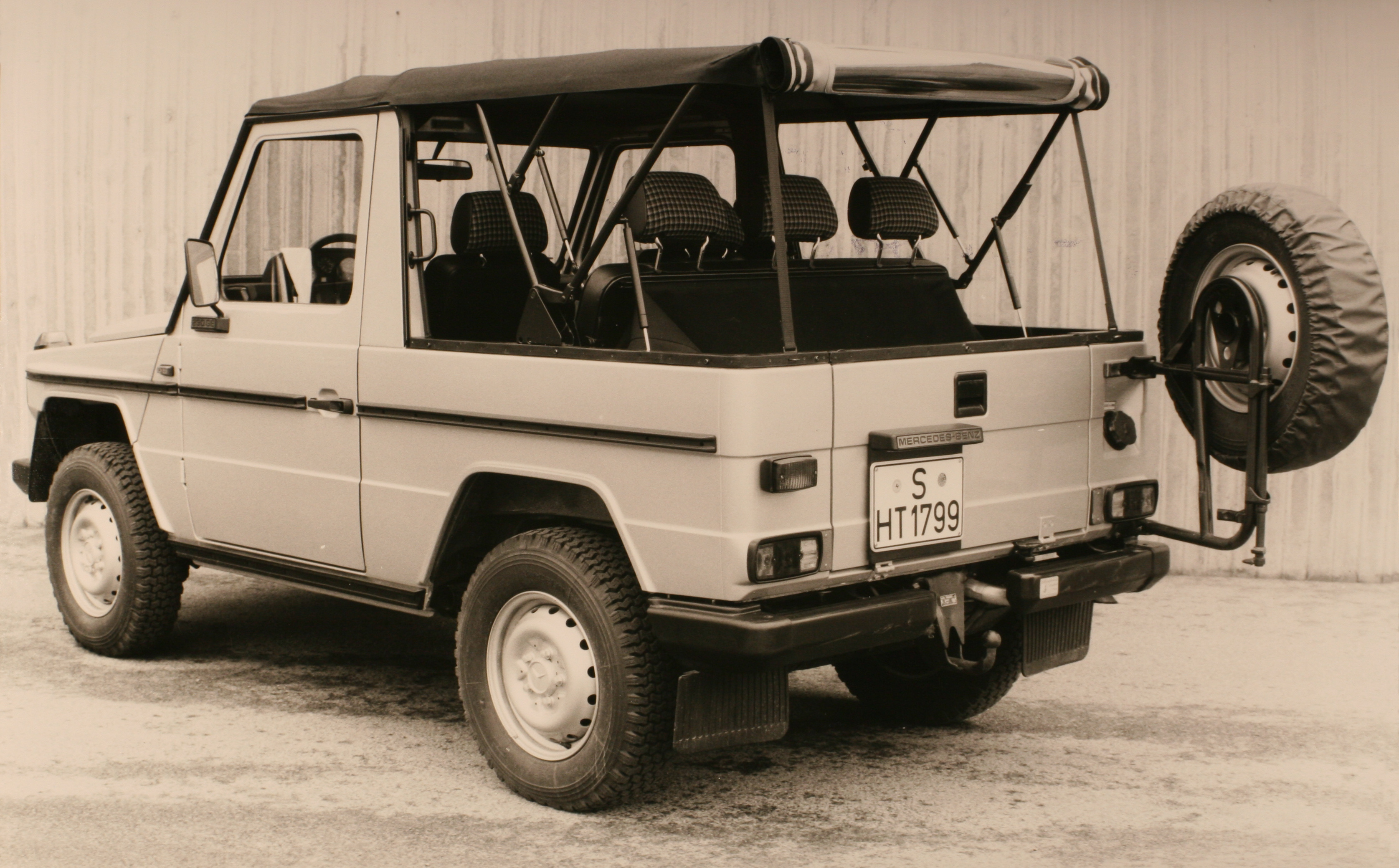 Nach langer Abstinenz kommt nun das offene Mercedes G-Modell (damals hieß der Wagen noch nicht G-Klasse) in Rot zurück, nun nicht mehr als aktuelles Fahrzeug. Wenn ein Auto älter als 30 Jahre ist, gilt es per definitionem als Oldtimer und darf mit H-Kennzeichen fahren. Das trifft auch für einen Mercedes G zu, wenngleich er optisch kaum verändert noch heute fabrikneu vom Band läuft.