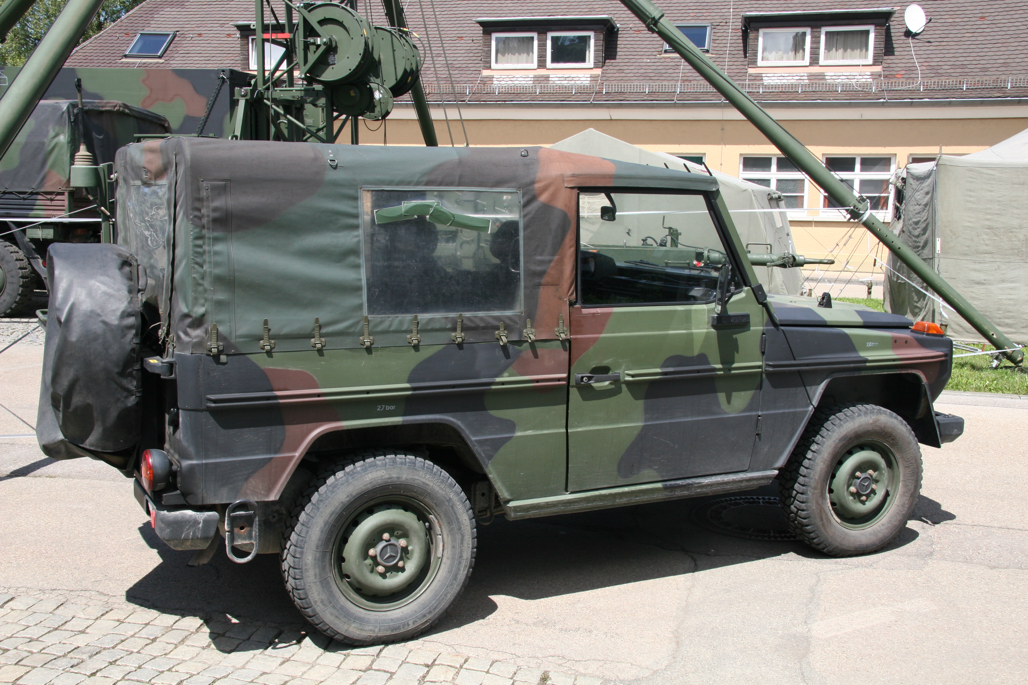 Im Prinzip schon das gleiche Auto wie der offene Planenwagen, aber doch nicht: Die Militärausführung heißt Wolf und war der Standard-Militärgeländewagen der dritten Bundeswehr-Generation. Er hat eine umlegbare Windschutzscheibe.