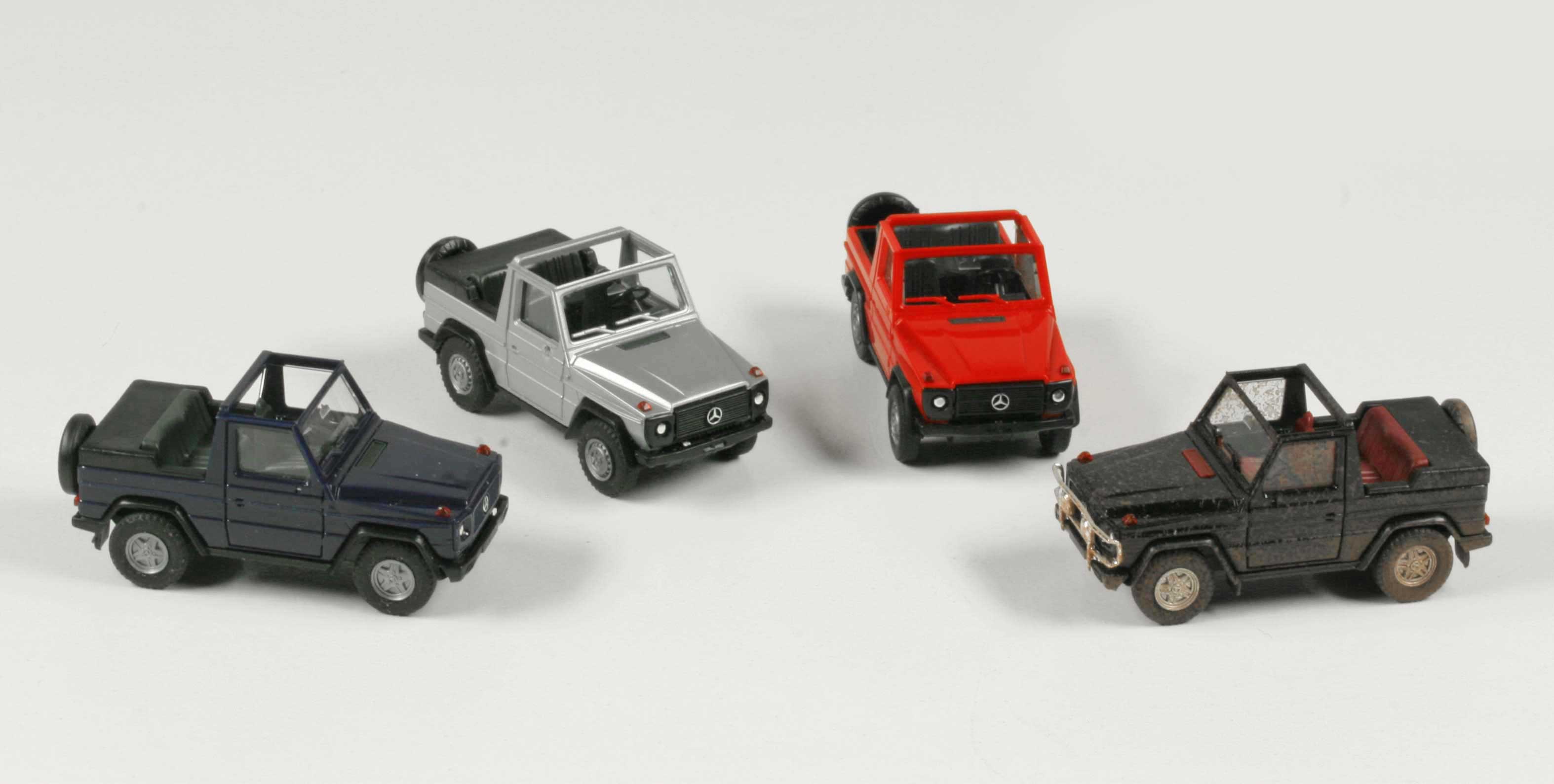 Dass Herpa seine Miniatur nach relativ kurzer Verweildauer im Programm vom 230 GE zum 300 GE empor hievte, war schlichtweg dem Trend beim Vorbild geschuldet: weg vom Vierzylinder, hin zum Sechsender. Den Station Wagon mit kurzem Radstand gab es bis 2012, das Cabrio lebte ein Jahr länger (Abschied mit einem Sondermodell namens G 500 Final Edition 200 mit Verdeck in Hellbeige). Seither gibt es nur noch den langen G.