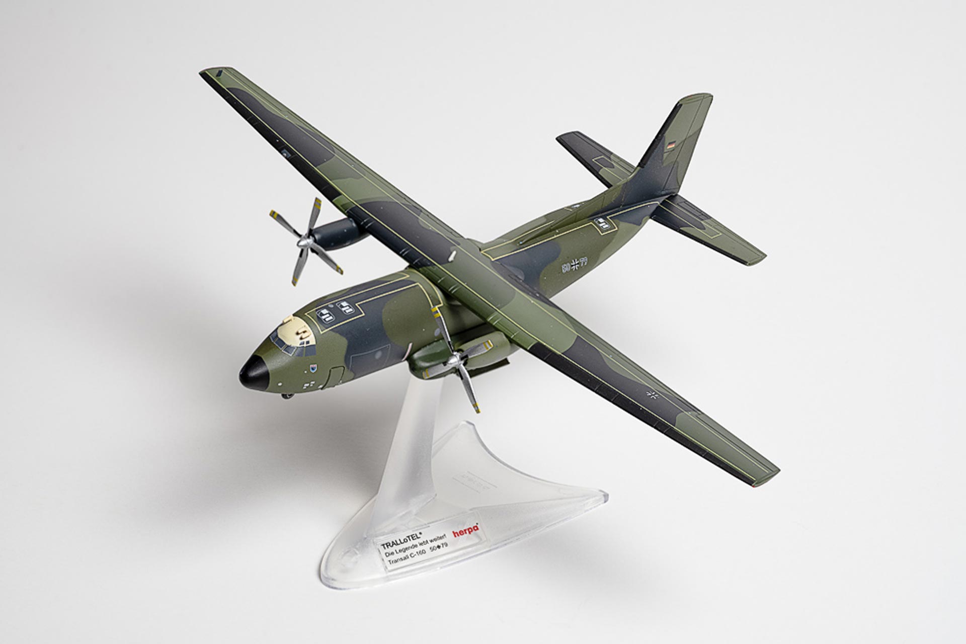 Metallmodell des Zweibrücker TRALLoTEL® im Maßstab 1/200 (Herpa-Modell-Nr. 572309). Mit beschriftetem Ständer, schützender Box in passendem Camouflage mit beschreibendem Text, dem Wappen des Lufttransportgeschwaders 63 sowie Fotos vom 7. Dezember 2021, dem Landetag der 50+79 in Zweibrücken. Limitiert und nummeriert auf 500 Exemplare. Den original TRALLoTEL®-Schlüsselanhänger gibt es wahlweise in Rot oder Grün dazu (bitte bei Bemerkungen angeben). Die ersten 300 Besteller bekommen außerdem den offiziellen Flyout-Patch des LTG 63 in Hohn, dem ehemaligen Heimatflugplatz dieser Transall kostenlos dazu. Bestellbar ist das Modell exklusiv unter www.trallotel.de zum Preis von 119,90 Euro. Von jedem Modell gehen 10,00 Euro an die Initiative „Hilfe für Bundeswehrkinder in Not“.