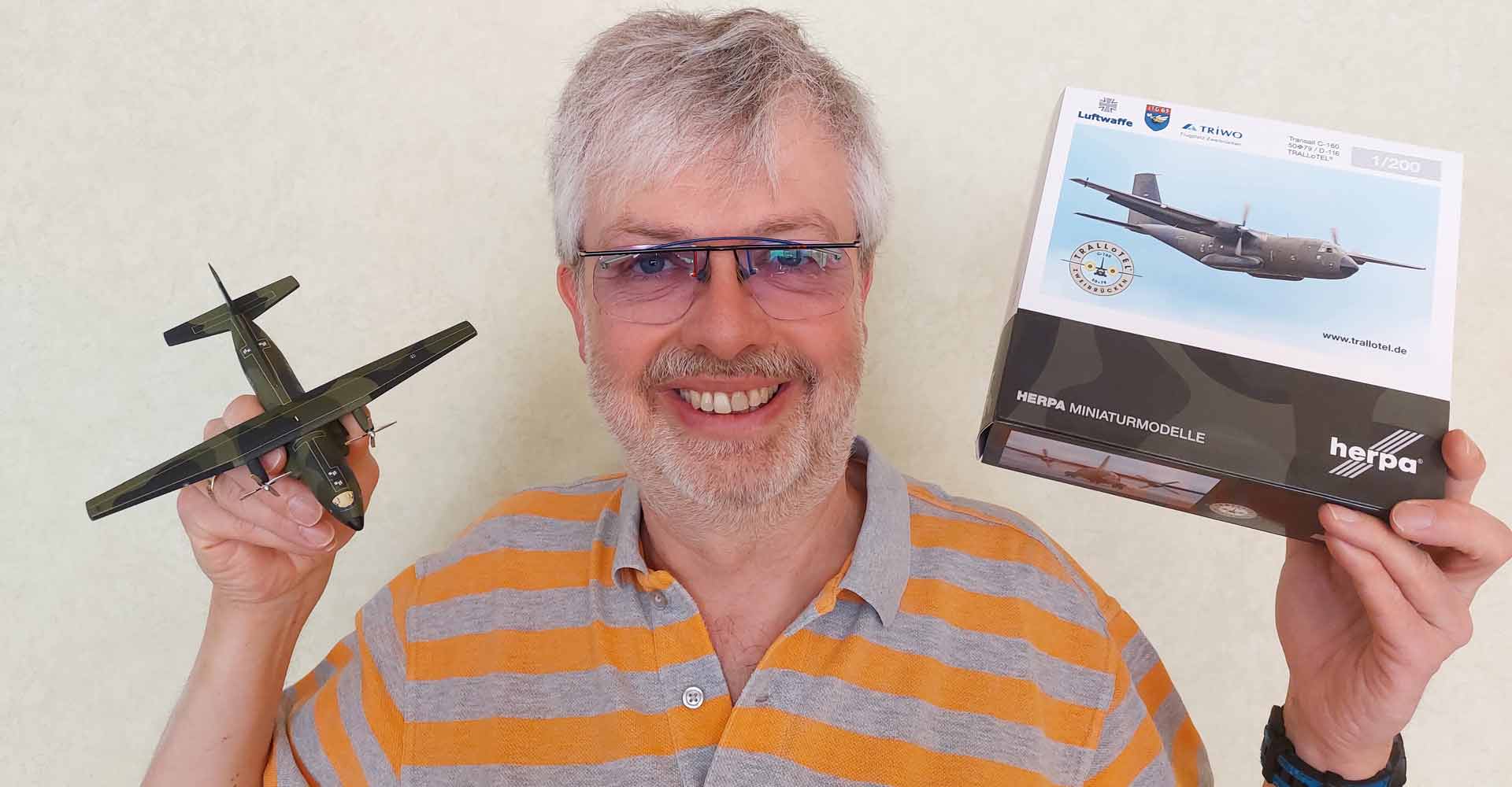 Der stolze Besitzer des Trallotels im großen und im kleinen Maßstab. Dominik Weil vertreibt das Herpa-Modell in 1/200 exklusiv unter www.trallotel.de Bild: Dominik Weil