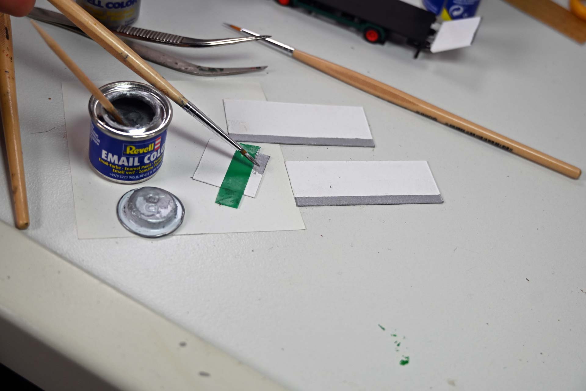 Die Malerarbeiten erfolgen mit einem dünnen Pinsel (00) und seidenmatter schwarzer Farbe (z. B. Revell 302). Wer am Fahrzeugboden noch etwas mehr Kontrast schaffen möchte, kann auch die ab Werk dunkelgrün angelegten Schmutzfänger schwarz einfärben.