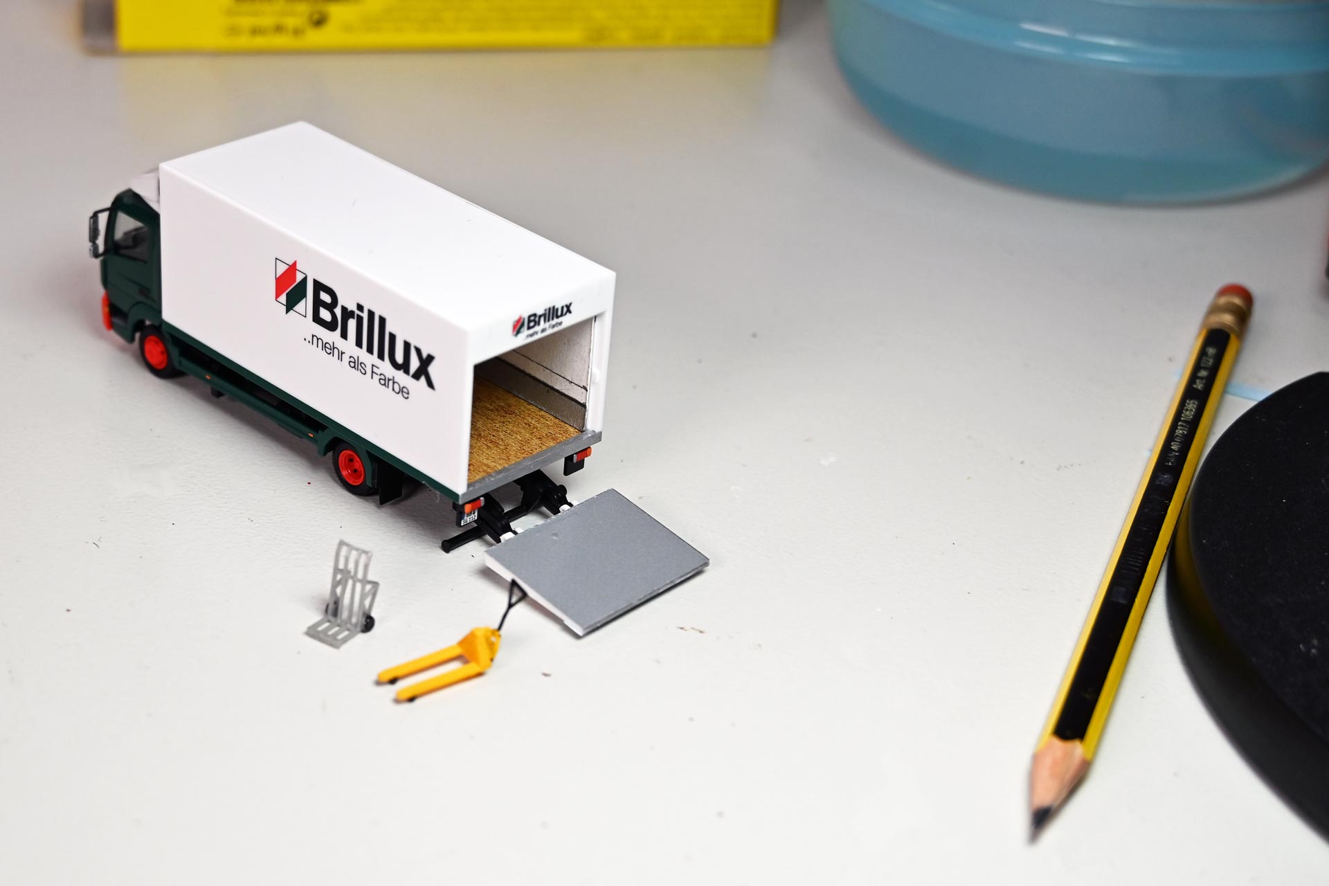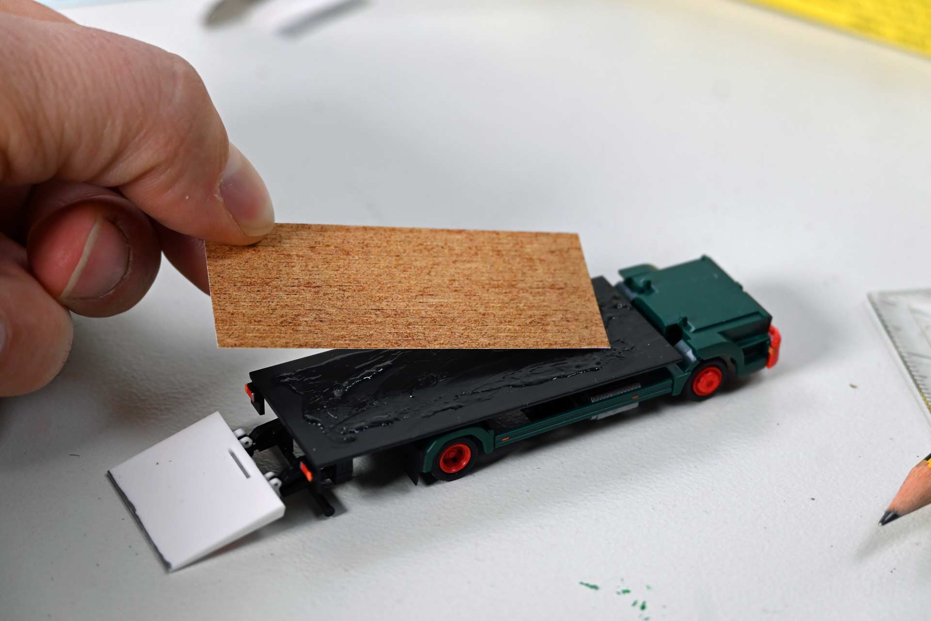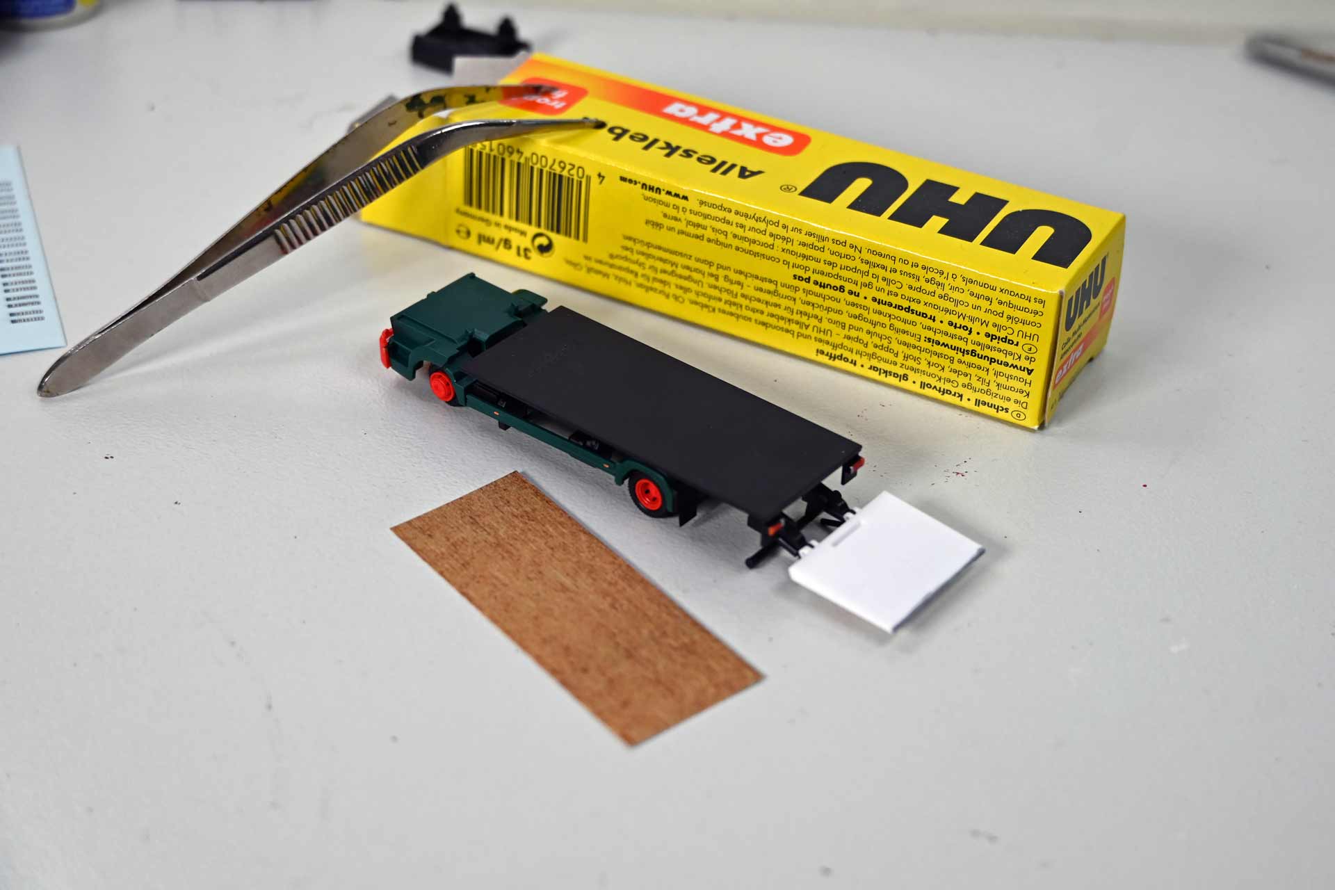 Für die Modellumsetzung benötigt der Bastler zunächst die Nachbildung eines Holzbodens für die Ladefläche sowie Riffelblech für Laderampe und Innenwände. Weitere Details, wie Nassschiebebilder mit aktuellen Kfz-Kennzeichen und Farben, um Details wie Rücklichten und Blinker hervorzuheben, komplettieren die Materialiste.
