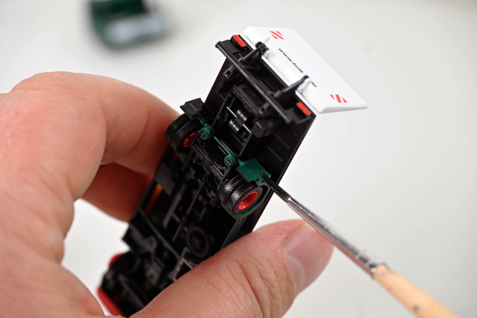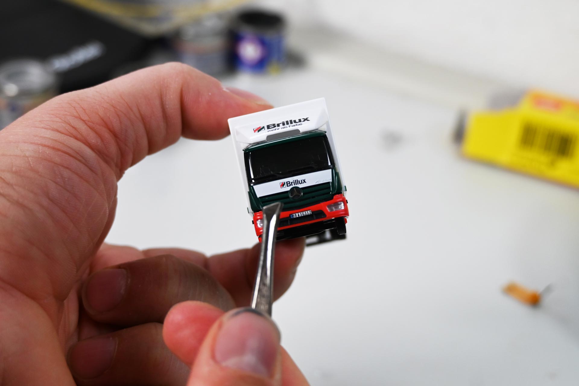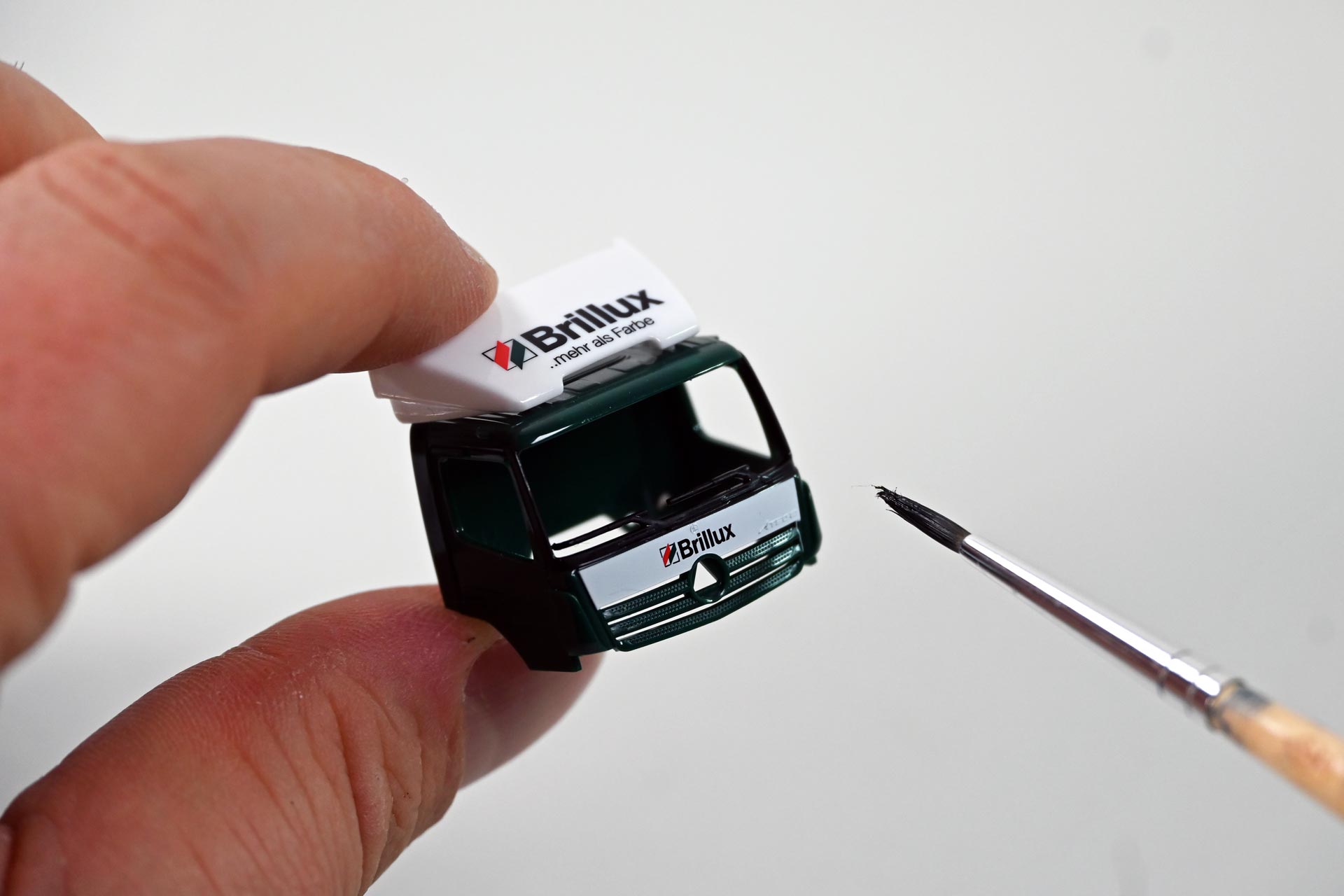 Für die meisten Arbeiten genügt es, den Kofferaufbau abzuheben oder die Plane von der Pritsche zu entfernen. Im Fall des Brillux-Ategos soll die Scheibenwischer auch an den Innenkanten mit schwarzer Farbe ausgelegt werden. Hierzu muss man das Fahrerhaus zunächst vorsichtig an der Rückseite vom Chassis abklipsen und anschließend durch vorsichtiges Bewegen so lange lockern, bis sich der Mercedes-Stern, der alle Bauteile fixiert, heraus lösen lässt.