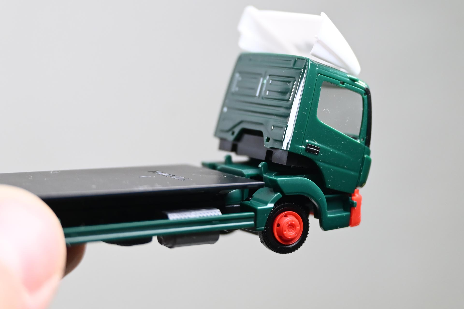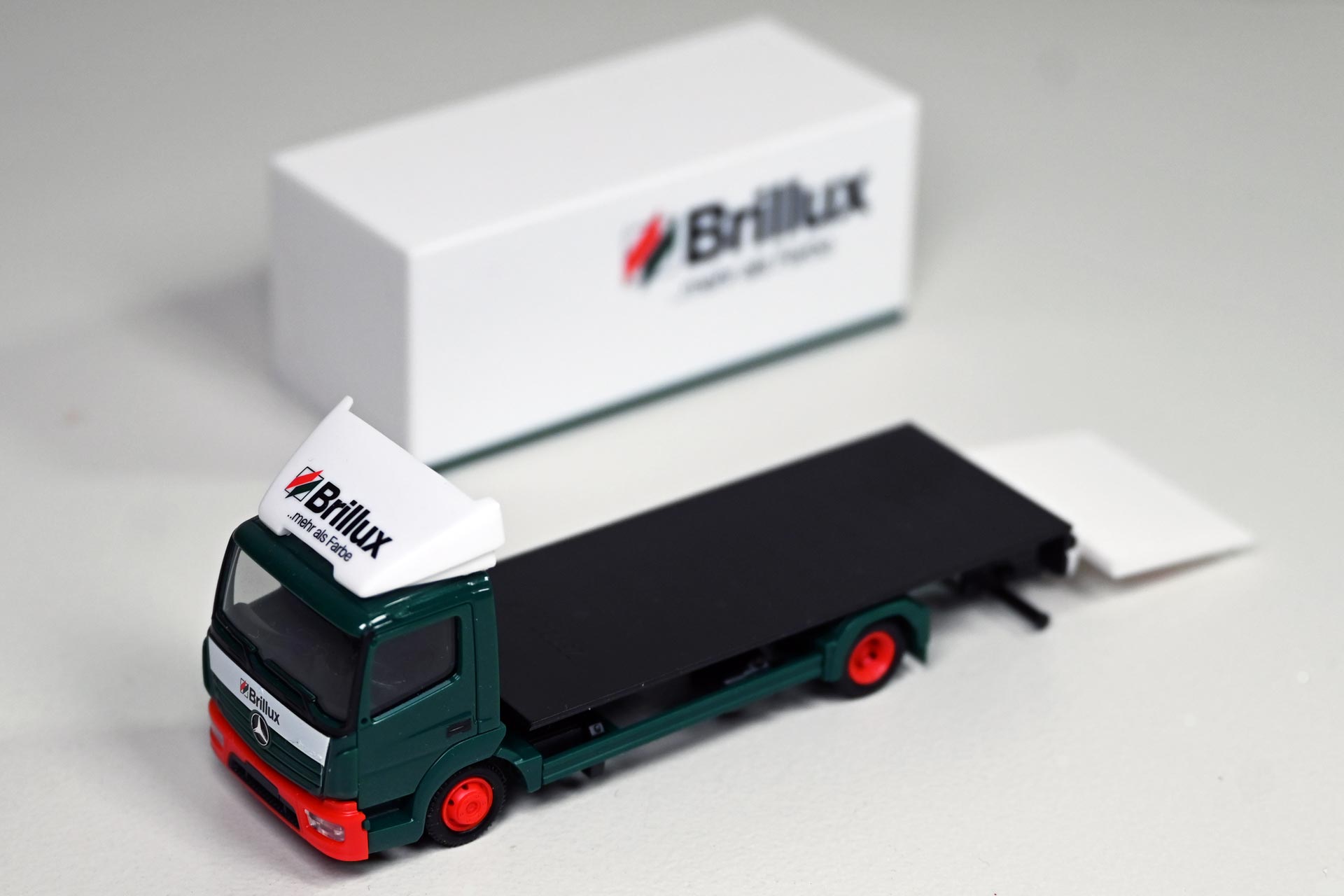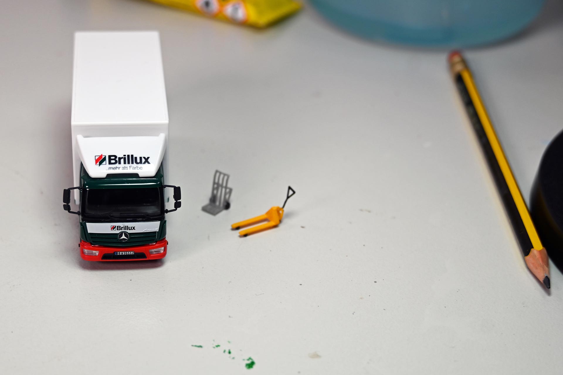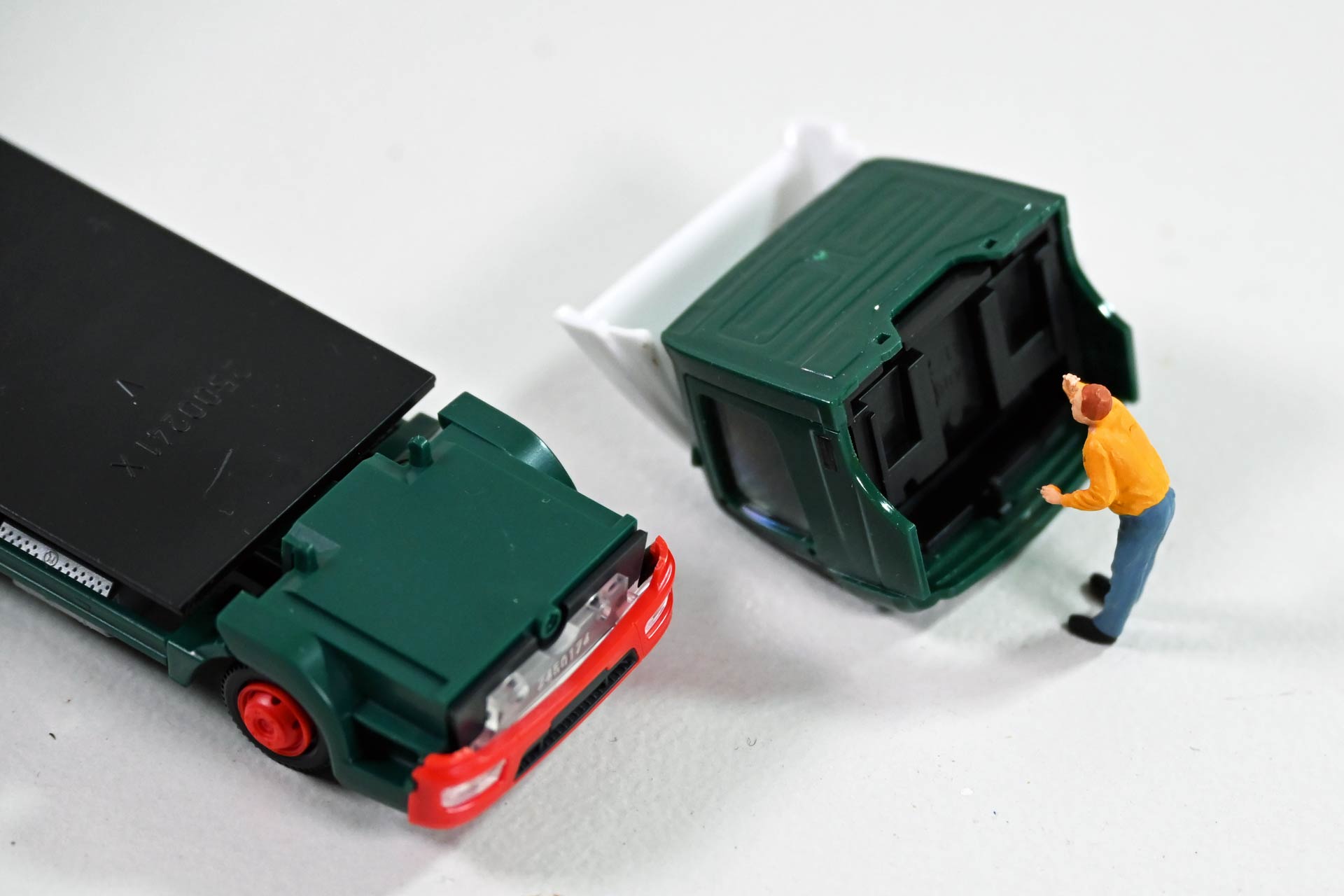 Für die meisten Arbeiten genügt es, den Kofferaufbau abzuheben oder die Plane von der Pritsche zu entfernen. Im Fall des Brillux-Ategos soll die Scheibenwischer auch an den Innenkanten mit schwarzer Farbe ausgelegt werden. Hierzu muss man das Fahrerhaus zunächst vorsichtig an der Rückseite vom Chassis abklipsen und anschließend durch vorsichtiges Bewegen so lange lockern, bis sich der Mercedes-Stern, der alle Bauteile fixiert, heraus lösen lässt.