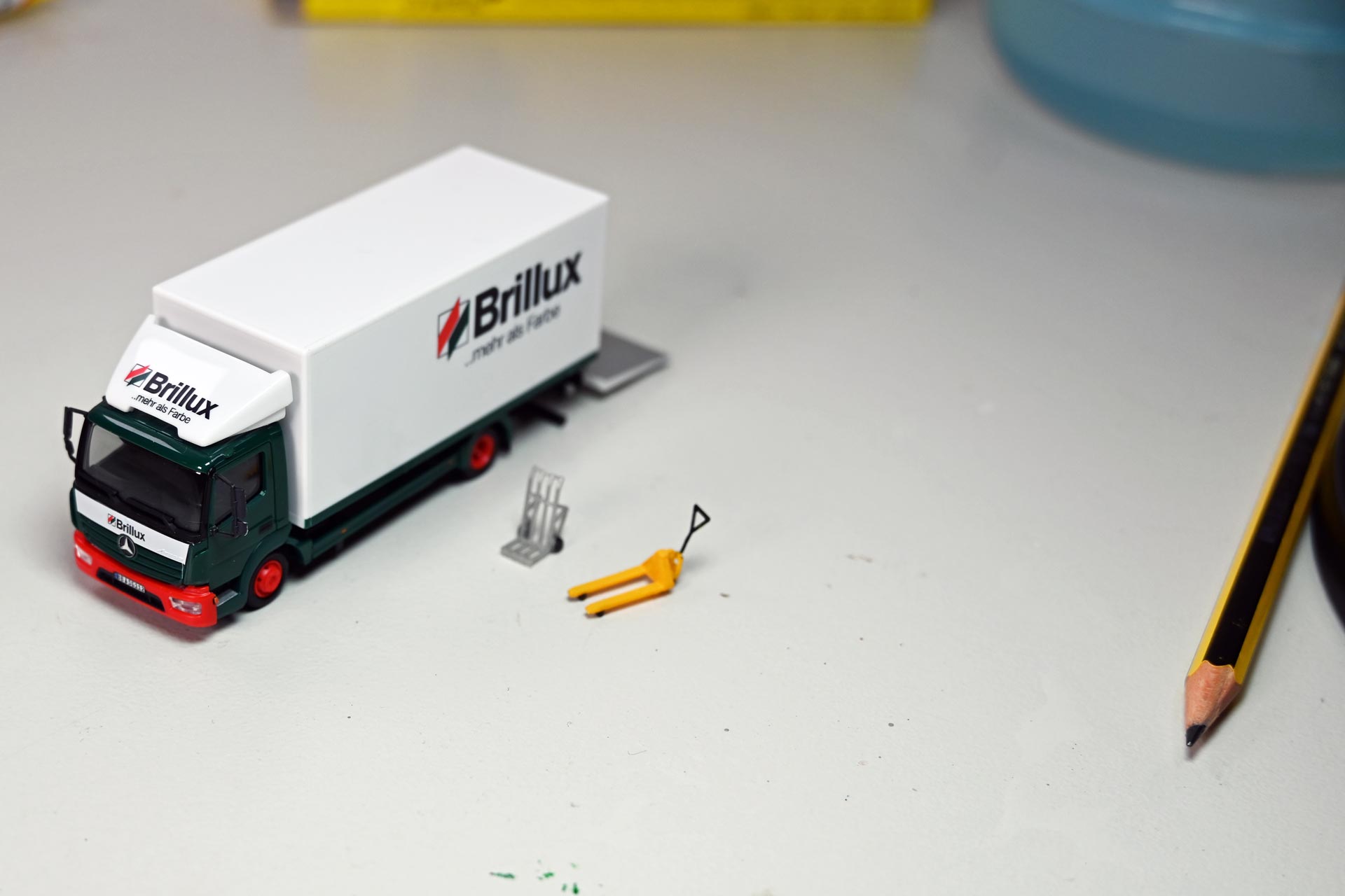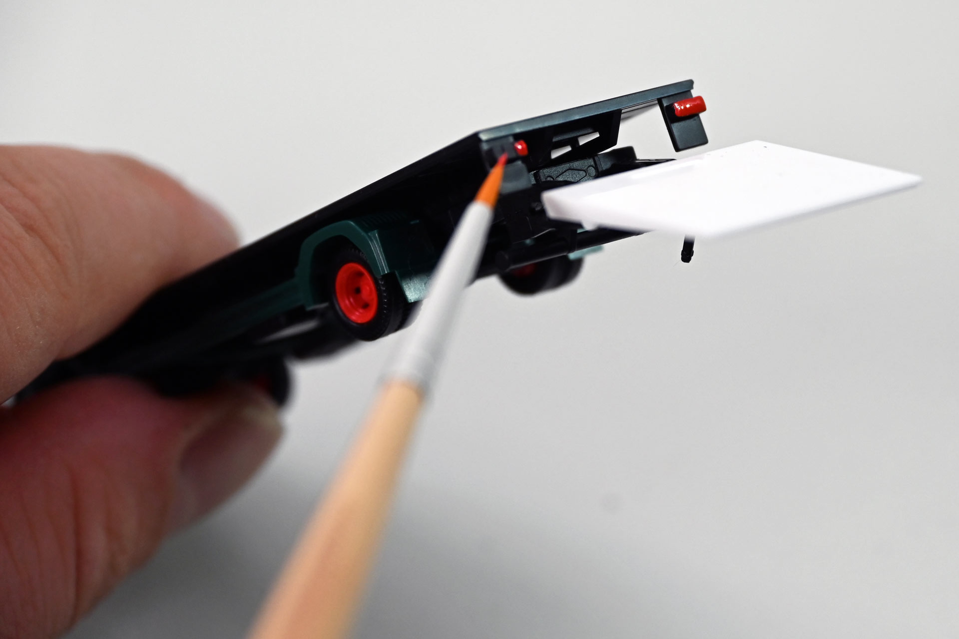 Ist der Kofferaufbau entfernt, lassen sich auch die Rücklicher recht leicht in verschiedenen Farben akzentuieren. Es empfiehlt sich dabei geplant vorzugehen, so lassen sich mit einem feinen Pinsel und orangener Farbe auch gleich die Reflektoren an der Fahrzeugseite hervorheben, silberne Farbe der Rückfahrscheinwerfer taugt zugleich für die Laderaumkante des Kofferaufbaus und für die Innenseite der Außenspiegel.