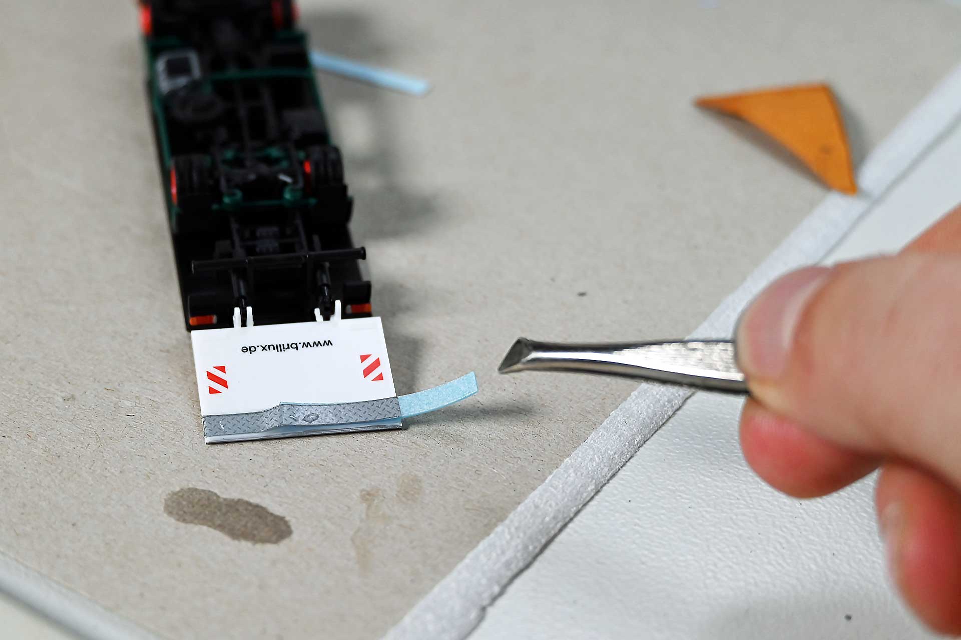 Auch hier hat der Bastler die Qual der Wahl: Fein geätzte Krähenfußbleche, etwa von Weinert, bieten sicher optisch die besten Ergebnisse, allerdings gilt auch hier das relativ hohe Gewicht zu bedenken, dass die Ladebordwand mögicherweise nicht mehr schließen lässt. Die Wahl fällt deshalb auf die etwas einfacher gestalteten, aber relativ preiswerten und federleichten Nassschiebebilder von TL Modellbau. Passend zugeschnitten entstehen sowohl die Innenverkleidung der Rampe als auch ein schmaler Schutzstreifen auf der Außenseite. Die dünnen Bildchen lassen sich mit einem scharfen Bastelmesser hervorragend bearbeiten. Einmal angebracht, scheinen sie zwar zum Faltenwurf zu neigen, nach vorsichtigem Andrücken passen sie sich dem Untergrund aber exakt an. Mehr Fingerspitzengefühl und filigranes Werkzeug benötigt der Bastler bei Anbringen der winzigen Nummernschilder. Zum Schluss müssen nun nur noch die Außenspiegel am Führerhaus befestigt werden – am Besten mit Hilfe eines Klebestifts, um keine unablösbaren Spuren zu hinterlassen.