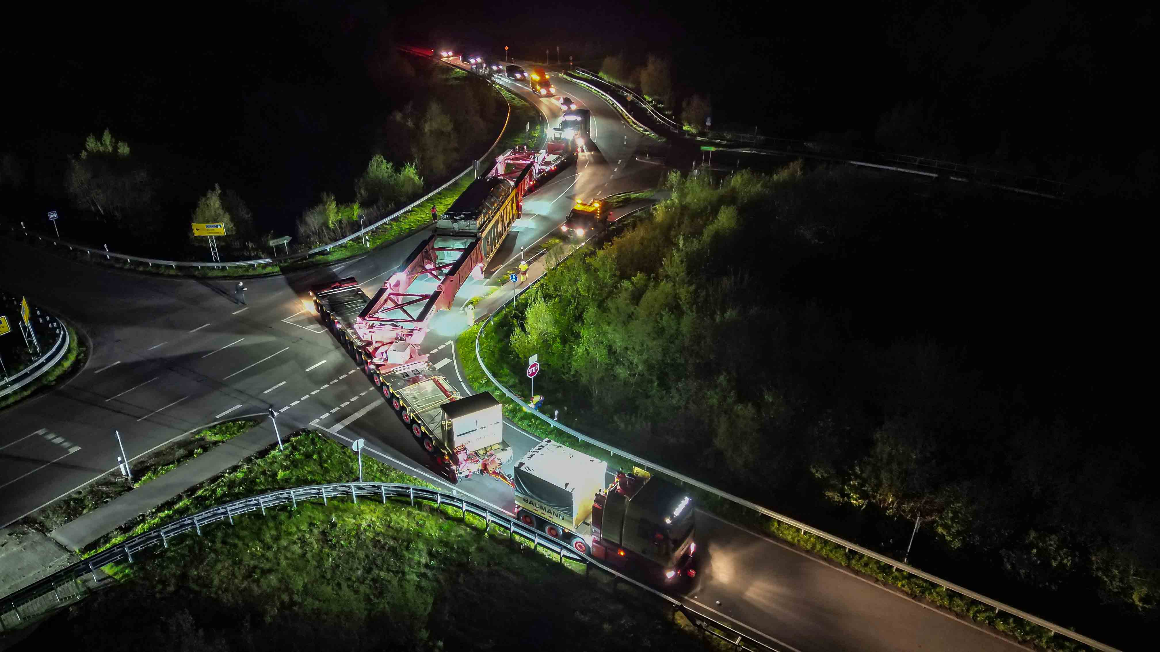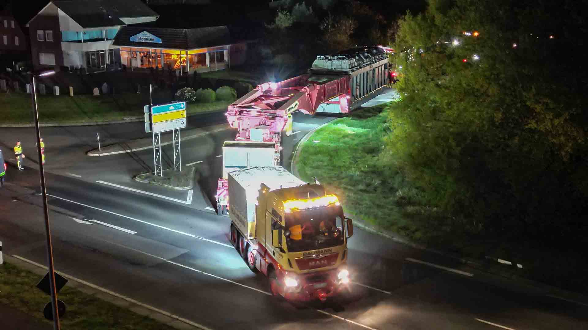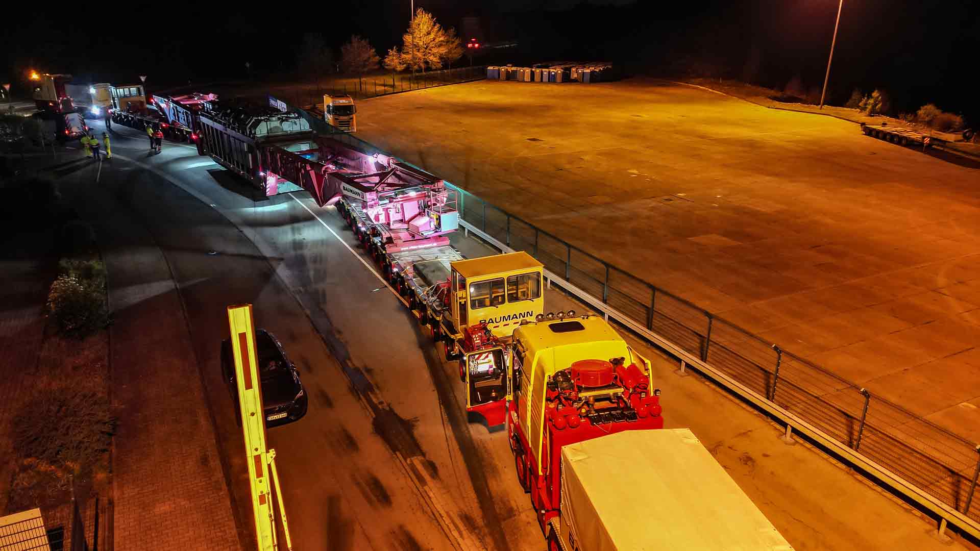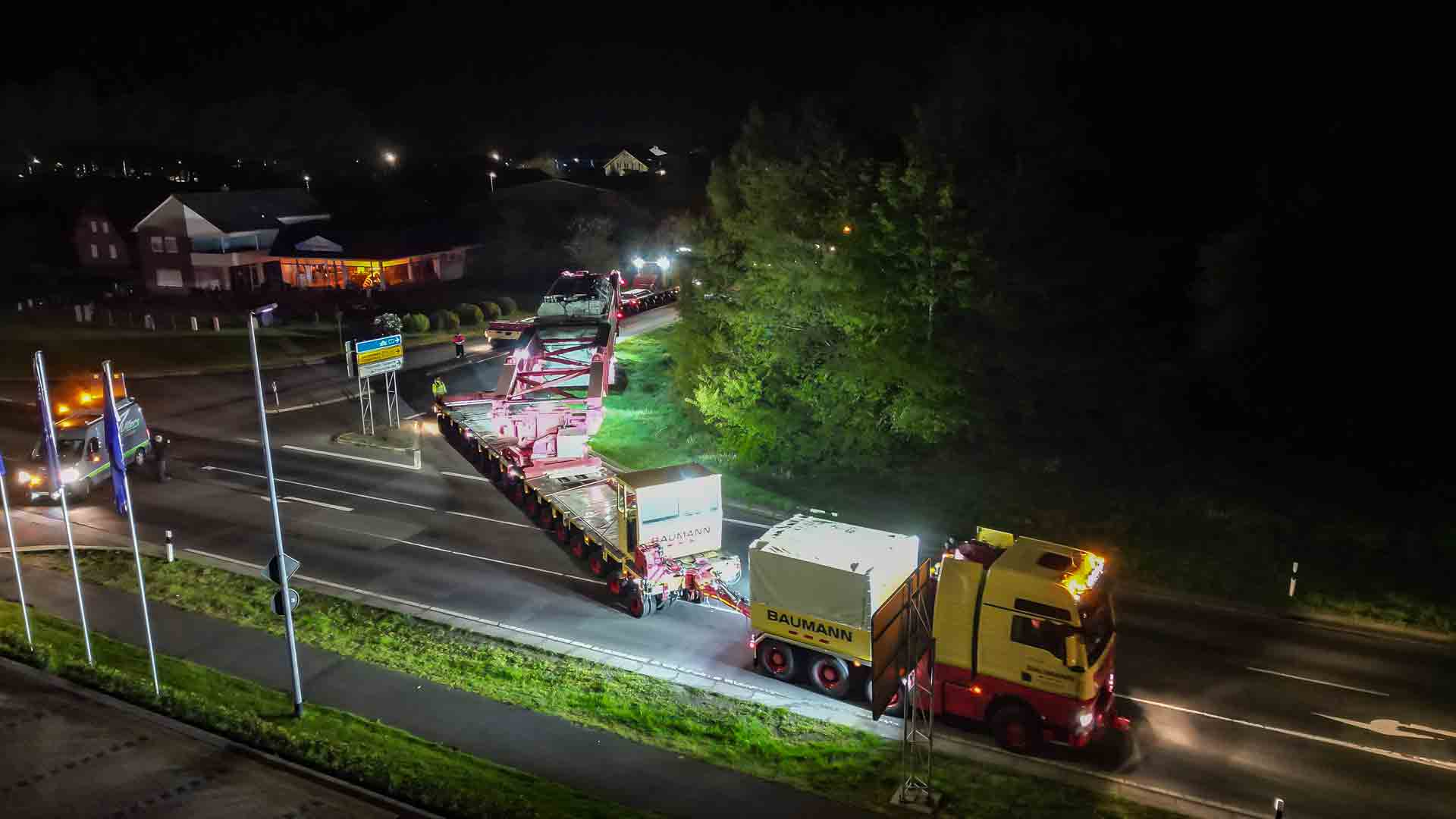 Im Emsland werden Schwertransporte nicht mehr von der Polizei begleitet. Hier übernehmen dies „Hilfspolizisten“, die für die Begleitung von Schwertransporten entsprechend ausgebildet sind. Unterstützt werden diese dabei von BF3-Fahrern. Pünktlich um 22:00 Uhr starten die Hilfspolizisten, um das erste, rund 1,5 Kilometer lange Teilstück der zweispurigen Friesoyther Straße für den Verkehr komplett zu sperren. Wenig später verlässt das lange Baumann-Gespann den c-Port Richtung Osten. Auf dem gesamten Streckenabschnitt gibt es keinerlei Straßenbeleuchtung. Auch der Kreuzungsbereich mit den Auf- und Abfahrten zur B72 ist komplett unbeleuchtet. Aus der Luft zeigt sich gut, dass das gesamte Gespann nicht nur die Trucks sondern die gesamte Umgebung taghell ausleuchtet. Für die Begleitcrew erleichtert die gute Sicht auf Ladung und mögliche Hindernisse das Einweisen und Vorwarnen der beiden Fahrer enorm. Hier muss im Normalfall niemand mit Taschenlampe in der Hand umherlaufen, um wirklich sicher zu sein, dass es keinen ungewollten Kontakt gibt.