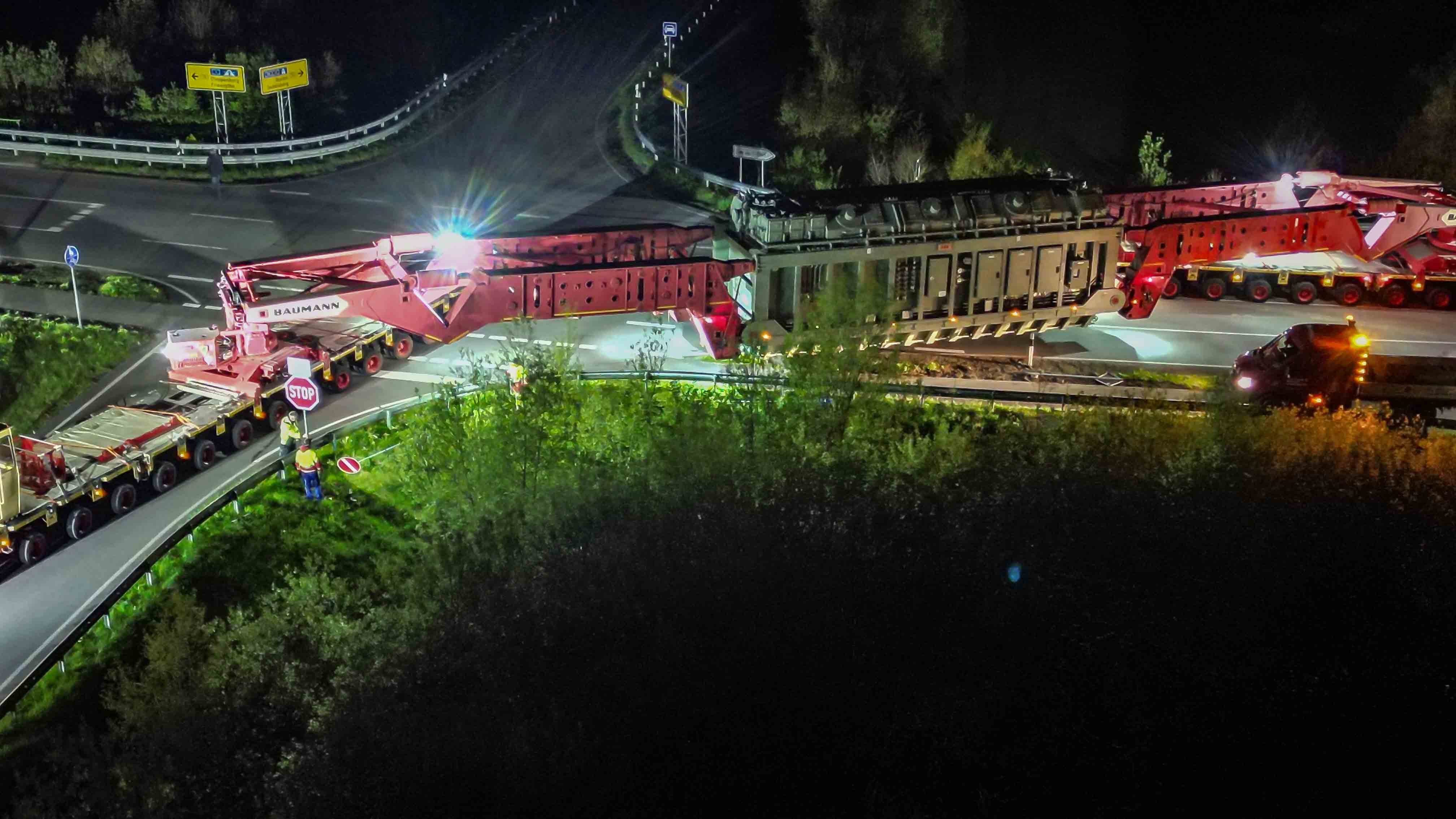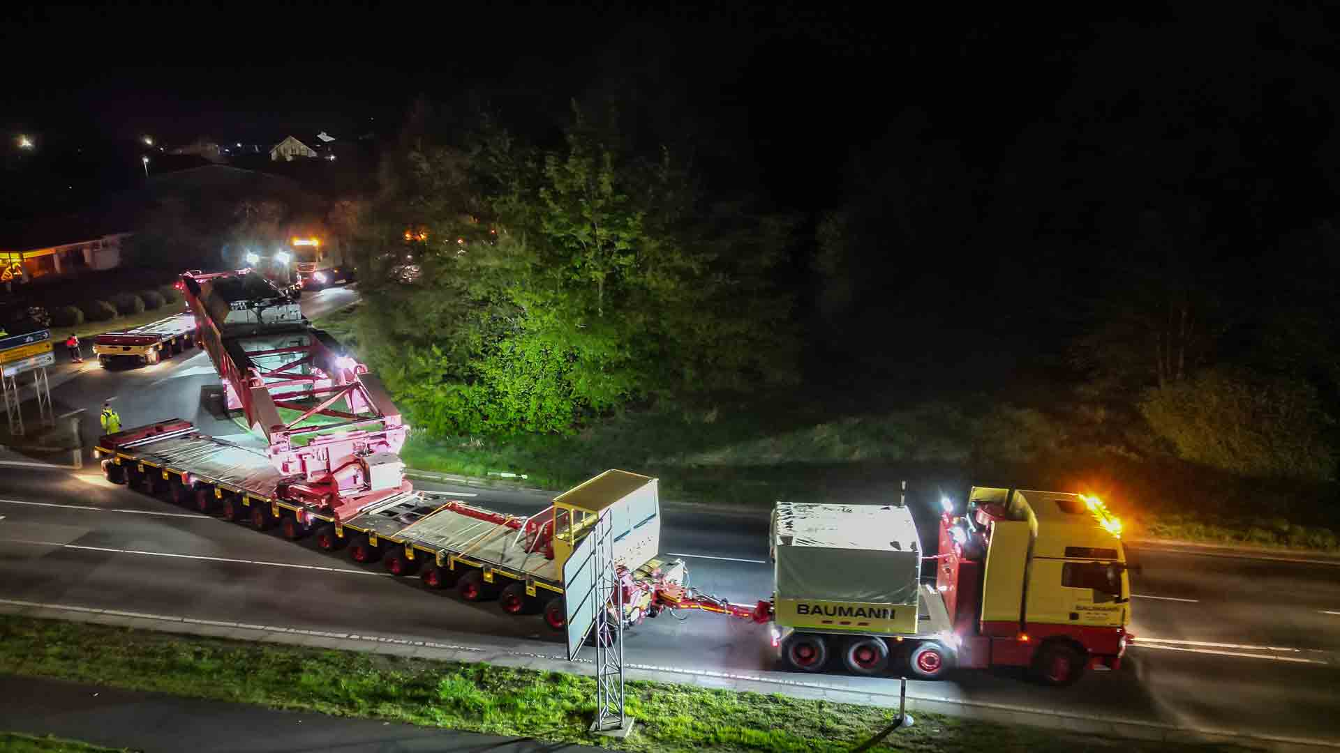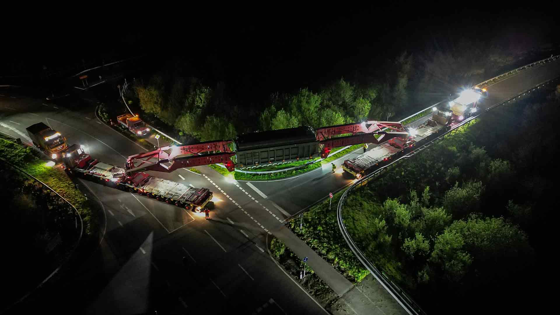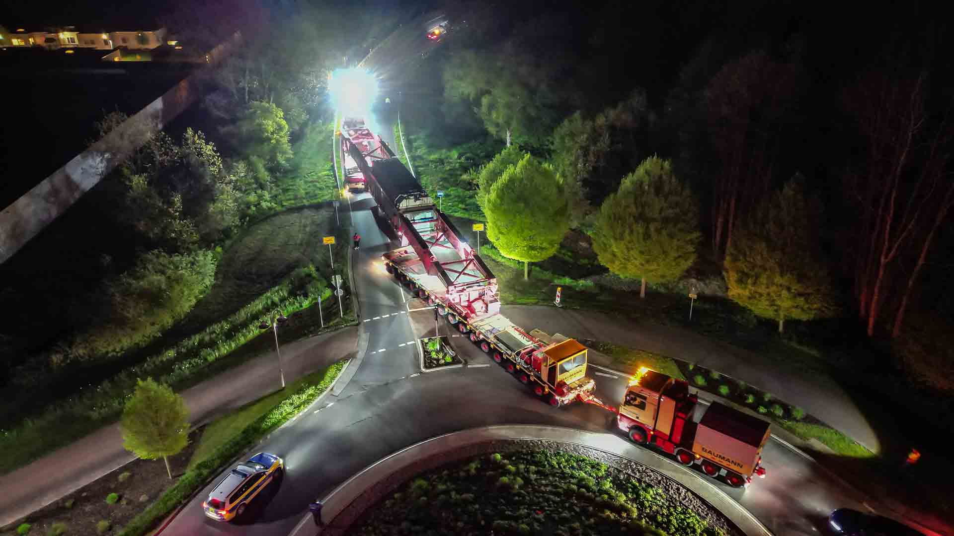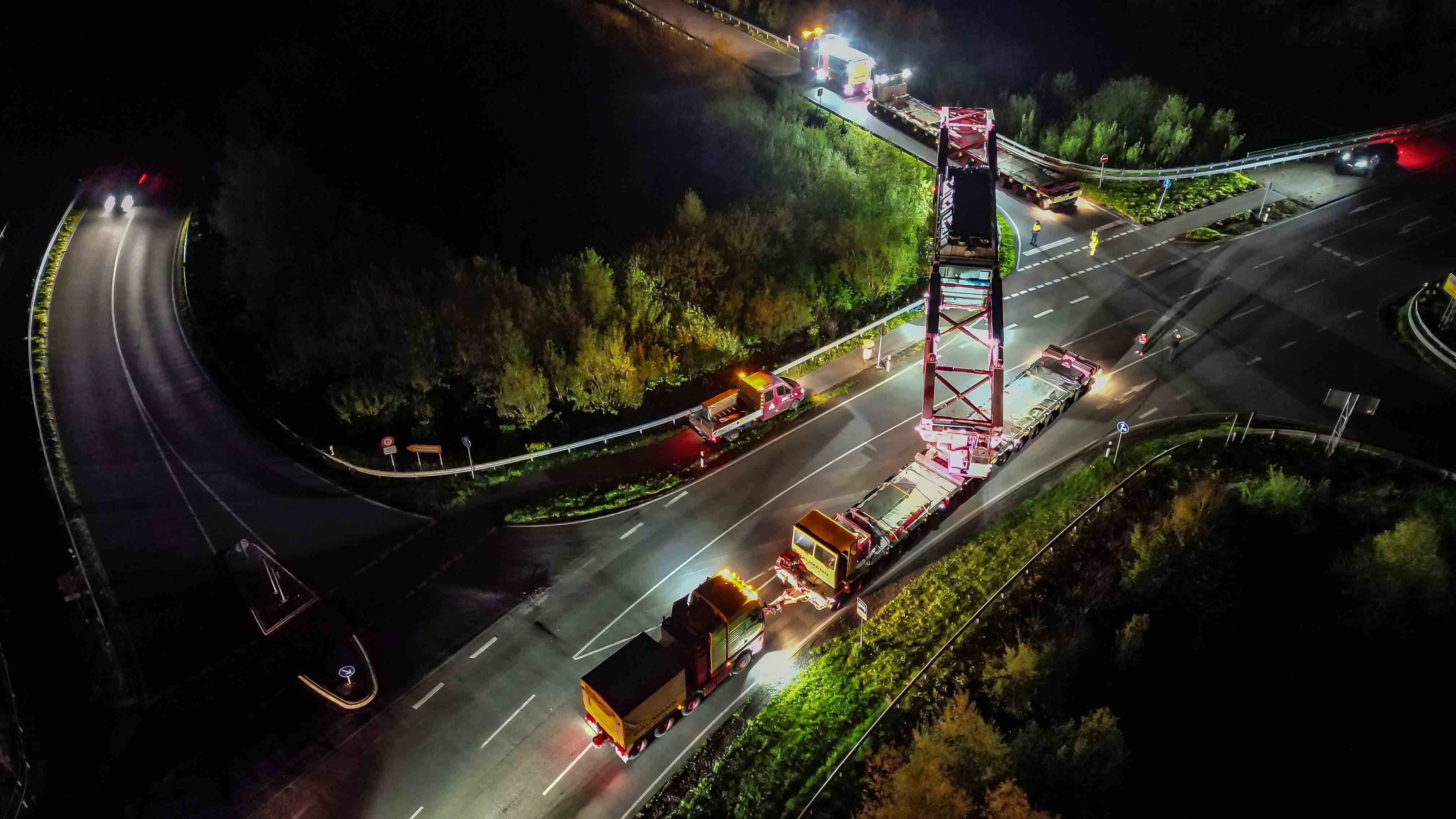 Im Emsland werden Schwertransporte nicht mehr von der Polizei begleitet. Hier übernehmen dies „Hilfspolizisten“, die für die Begleitung von Schwertransporten entsprechend ausgebildet sind. Unterstützt werden diese dabei von BF3-Fahrern. Pünktlich um 22:00 Uhr starten die Hilfspolizisten, um das erste, rund 1,5 Kilometer lange Teilstück der zweispurigen Friesoyther Straße für den Verkehr komplett zu sperren. Wenig später verlässt das lange Baumann-Gespann den c-Port Richtung Osten. Auf dem gesamten Streckenabschnitt gibt es keinerlei Straßenbeleuchtung. Auch der Kreuzungsbereich mit den Auf- und Abfahrten zur B72 ist komplett unbeleuchtet. Aus der Luft zeigt sich gut, dass das gesamte Gespann nicht nur die Trucks sondern die gesamte Umgebung taghell ausleuchtet. Für die Begleitcrew erleichtert die gute Sicht auf Ladung und mögliche Hindernisse das Einweisen und Vorwarnen der beiden Fahrer enorm. Hier muss im Normalfall niemand mit Taschenlampe in der Hand umherlaufen, um wirklich sicher zu sein, dass es keinen ungewollten Kontakt gibt.