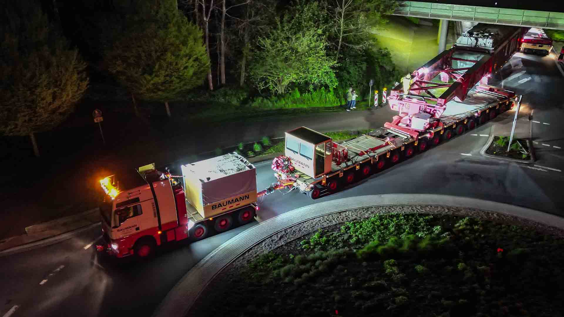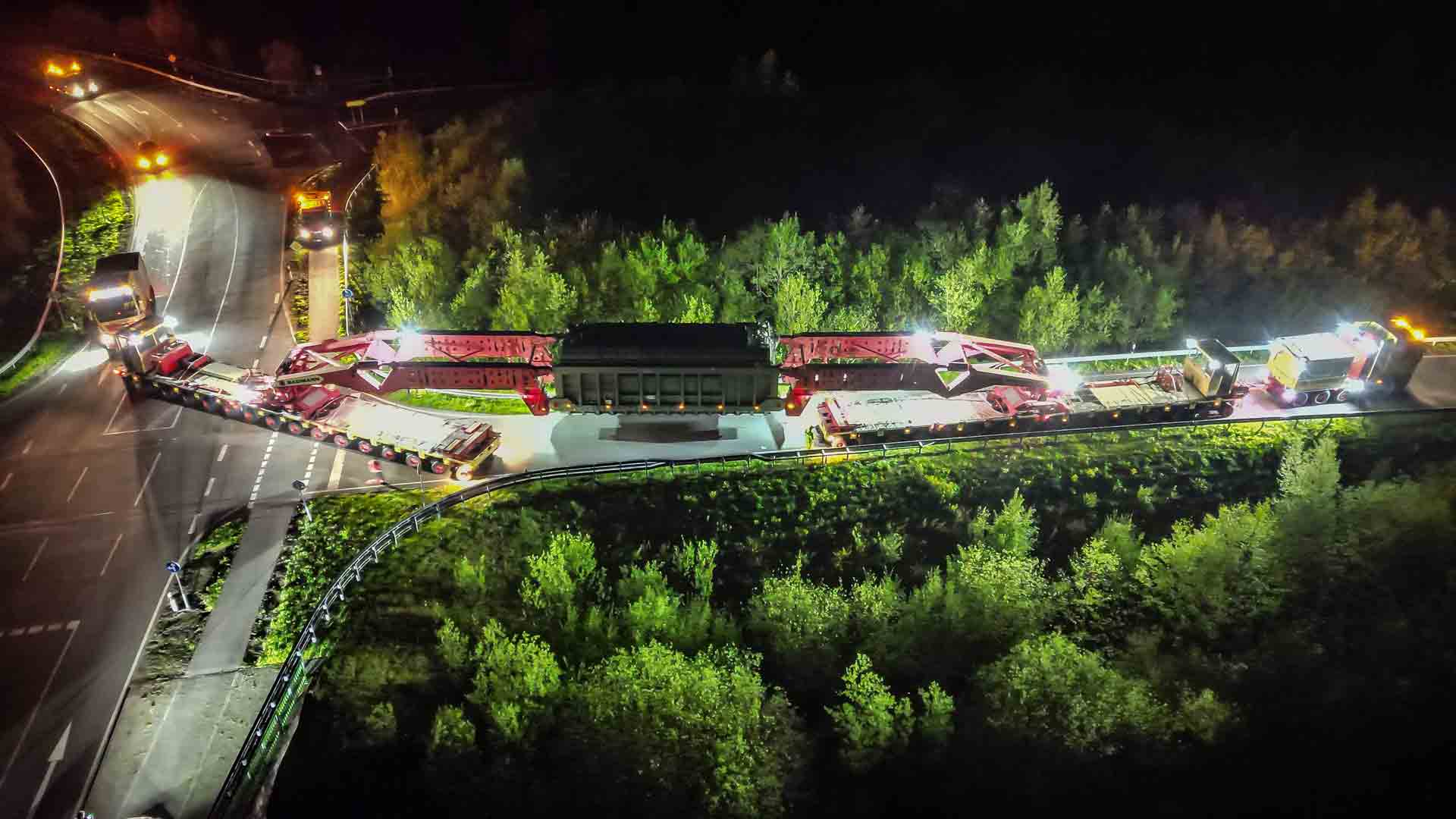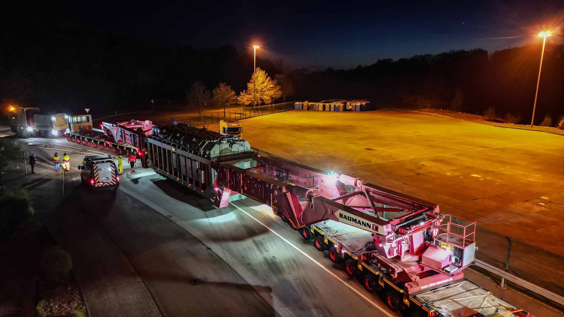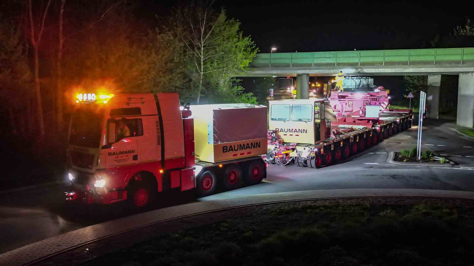 Im Emsland werden Schwertransporte nicht mehr von der Polizei begleitet. Hier übernehmen dies „Hilfspolizisten“, die für die Begleitung von Schwertransporten entsprechend ausgebildet sind. Unterstützt werden diese dabei von BF3-Fahrern. Pünktlich um 22:00 Uhr starten die Hilfspolizisten, um das erste, rund 1,5 Kilometer lange Teilstück der zweispurigen Friesoyther Straße für den Verkehr komplett zu sperren. Wenig später verlässt das lange Baumann-Gespann den c-Port Richtung Osten. Auf dem gesamten Streckenabschnitt gibt es keinerlei Straßenbeleuchtung. Auch der Kreuzungsbereich mit den Auf- und Abfahrten zur B72 ist komplett unbeleuchtet. Aus der Luft zeigt sich gut, dass das gesamte Gespann nicht nur die Trucks sondern die gesamte Umgebung taghell ausleuchtet. Für die Begleitcrew erleichtert die gute Sicht auf Ladung und mögliche Hindernisse das Einweisen und Vorwarnen der beiden Fahrer enorm. Hier muss im Normalfall niemand mit Taschenlampe in der Hand umherlaufen, um wirklich sicher zu sein, dass es keinen ungewollten Kontakt gibt.