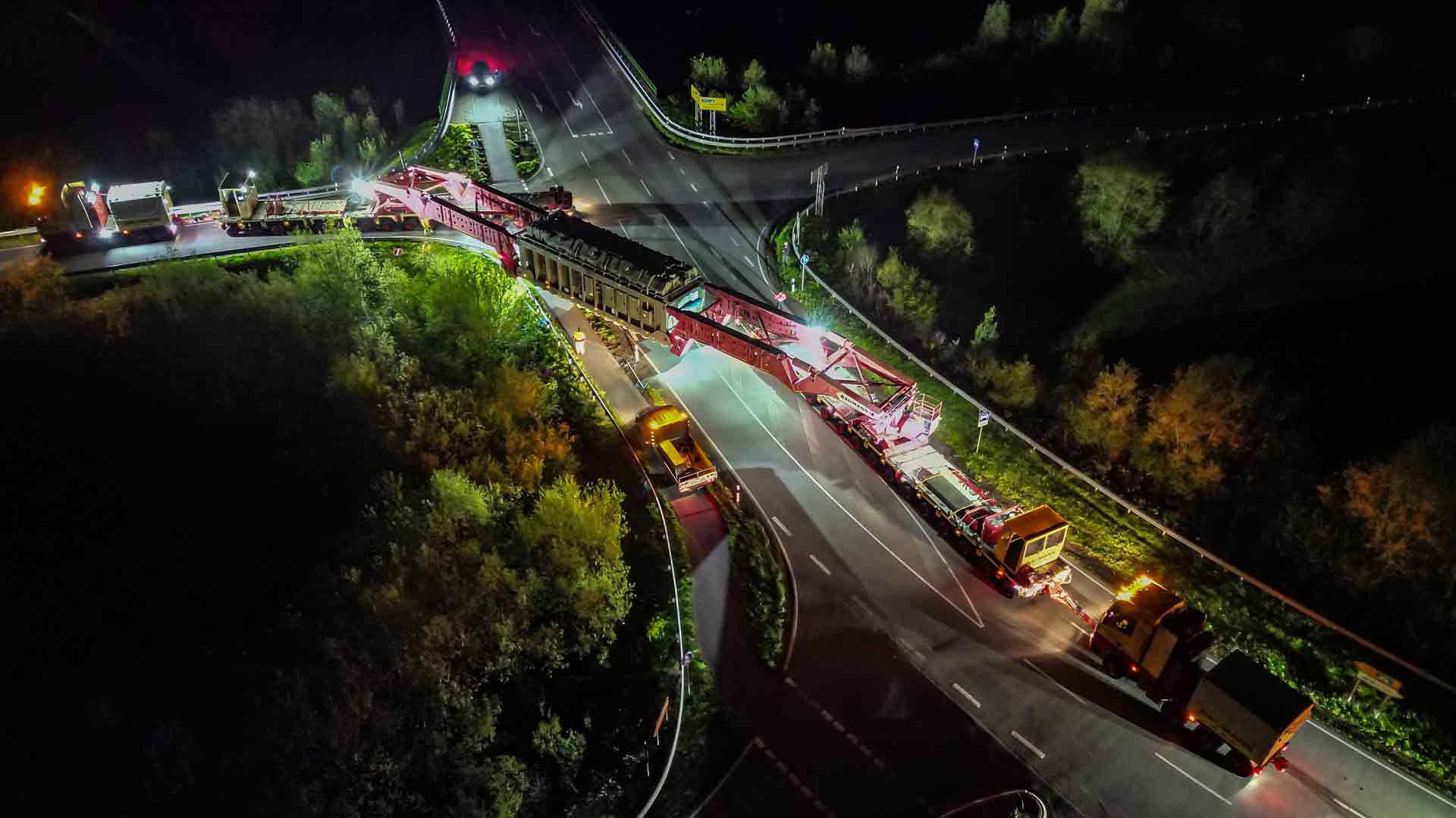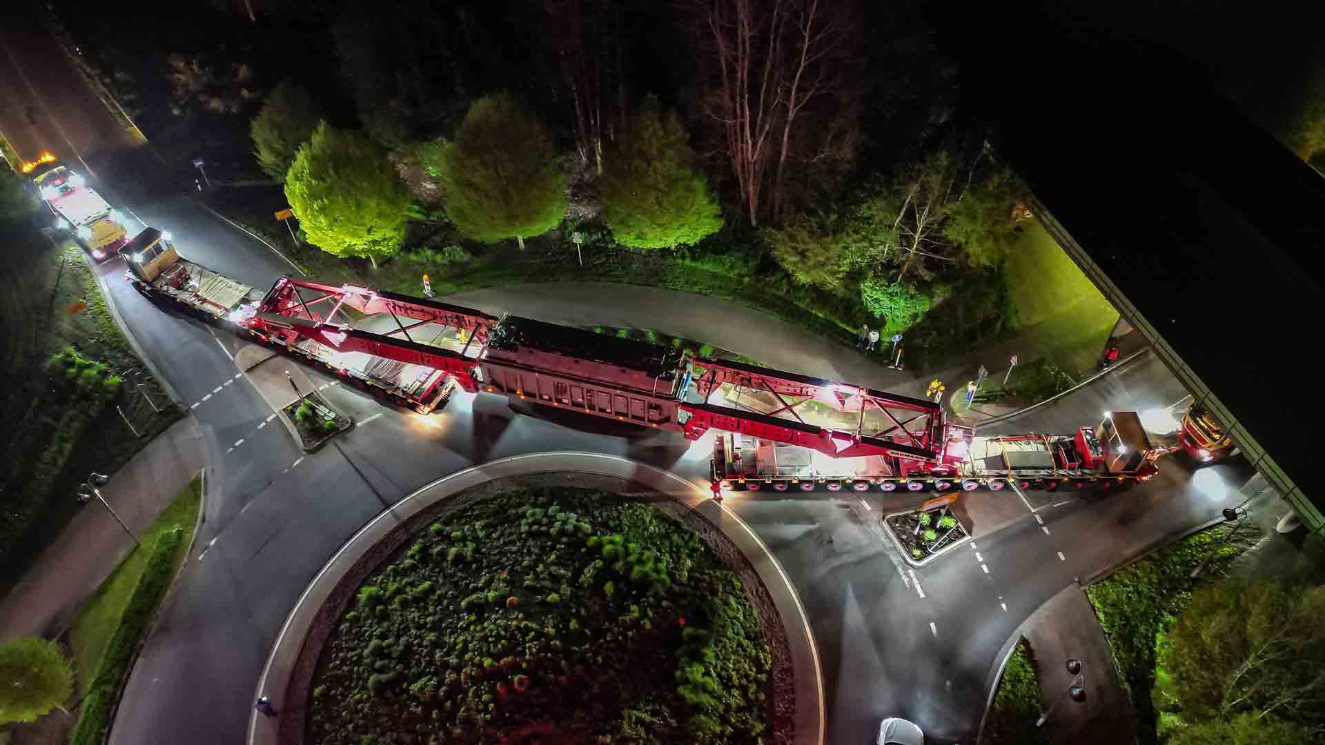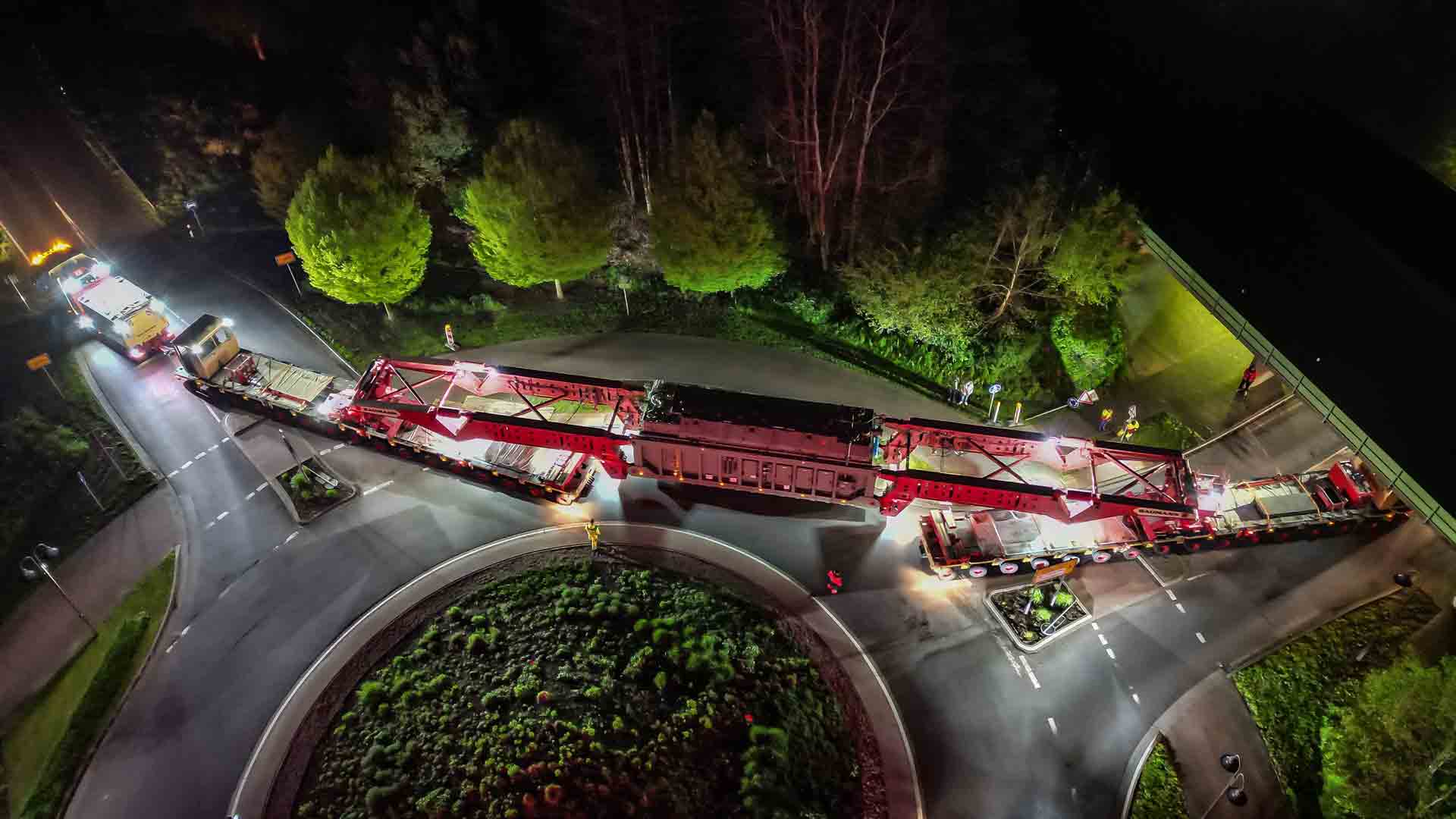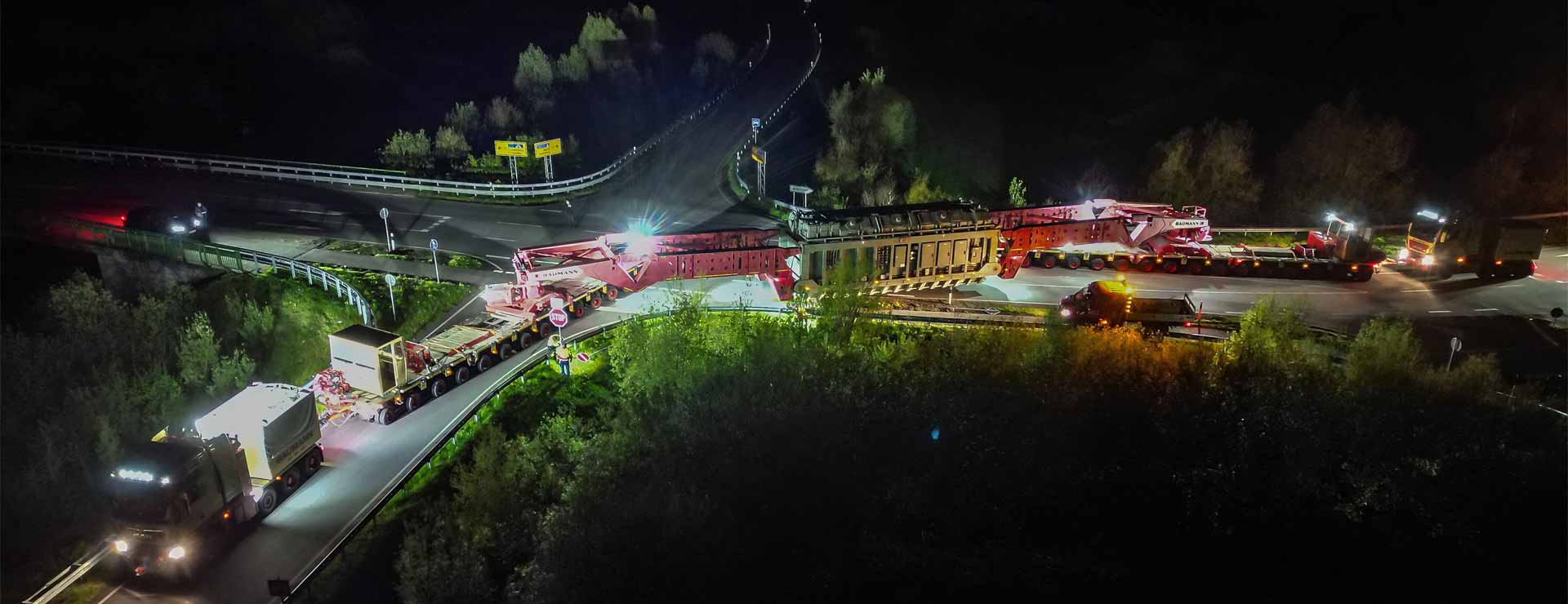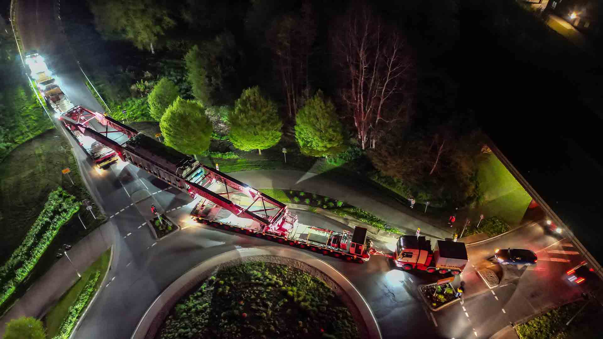 Im Emsland werden Schwertransporte nicht mehr von der Polizei begleitet. Hier übernehmen dies „Hilfspolizisten“, die für die Begleitung von Schwertransporten entsprechend ausgebildet sind. Unterstützt werden diese dabei von BF3-Fahrern. Pünktlich um 22:00 Uhr starten die Hilfspolizisten, um das erste, rund 1,5 Kilometer lange Teilstück der zweispurigen Friesoyther Straße für den Verkehr komplett zu sperren. Wenig später verlässt das lange Baumann-Gespann den c-Port Richtung Osten. Auf dem gesamten Streckenabschnitt gibt es keinerlei Straßenbeleuchtung. Auch der Kreuzungsbereich mit den Auf- und Abfahrten zur B72 ist komplett unbeleuchtet. Aus der Luft zeigt sich gut, dass das gesamte Gespann nicht nur die Trucks sondern die gesamte Umgebung taghell ausleuchtet. Für die Begleitcrew erleichtert die gute Sicht auf Ladung und mögliche Hindernisse das Einweisen und Vorwarnen der beiden Fahrer enorm. Hier muss im Normalfall niemand mit Taschenlampe in der Hand umherlaufen, um wirklich sicher zu sein, dass es keinen ungewollten Kontakt gibt.