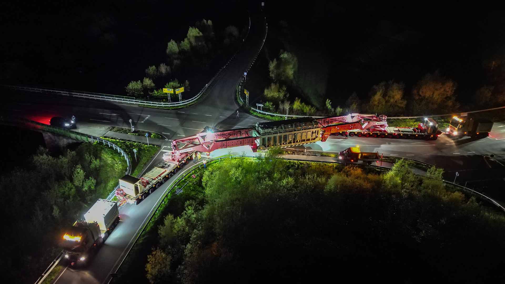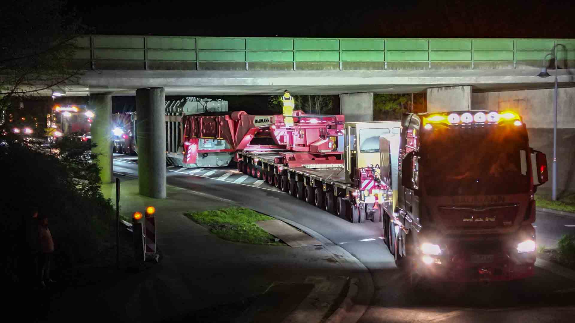 Um auf die B72 zu gelangen, kann der Schwertransport nicht die für alle anderen Verkehrsteilnehmer übliche Route über die Brücke, und dann drunter durch nehmen. Das hohe Gesamtgewicht macht eine Überquerung der Brücke unmöglich. Darum sperren die begleitenden Hilfspolizisten für einige Zeit die beiden Fahrspuren Richtung Westen und die Ausfahrt. Wenig später biegt der ziehende MAN TGX 41.640 entgegen der ausgeschilderten Fahrtrichtung auf die Ausfahrt und nutzt diese als Auffahrt zur B72. Dabei schwenkt die Kesselbrücke samt Trafo weit in den tieferliegenden Kurveninnenraum. In ganz langsamer Geschwindigkeit geht es über Leitplanke, Büsche und Bäume schwebend in die schmale Verbindungsstraße. Immer wieder stoppt das Gespann, denn teilweise müssen mehrere Kollegen zusammen einzelne Bäume zur Seite drücken. Das alles geschieht ganz ruhig und unaufgeregt, man hat zusammen schon ganz andere Herausforderungen gemeistert. Der hintere Anhänger wird vom zweiten Vierachser geschoben und dabei von einem hinterher gehenden „Baumann“ mit einer Funkfernbedienung sicher auf die Auffahrt gesteuert. Inzwischen haben die Hilfspolizisten die Bundesstraße komplett gesperrt, damit das Gespann auf die beiden richtigen Fahrbahnen übersetzen kann. Dann folgen rund 3,9 Kilometer flotte Fahrt bis zur nächsten gemeinsamen Aufgabe.