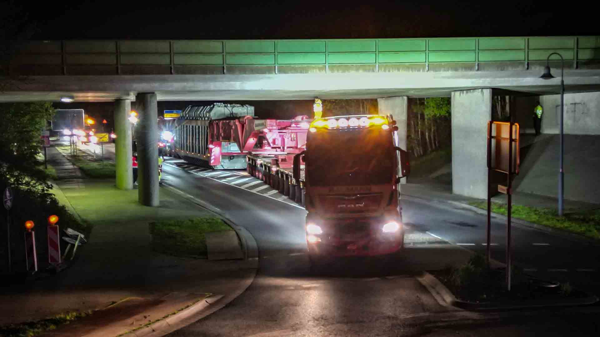 In Friesoythe angekommen gibt es das nächste Brückenproblem. Obwohl die Route noch etliche Kilometer auf der B72 vorsieht, muss der Transport nahe dem Ortskern abfahren. Die für andere Verkehrsteilnehmer gesperrte Ausfahrt wird in gewohnter Art genommen. Danach geht es Richtung Unterführung. Vor der Brücke sausen die Begleiter um die Ladung und messen mehrfach den Abstand zur Asphaltdecke und die Höhe, denn hier kommt es auf jeden Zentimeter an. Bei 4,58 Meter Ladungshöhe gibt es nur wenig Spielraum, um auf die andere Seite zu gelangen. Als alles richtig justiert und ausgerichtet ist, rollt das Gespann langsam unter die Brücke. Kurz bevor der Transformator unter der B72 verschwindet, schauen alle Begleiter nochmals genau hin, ob die Abstände wirklich überall passen. Nach dem „OK“ geben die Fahrer der beiden Vierachser vorsichtig Gas und rollen sehr langsam unter die Brücke der B72. Als die Ladung in der Mitte angekommen ist, hält das Gespann, um alles neu auszurichten. Als normaler Autofahrer spürt man Verschränkungen der Fahrbahn und denkt sich nichts dabei. Wenn sich dabei der minimal verfügbare Abstand zur Decke verändert, sieht das anders aus. Das Gefühl kennt wohl jeder von engen Einfahrten in Parkhäusern, wo teilweise seitlich und oben scheinbar nur wenige Zentimeter über ungewollte Lackabschürfungen entscheiden.