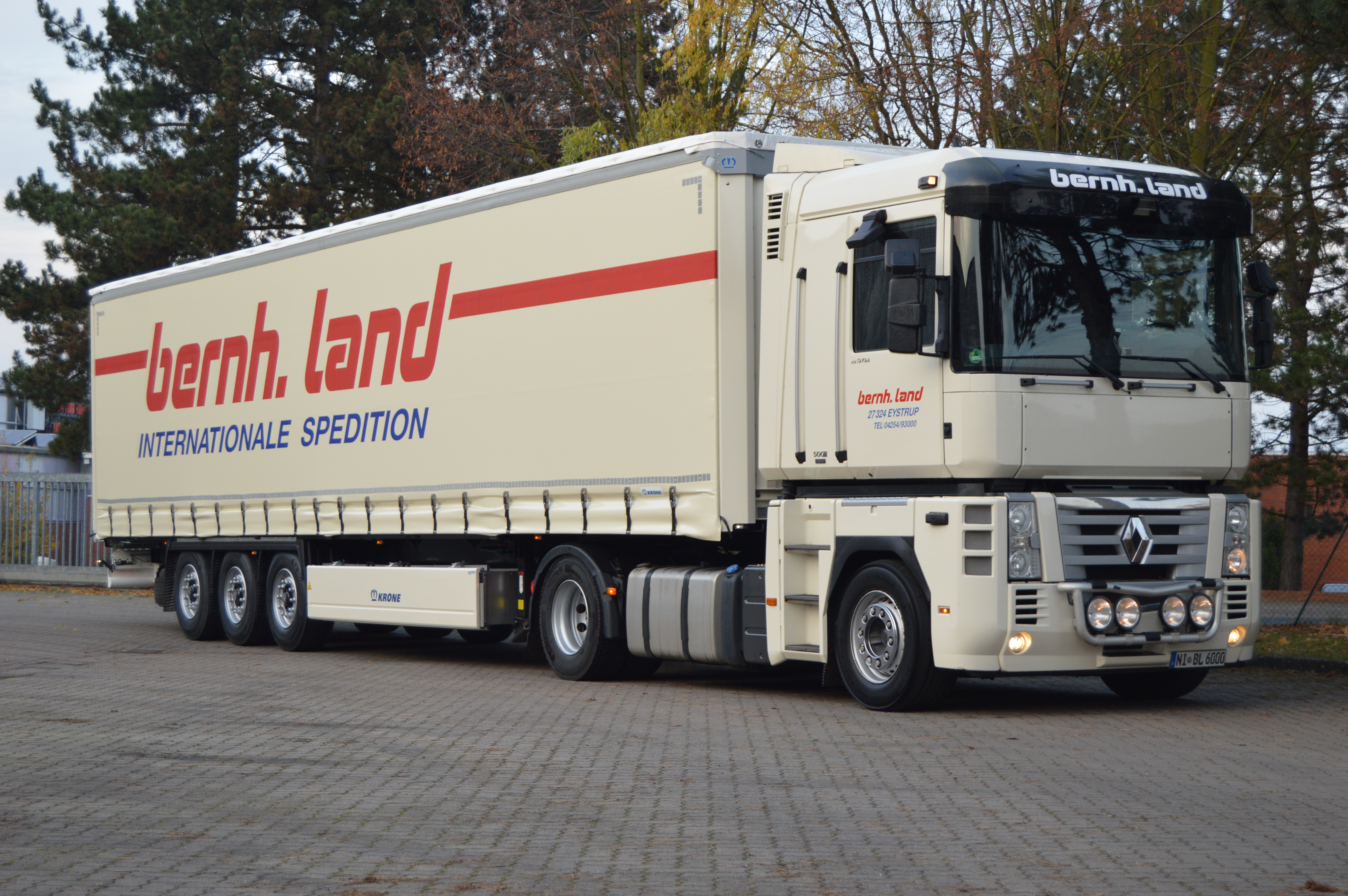 10. Renault Magnum ´08, perlweiß Hausfarben, „Spedition B. Land“ Krone Gardinenplanen-Auflieger – HCC Version ohne Palettenkastenbedruckung