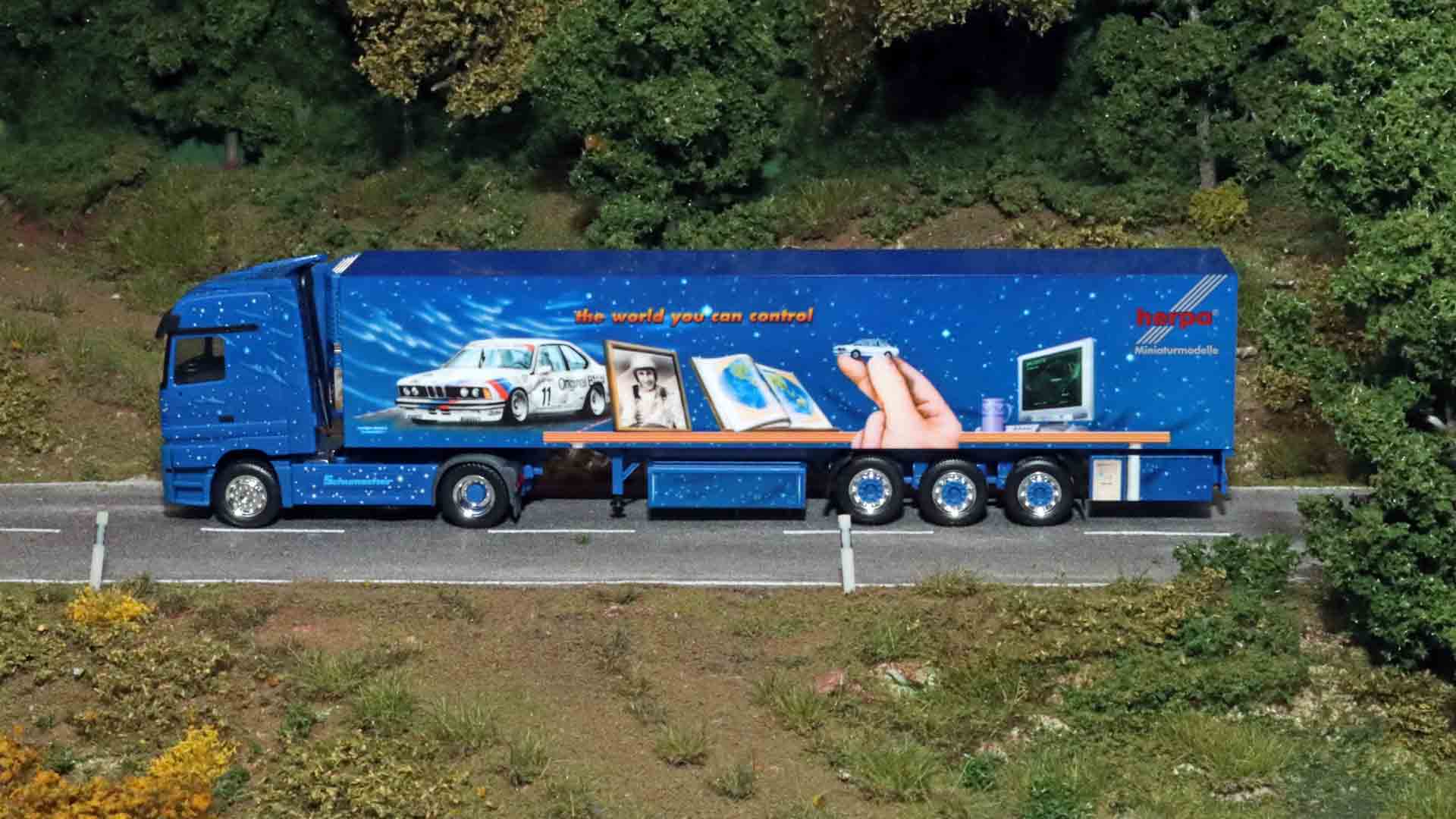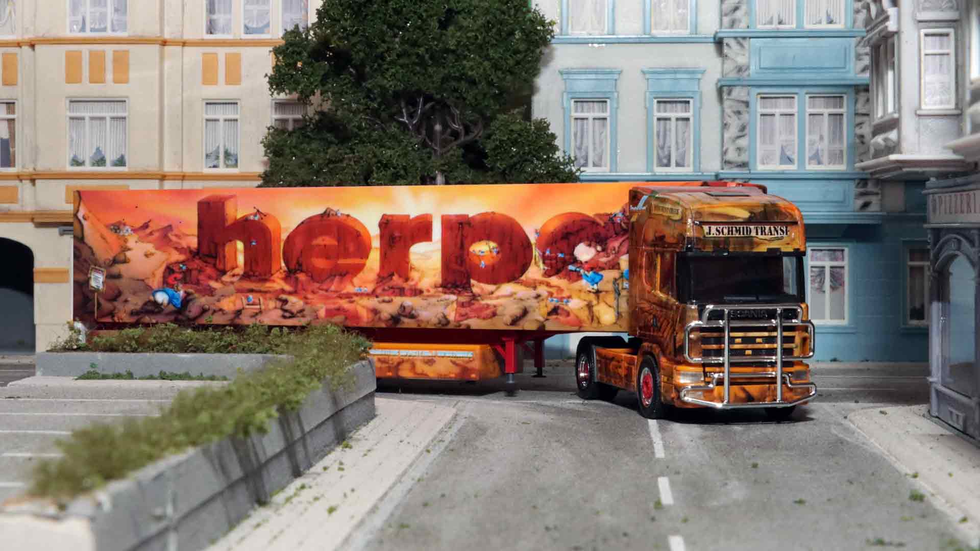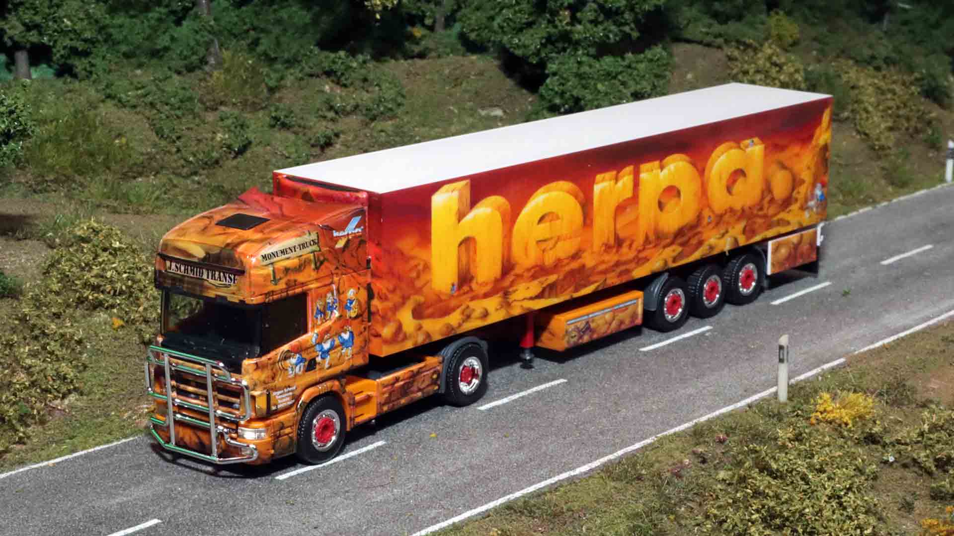 Zusammen mit Airbrush-Künstlern verwirklicht Herpa immer wieder auch originale Show-Trucks, von denen es selbstverständlich Modelle gibt. Peter Littger entwirft einen Airbrush-Lkw mit einem BMW, Computer, und Flugzeug als Motiv. „Das wird quasi der erste Showtruck von Herpa“, erzählt der ehemalige Produktmanager Matthias Wolff. „In der Folge entsteht dann die Idee, mit dem Airbrush-Künstler Walter Rosner einen Lkw zu kreieren. So entsteht der Monument-Truck.“ Auf diesem sind insgesamt 43 Zwerge zu sehen, übrigens zwei der Zwerge auf der Zugmaschine sind die beiden damaligen Geschäftsführer Claus und Dieter Wagener. In der Folge entsteht die Serie „Geschichte der Menschheit“ mit Rosner-Motiven. Insgesamt 15 unterschiedliche Lkw gibt es zu Themen, wie Kreuzzüge, Goldrausch, Wikinger, Weltmeere oder Raumfahrt. Der dritte Truck „Die sieben Weltwunder“ erscheint sogar dreimal, nachdem im Original die Zugmaschine getauscht wird. Die Modelle sind so aufwendig gestaltet, dass sie heute nicht mehr realisierbar wären, dadurch sind die damaligen Modelle noch heute sehr wertvoll.