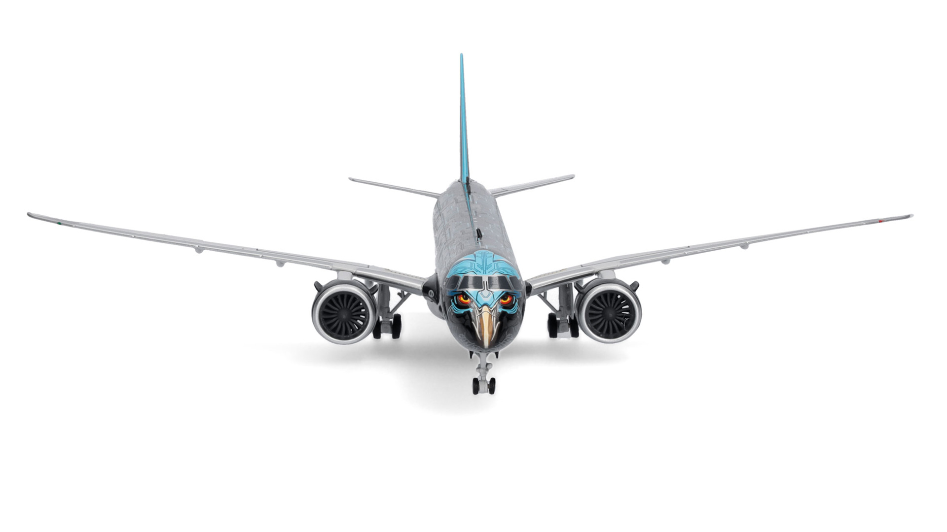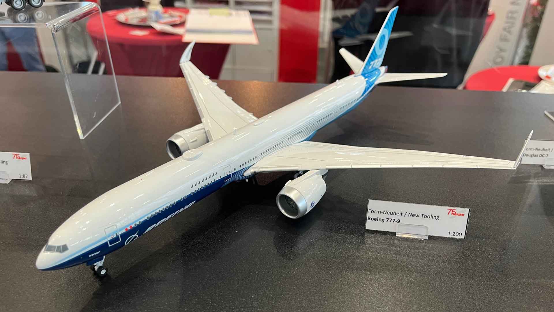 Gigantisch ist auch die 777-9, das neue Flaggschiff von Boeing. Wenn es ab 2025 ausgeliefert wird, ist es das längste Passagierflugzeug der Welt, sogar länger als die 747-8. Die beachtliche Spannweite des Originals zeigt sich auch im Maßstab 1:200, hier sind es fast 36 cm. Da die Tragflächen beim Original für viele Flughäfen zu groß sind, kann man die Enden hochklappen. Das wird auch im Modell möglich sein.