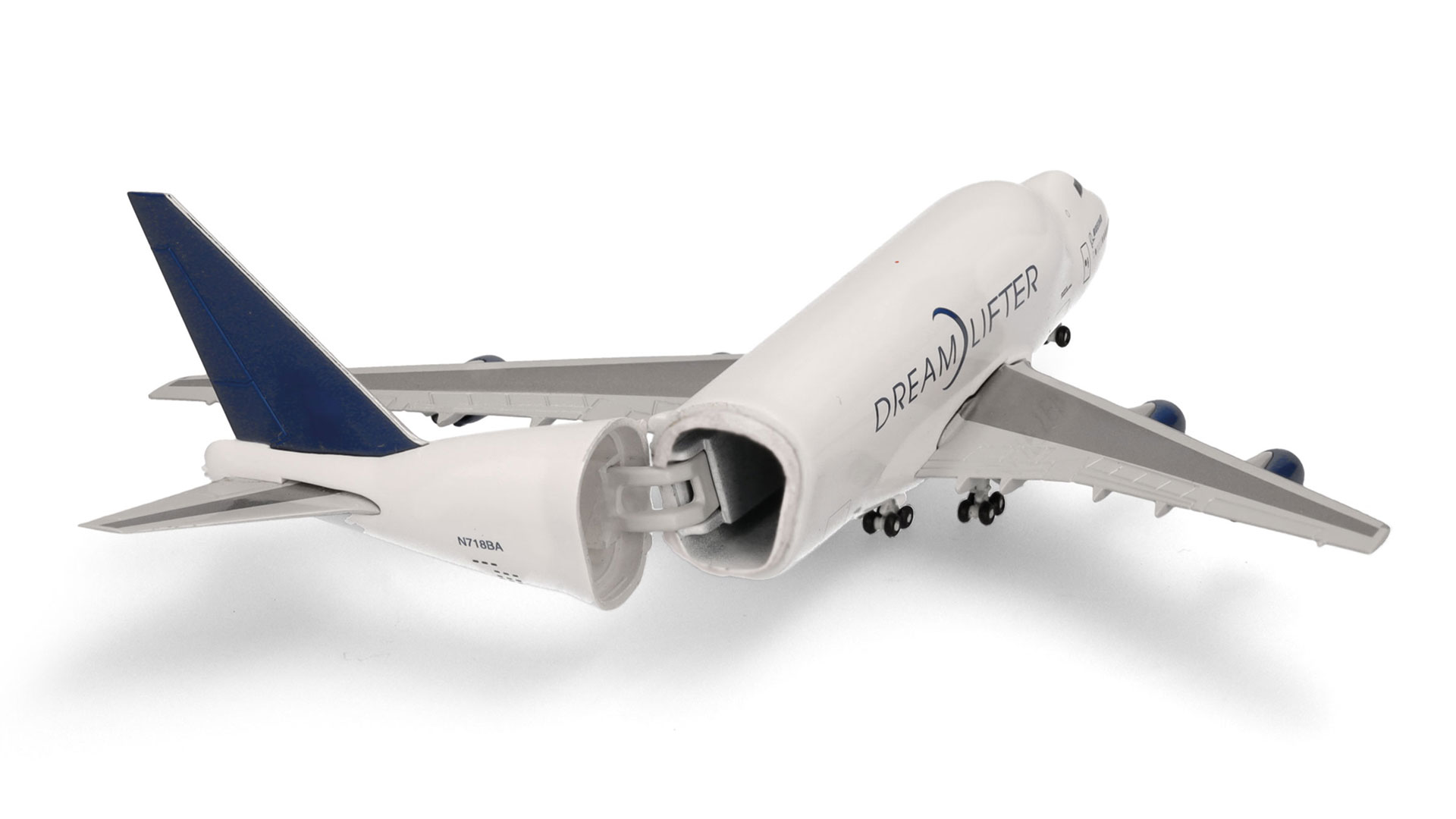 Der „Dreamlifter“ von Boeing gilt als das Gegenstück zur „BelugaXL“ des europäischen Herstellers Airbus. Als Formneuheit bring Herpa zur Spielwarenmesse das Modell in 1:500 heraus. Natürlich kann das Modell wahlweise mit zur Seite geschwenktem Heck oder geschlossen präsentiert werden.