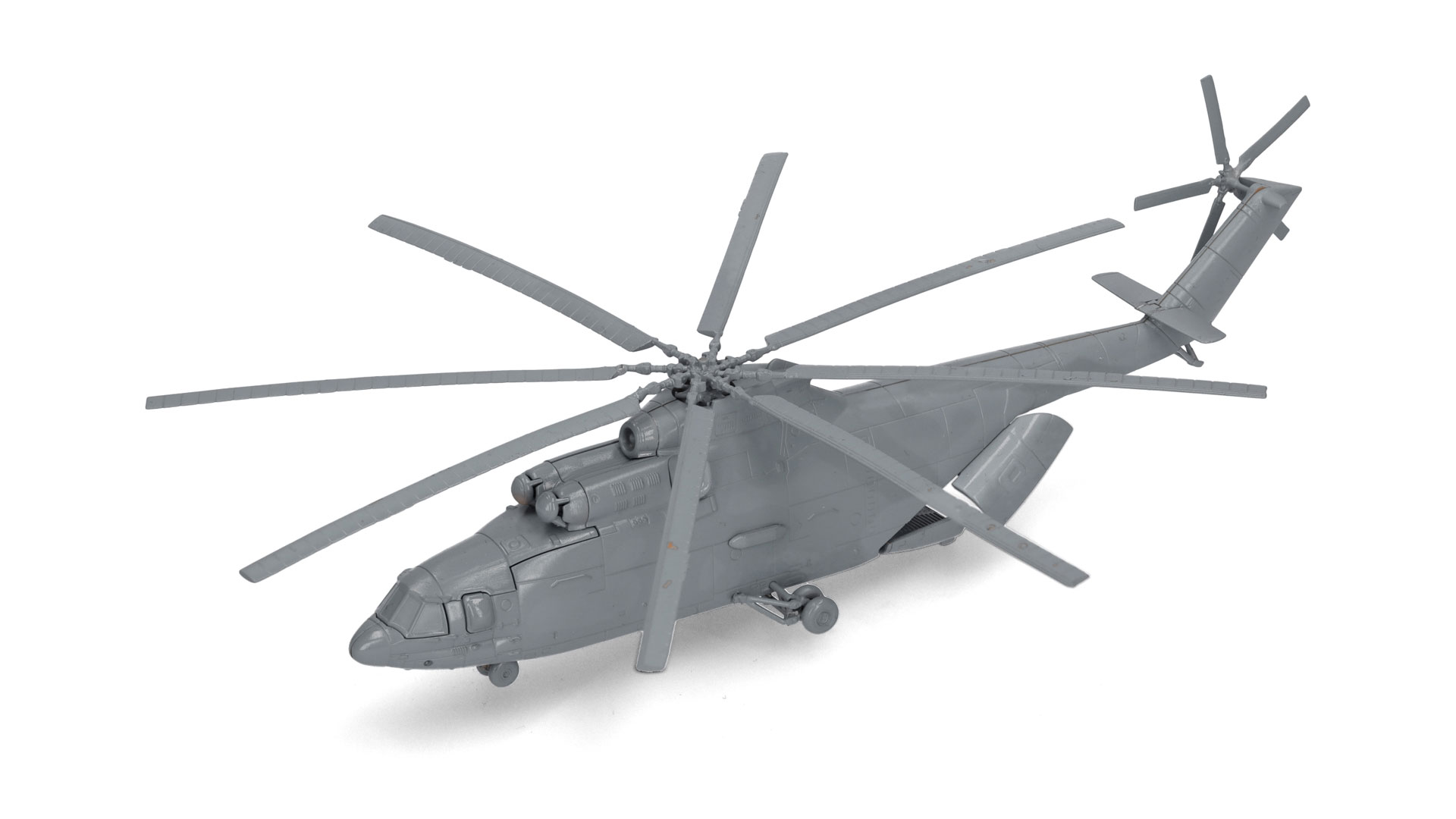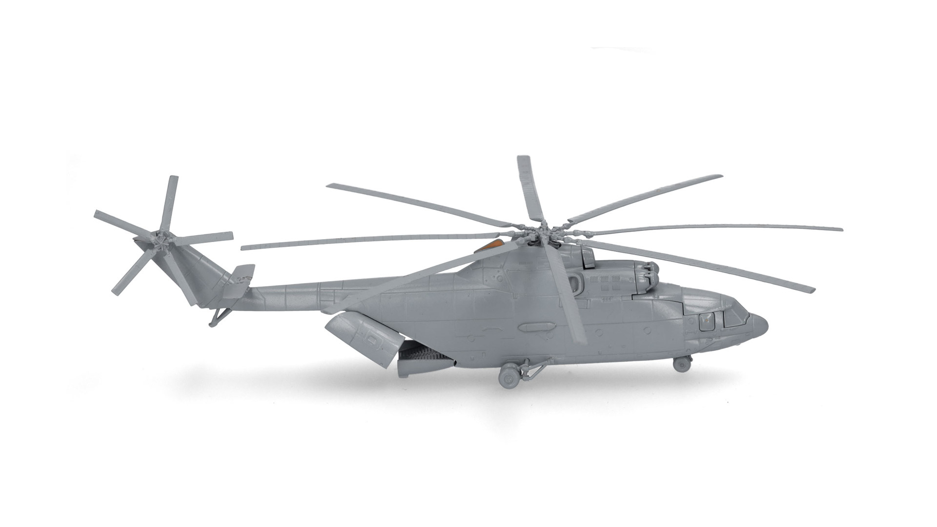 Ebenfalls ein Gigant ist der Mil Mi-26, der größte Hubschrauber der Welt. Noch in Sowjet-Zeiten 1977 entwickelt, wird er immer noch produziert und ist weltweit im Einsatz. Mit seiner Traglast von 20 Tonnen ist er quasi alternativlos. Es ist der größte in Serie produzierte Hubschrauber. Dieses Metallmodell im Maßstab 1:200 kann ebenfalls mit geöffnetem oder geschlossenem Frachttor am Heck dargestellt werden.