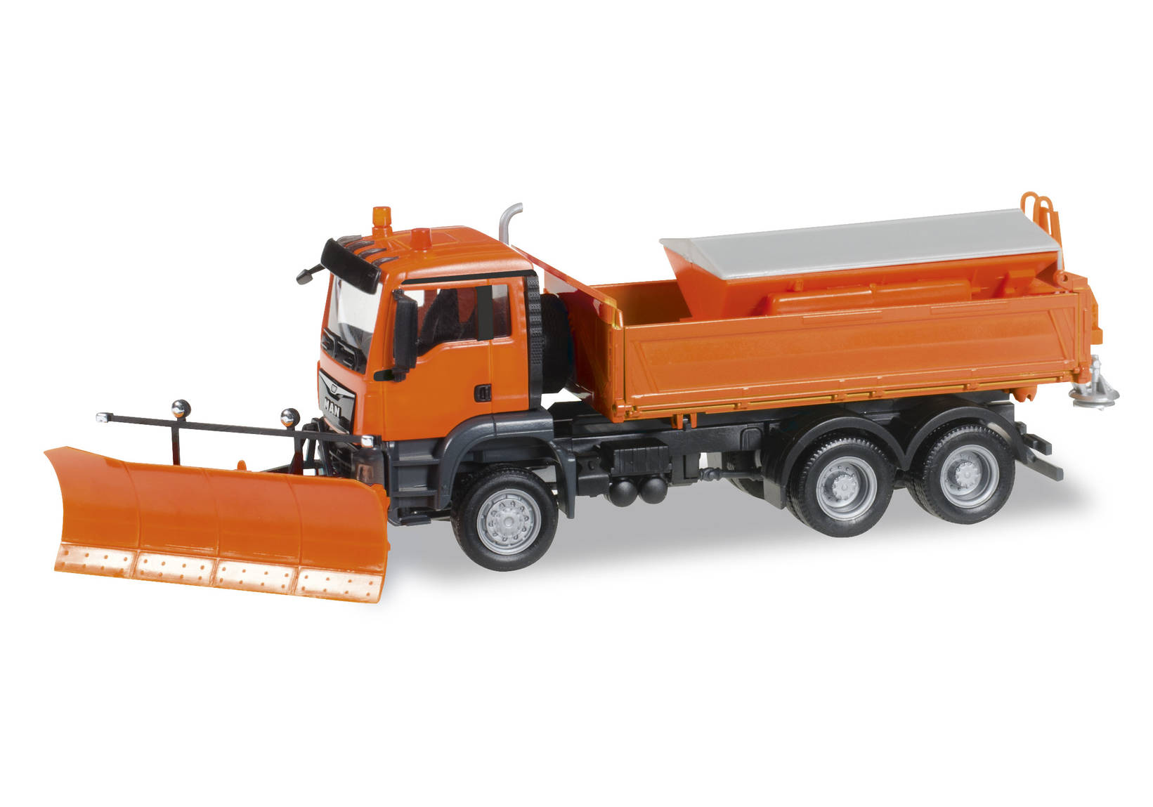Formneuheit! Mit neuem Euro 6 Fahrgestell erscheint der aktuelle MAN TGS M als 6x6 Kipper mit Winterdienstaufbau und Räumschild an der Front. Auch als Zubehör für die Modellbahn geeignet.