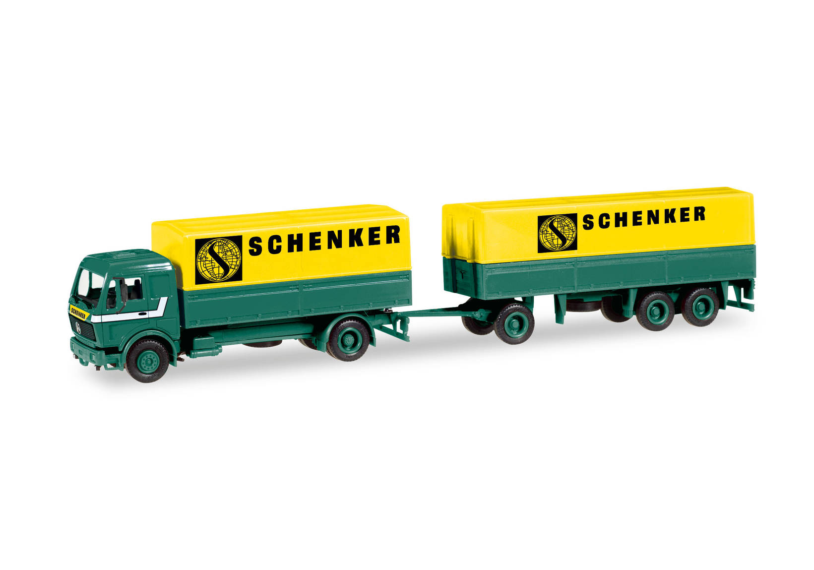In der klassischen Farbgebung der 1980er Jahre legt Herpa den Mercedes-Benz Planen-Hängerzug zeitgemäß, ohne seitlichen Unterfahrschutz einmalig auf. Parallel dazu werden auch LKW und Hänger, jeweils mit dem Schenker-Logo bedruckt, einzeln als Minikit angeboten.